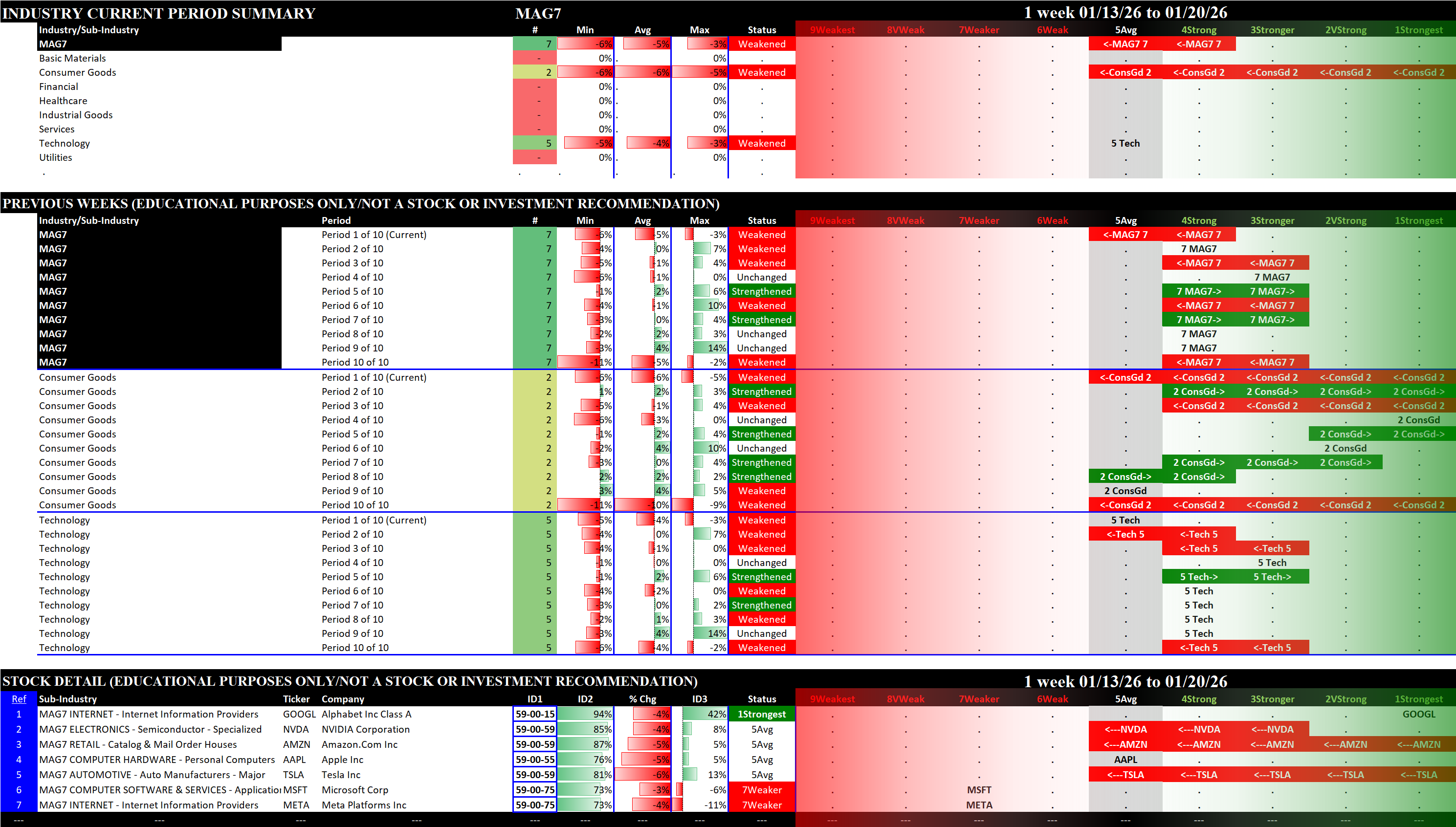 This post shows strengthening/weakening detail for this week for the S&P 500, Nasdaq 100, the Philadelphia Semiconductor Index (SOX), and the so-called Magnificent 7 stocks (MAG7).