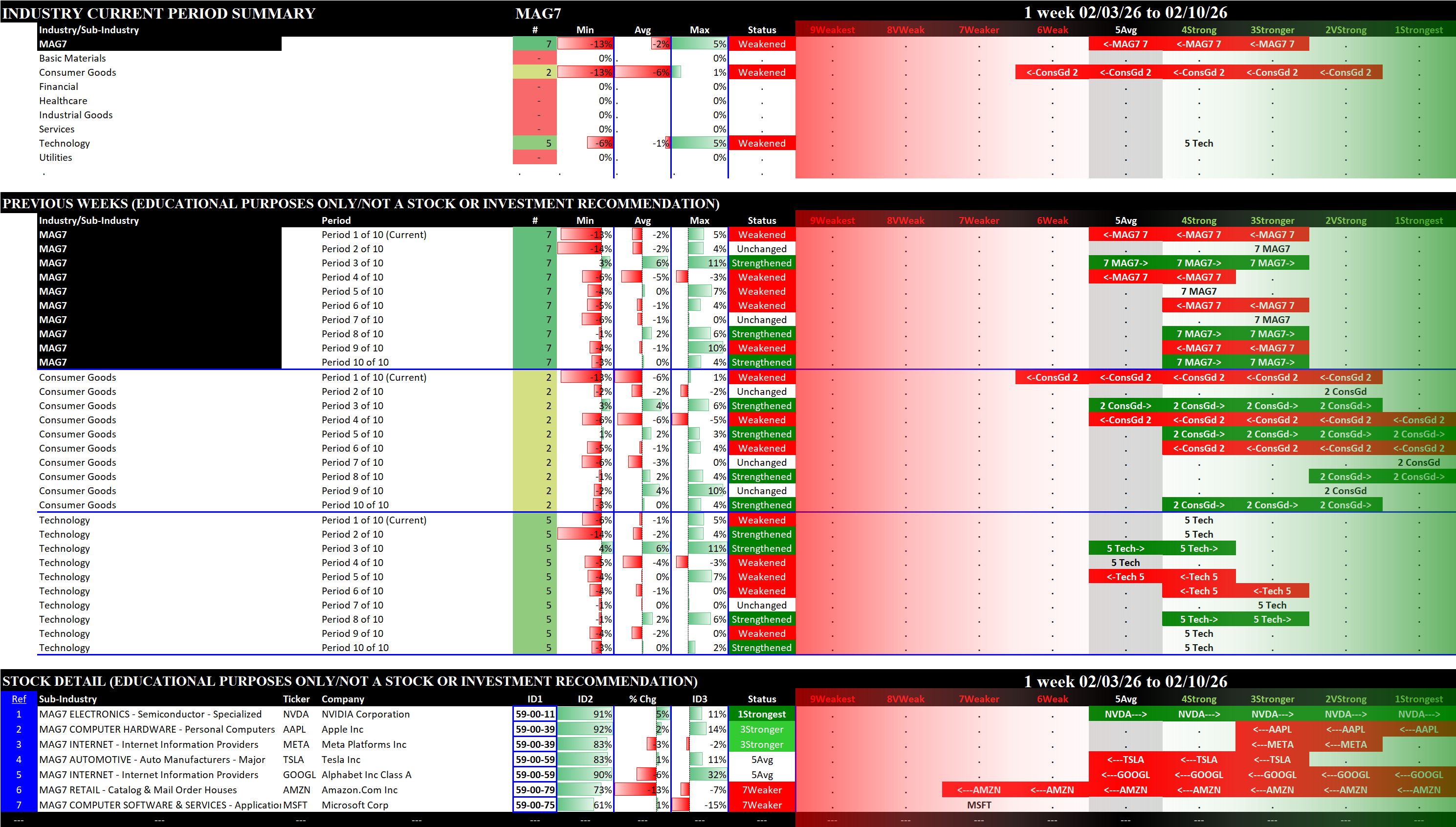 This post shows strengthening/weakening detail for this week for the S&P 500, Nasdaq 100, the Philadelphia Semiconductor Index (SOX), and the so-called Magnificent 7 stocks (MAG7).