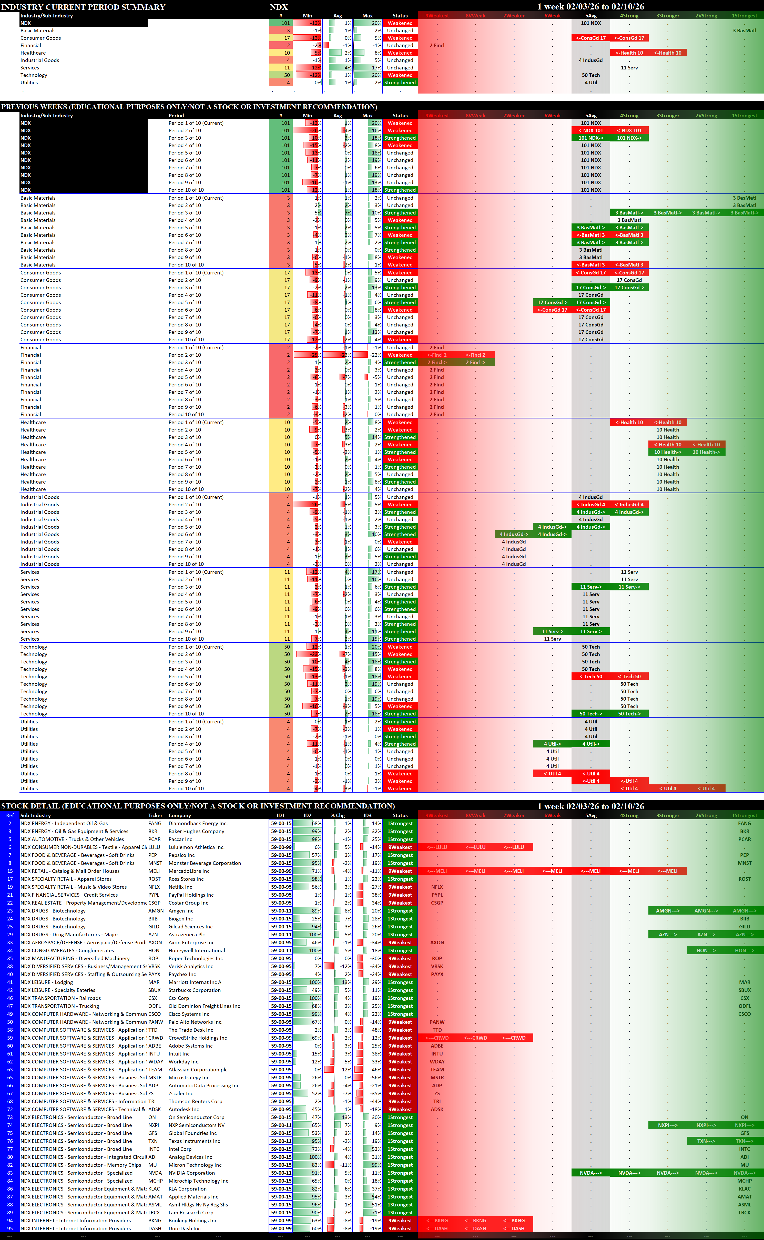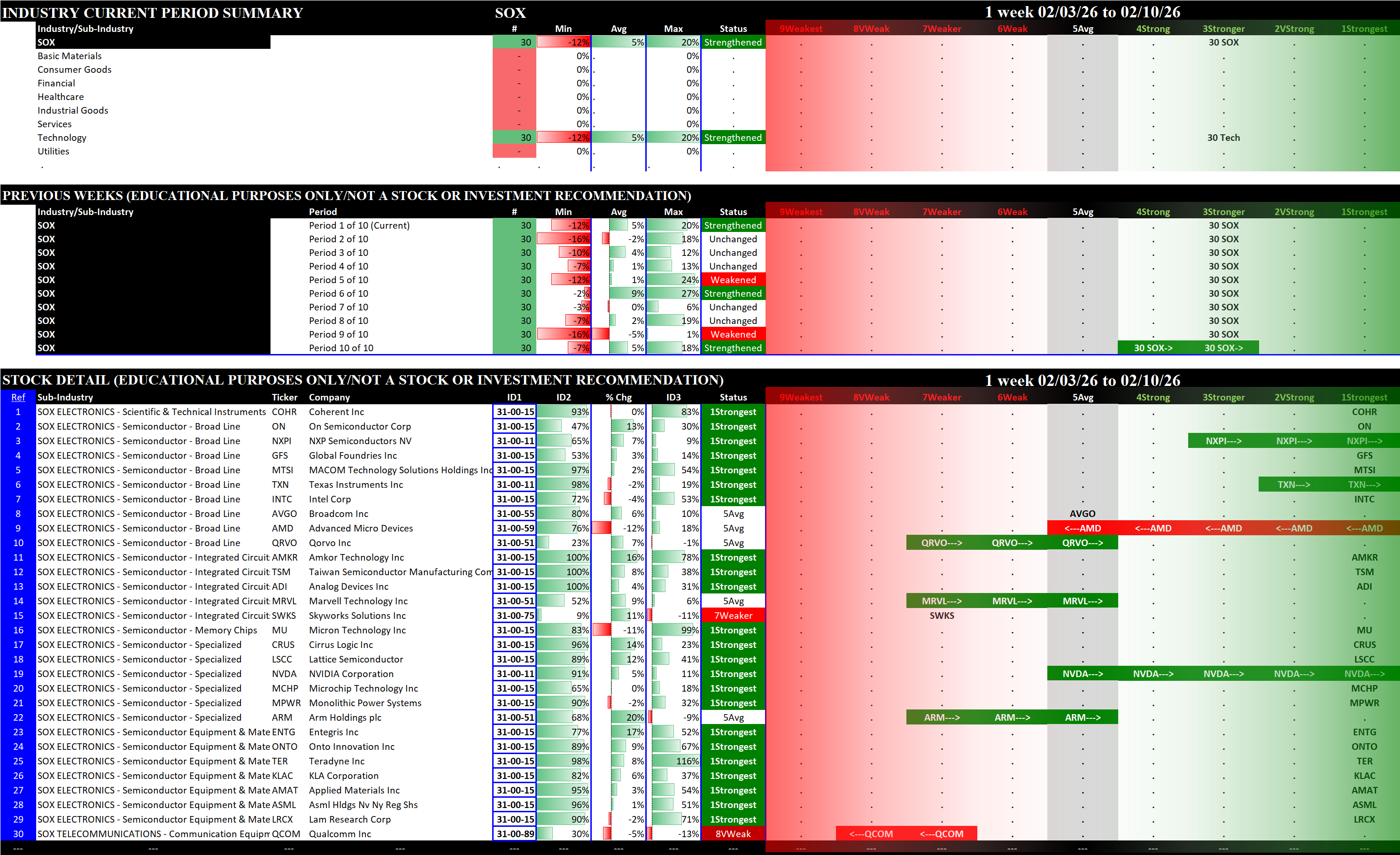 Indexes Tue 2026-02-10: Strengthened/0 SOX (3Stronger); Unchanged SP500 (4Strong); Weakened/0 NDX (5Average); Weakened/-2 MAG7 (5Average)