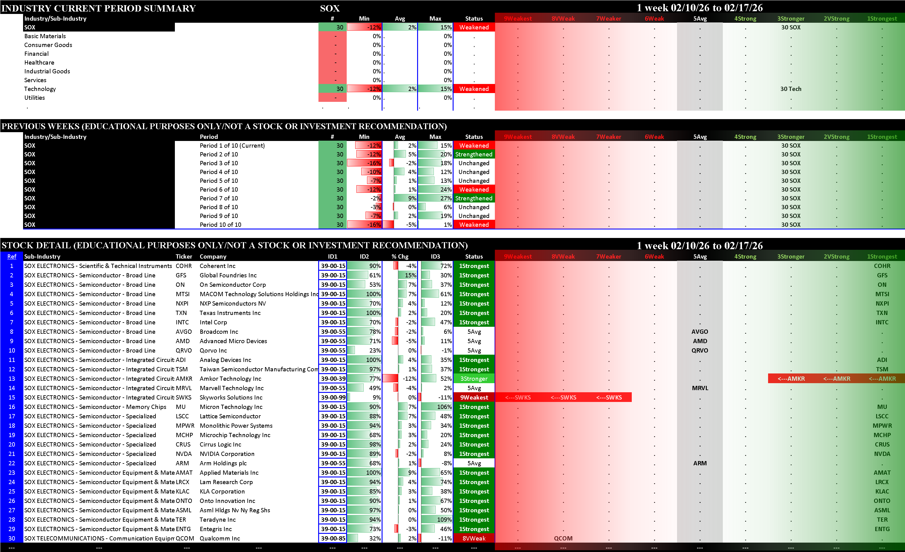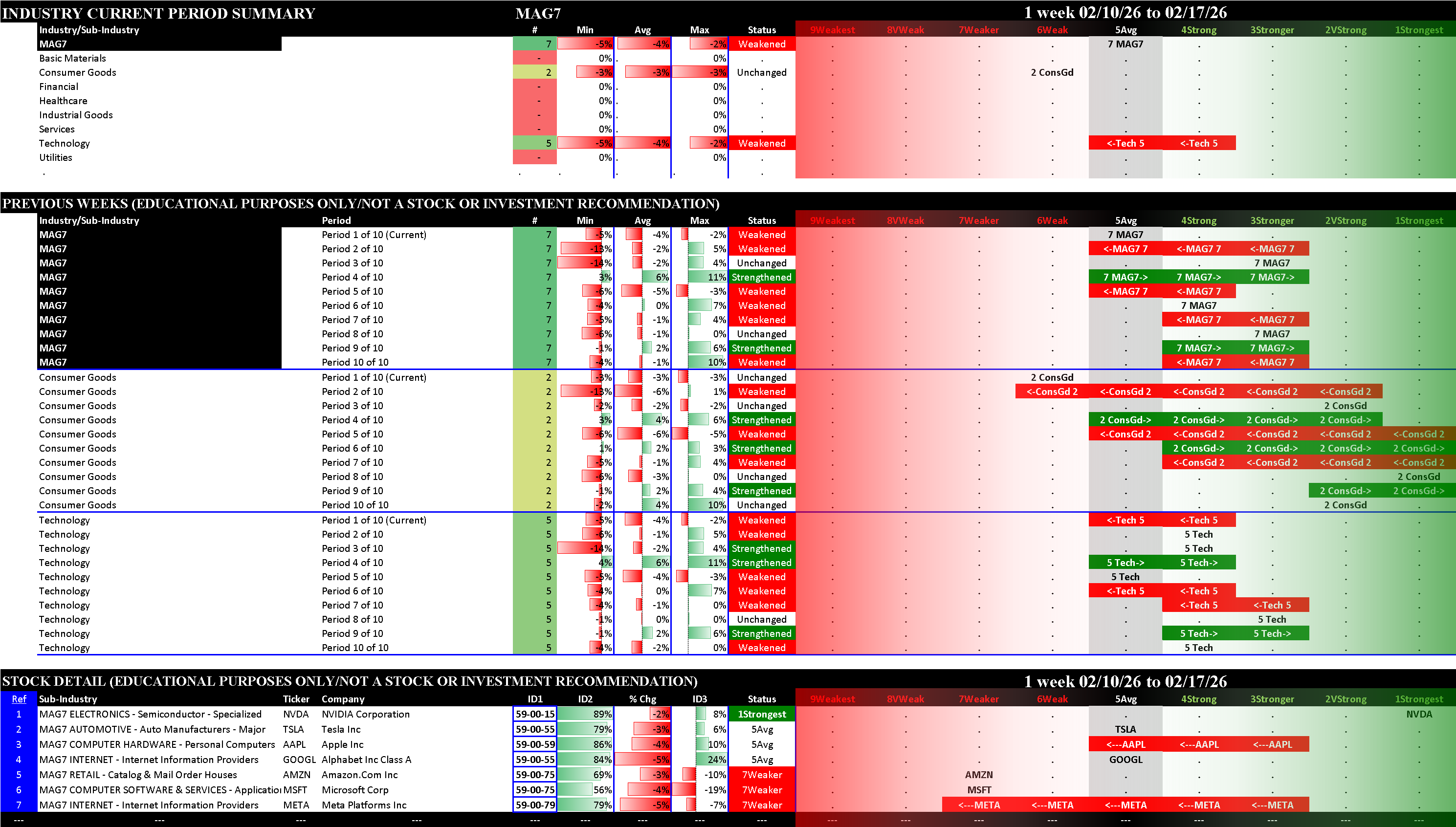This post shows strengthening/weakening detail for this week for the S&P 500, Nasdaq 100, the Philadelphia Semiconductor Index (SOX), and the so-called Magnificent 7 stocks (MAG7).