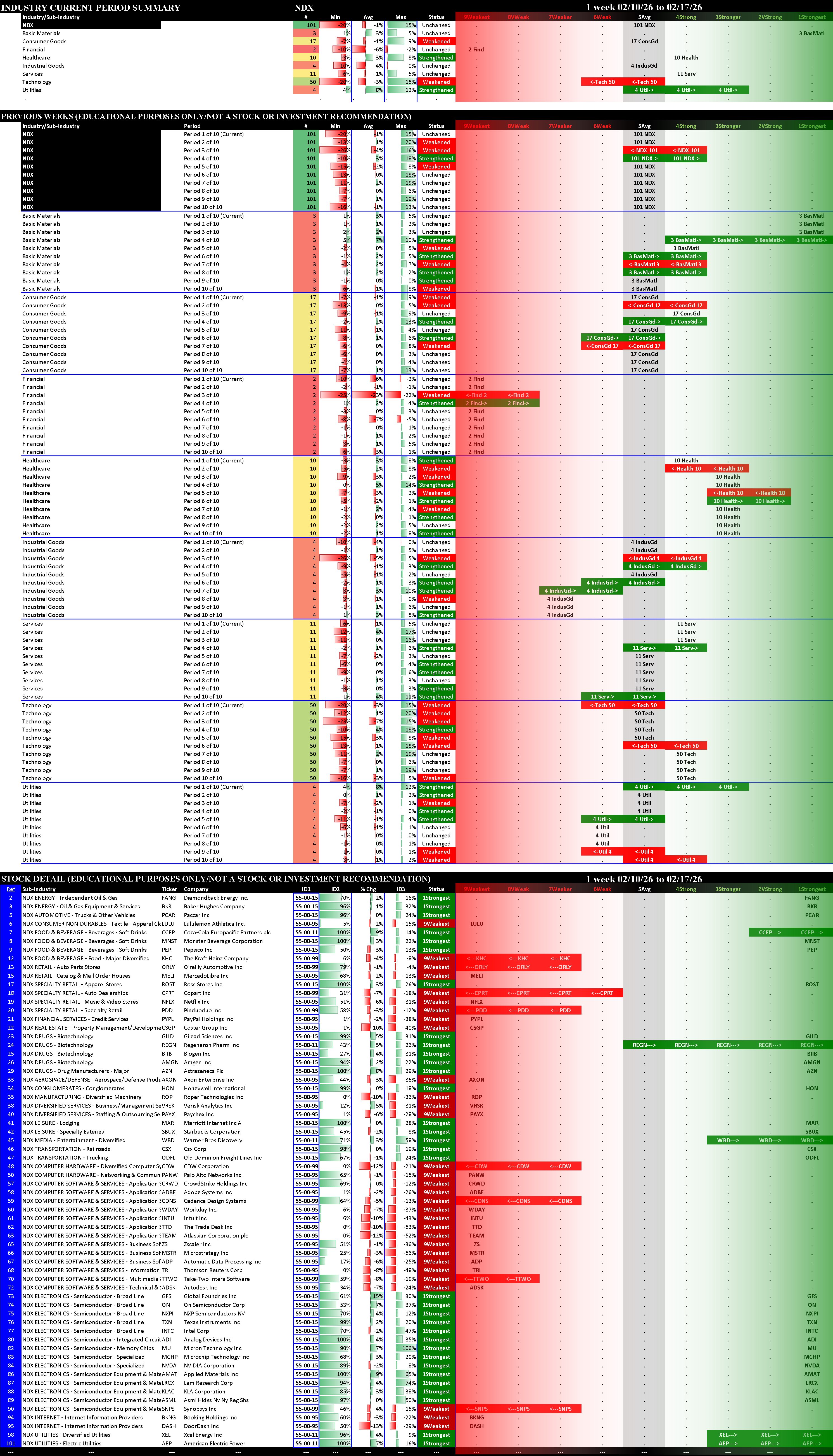 Indexes Tue 2026-02-17: Unchanged SP500 (4Strong), NDX (5Average); Weakened/0 SOX (3Stronger), MAG7 (5Average)