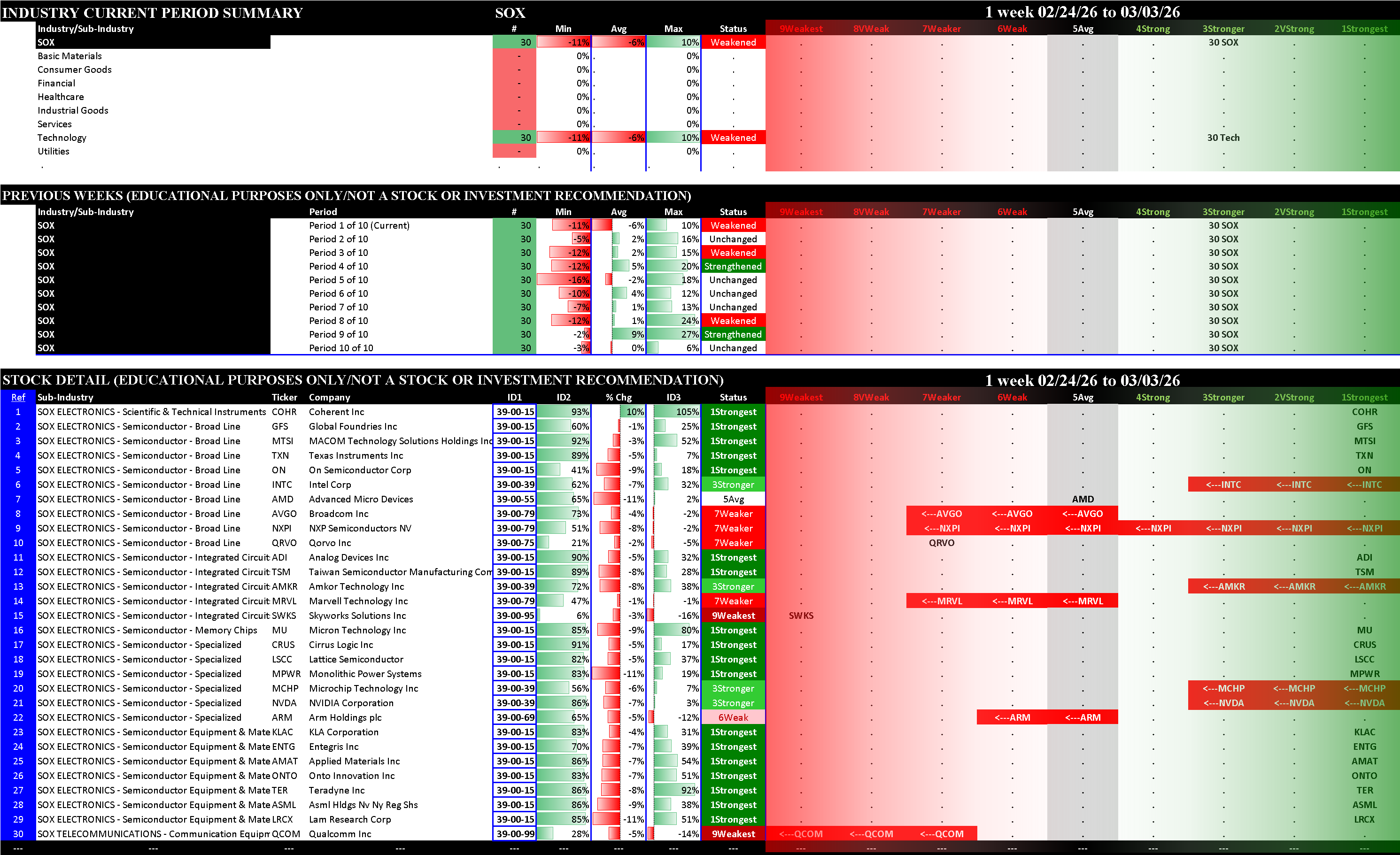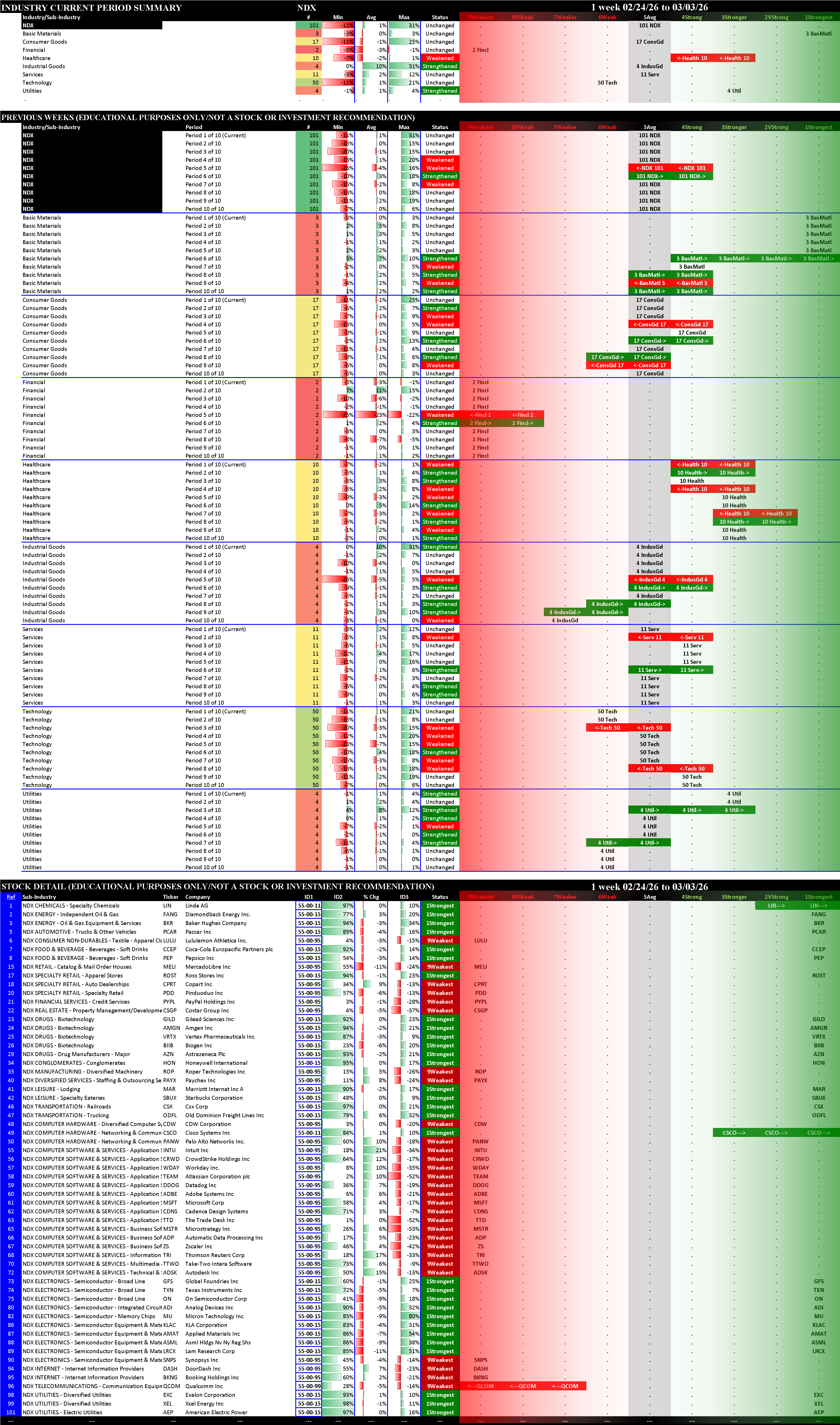 Indexes Tue 2026-03-03: Unchanged NDX (5Average); Weakened/0 SP500 (4Strong), SOX (3Stronger), MAG7 (5Average)