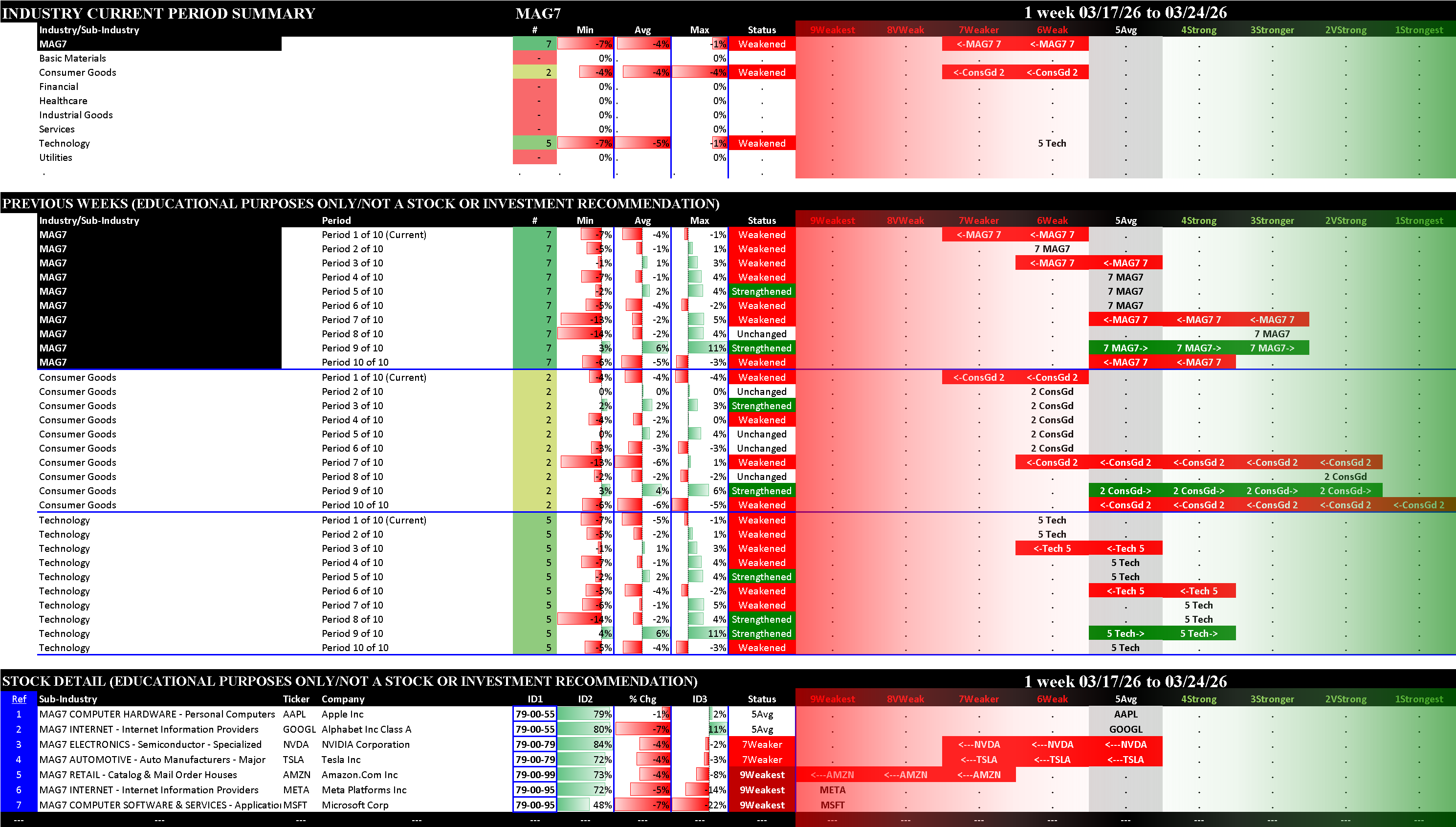 This post shows strengthening/weakening detail for this week for the S&P 500, Nasdaq 100, the Philadelphia Semiconductor Index (SOX), and the so-called Magnificent 7 stocks (MAG7).
