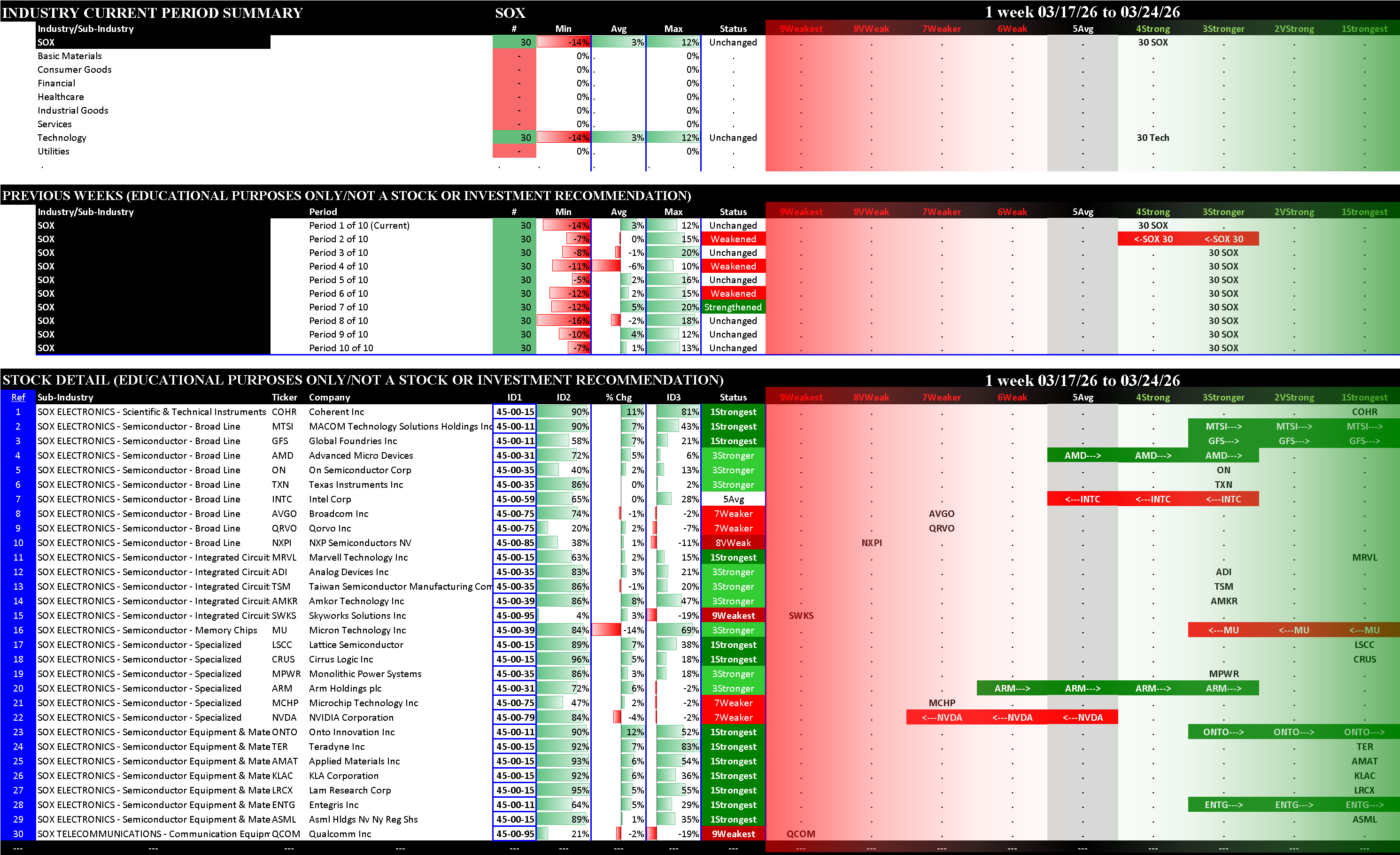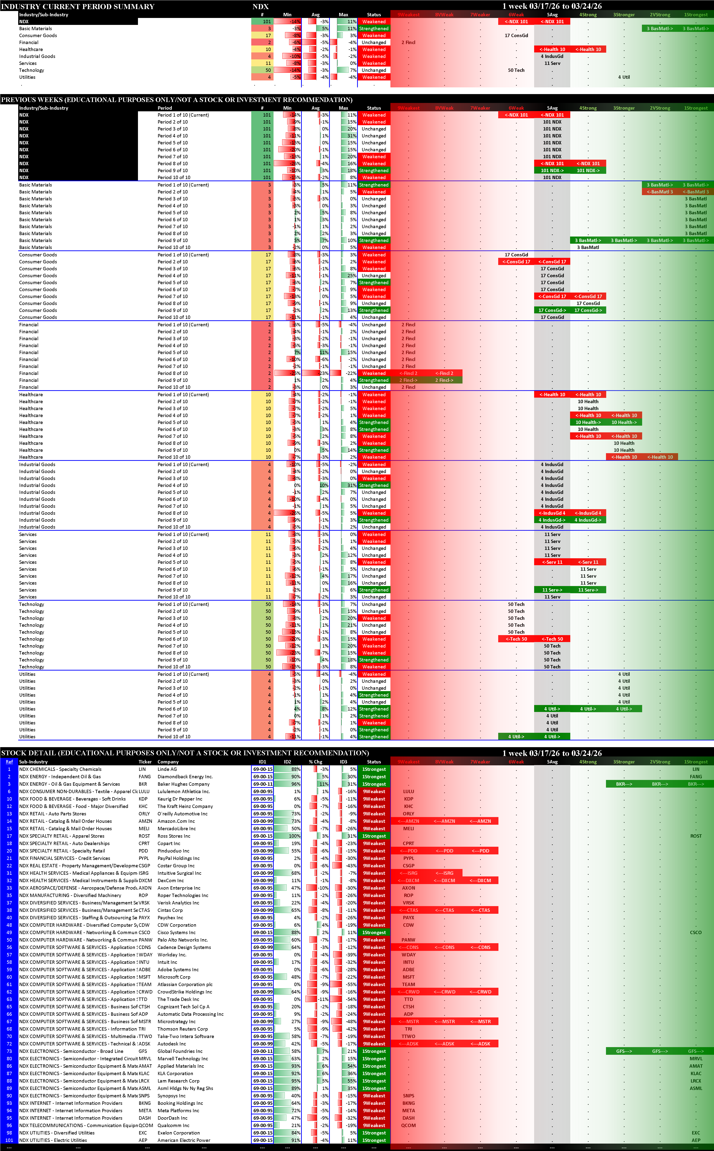 Indexes Tue 2026-03-24: Unchanged SOX (4Strong); Weakened/0 SP500 (5Average); Weakened/-1 NDX (6Weak), MAG7 (7Weaker)