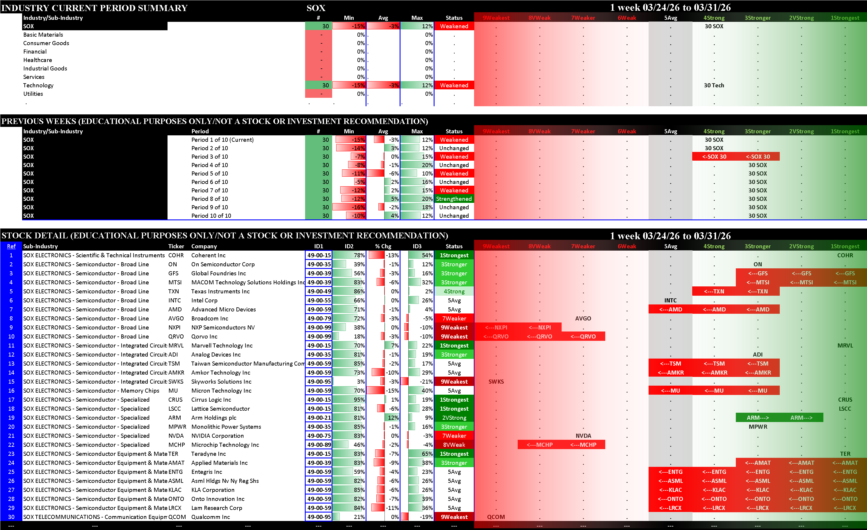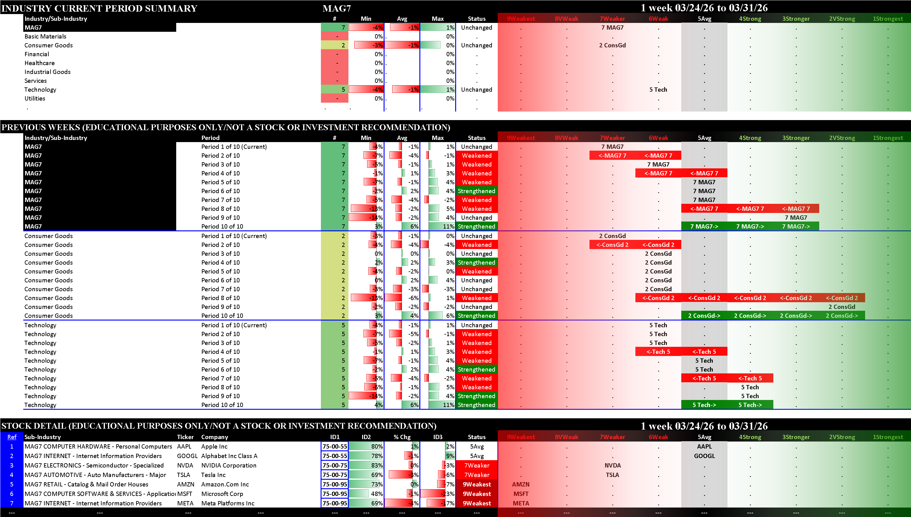 This post shows strengthening/weakening detail for this week for the S&P 500, Nasdaq 100, the Philadelphia Semiconductor Index (SOX), and the so-called Magnificent 7 stocks (MAG7).