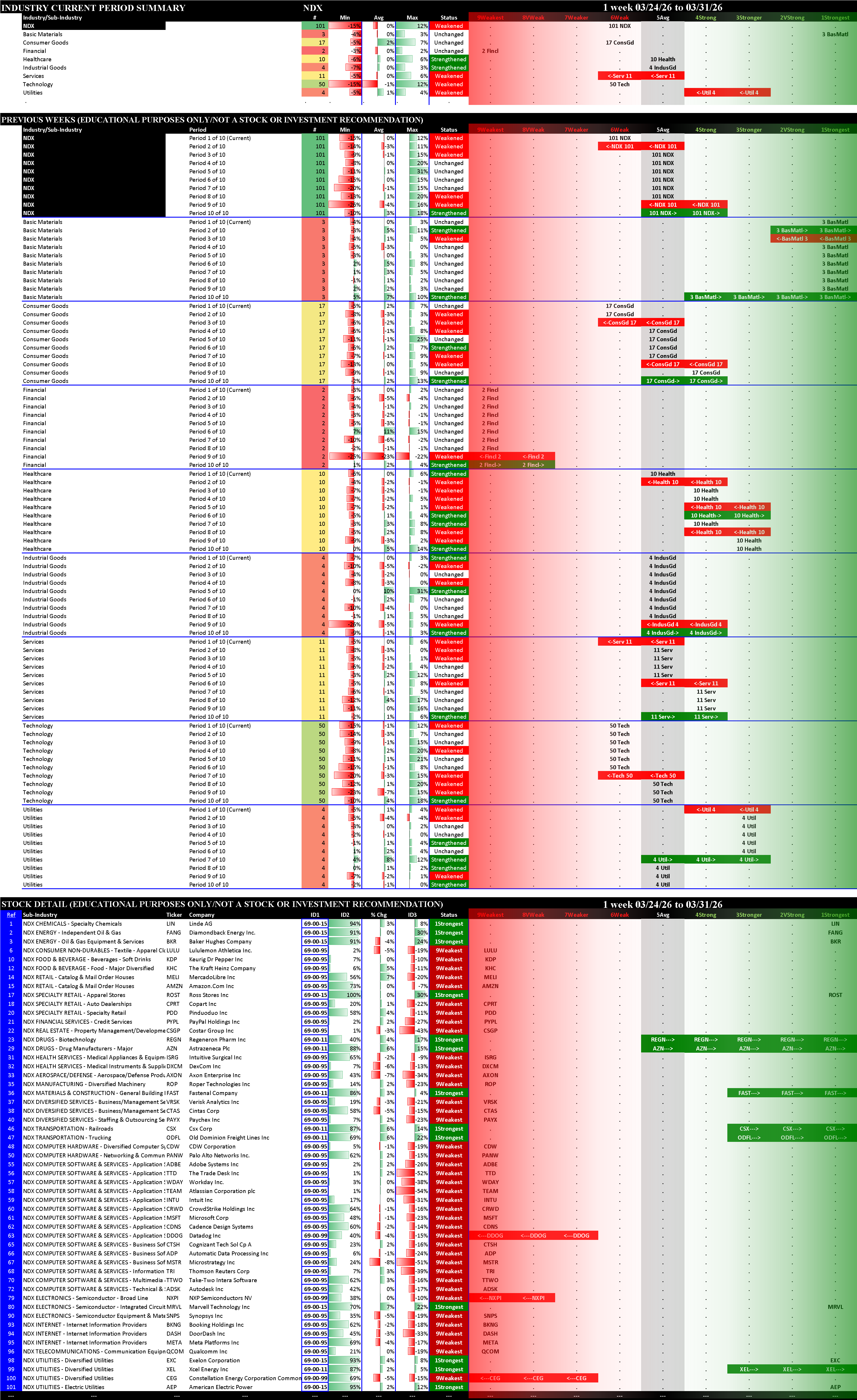 Indexes Tue 2026-03-31: Unchanged SP500 (5Average), MAG7 (7Weaker); Weakened/0 NDX (6Weak), SOX (4Strong)