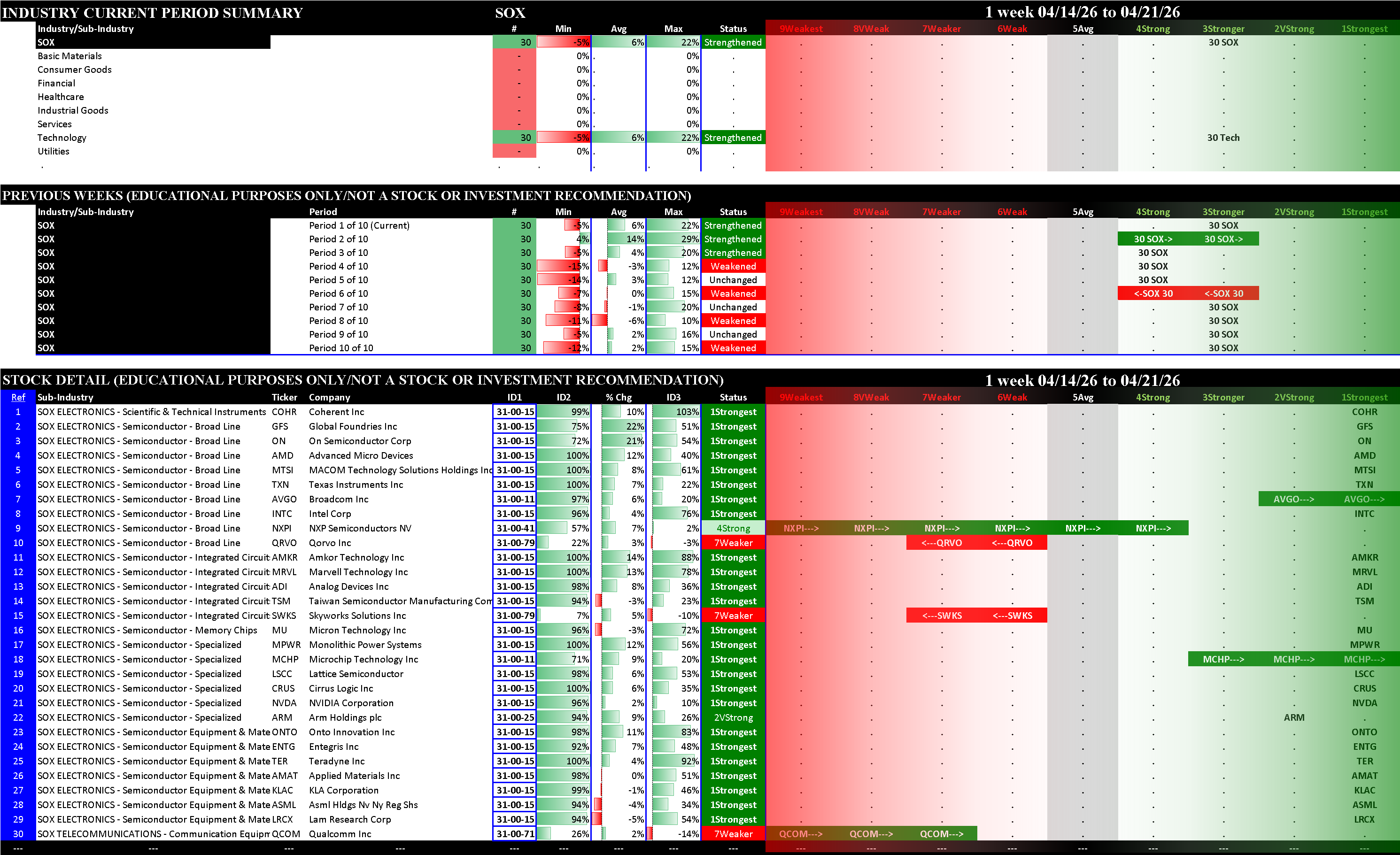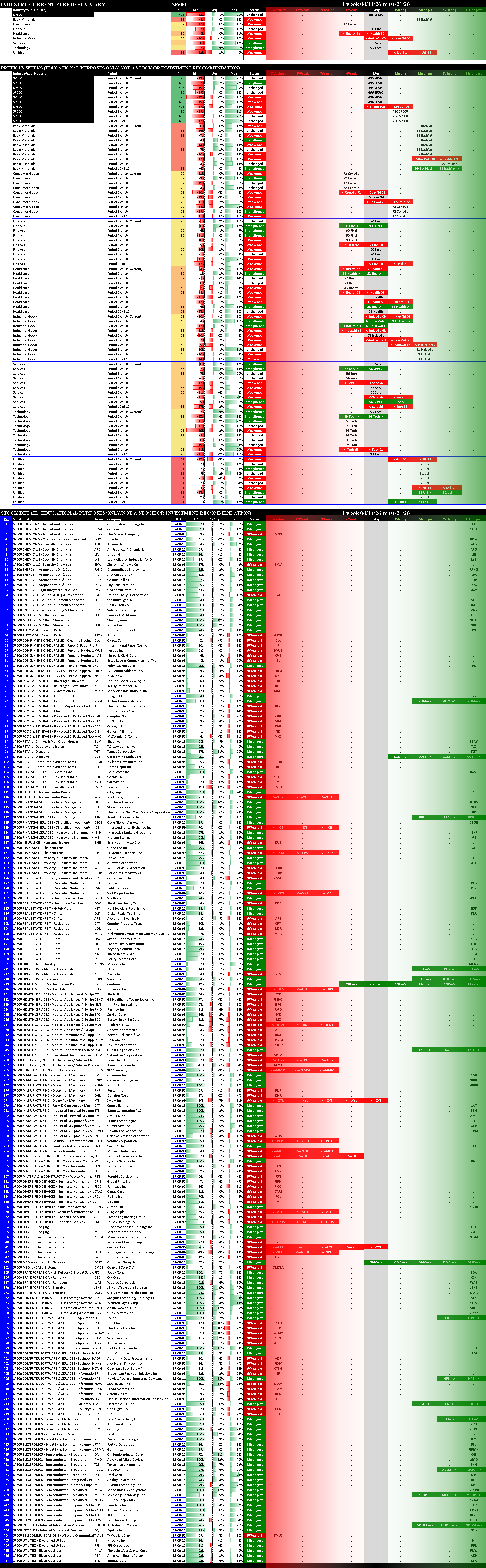The stock detail below for the S&P 500 and the Nasdaq 100 shows only the 1Strongest and 9Weakest stocks, grouped by Sector then Industry then Sub-industry. The SOX and MAG7 detail shows all stocks in each.