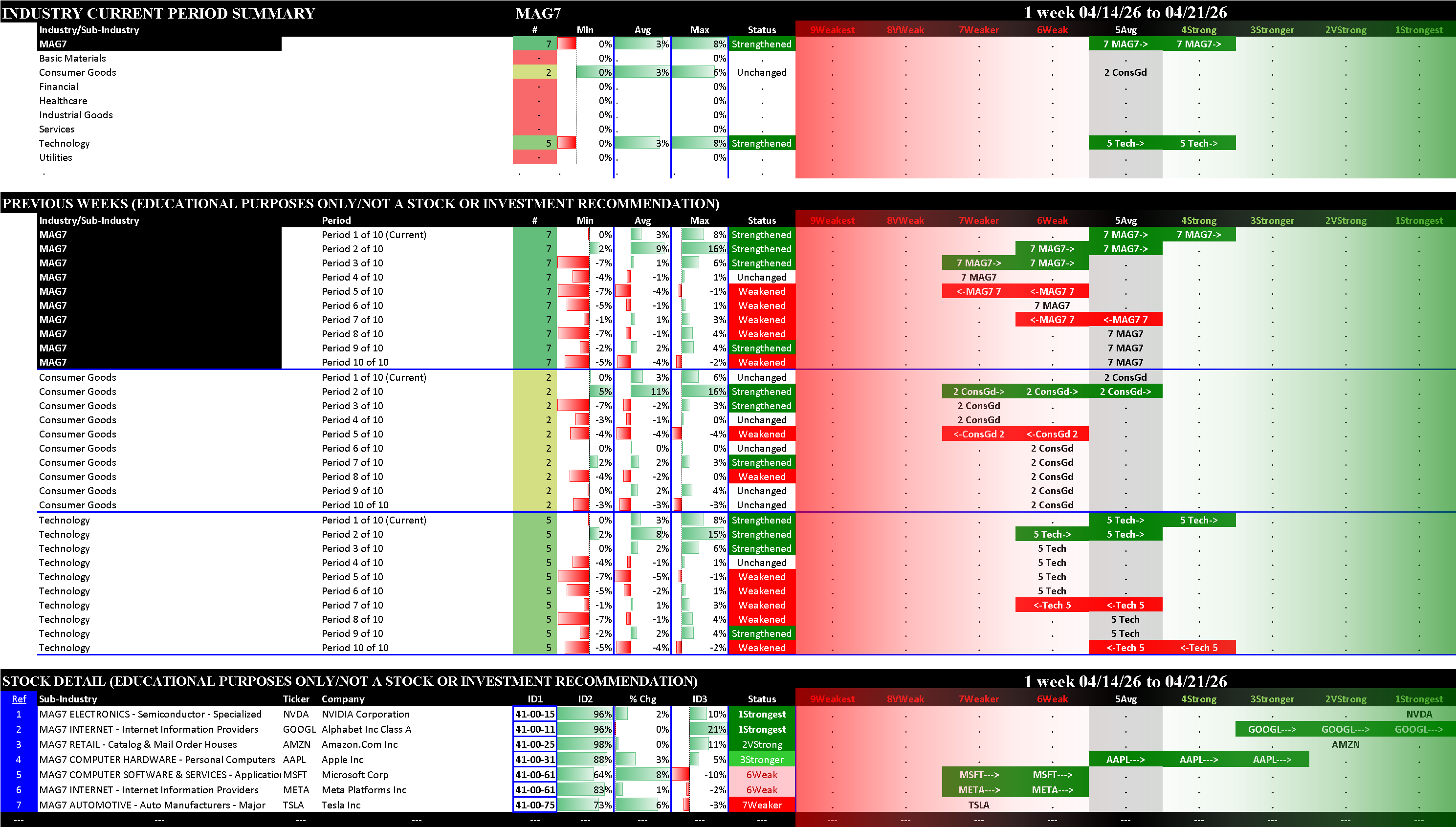 This post shows strengthening/weakening detail for this week for the S&P 500, Nasdaq 100, the Philadelphia Semiconductor Index (SOX), and the so-called Magnificent 7 stocks (MAG7).