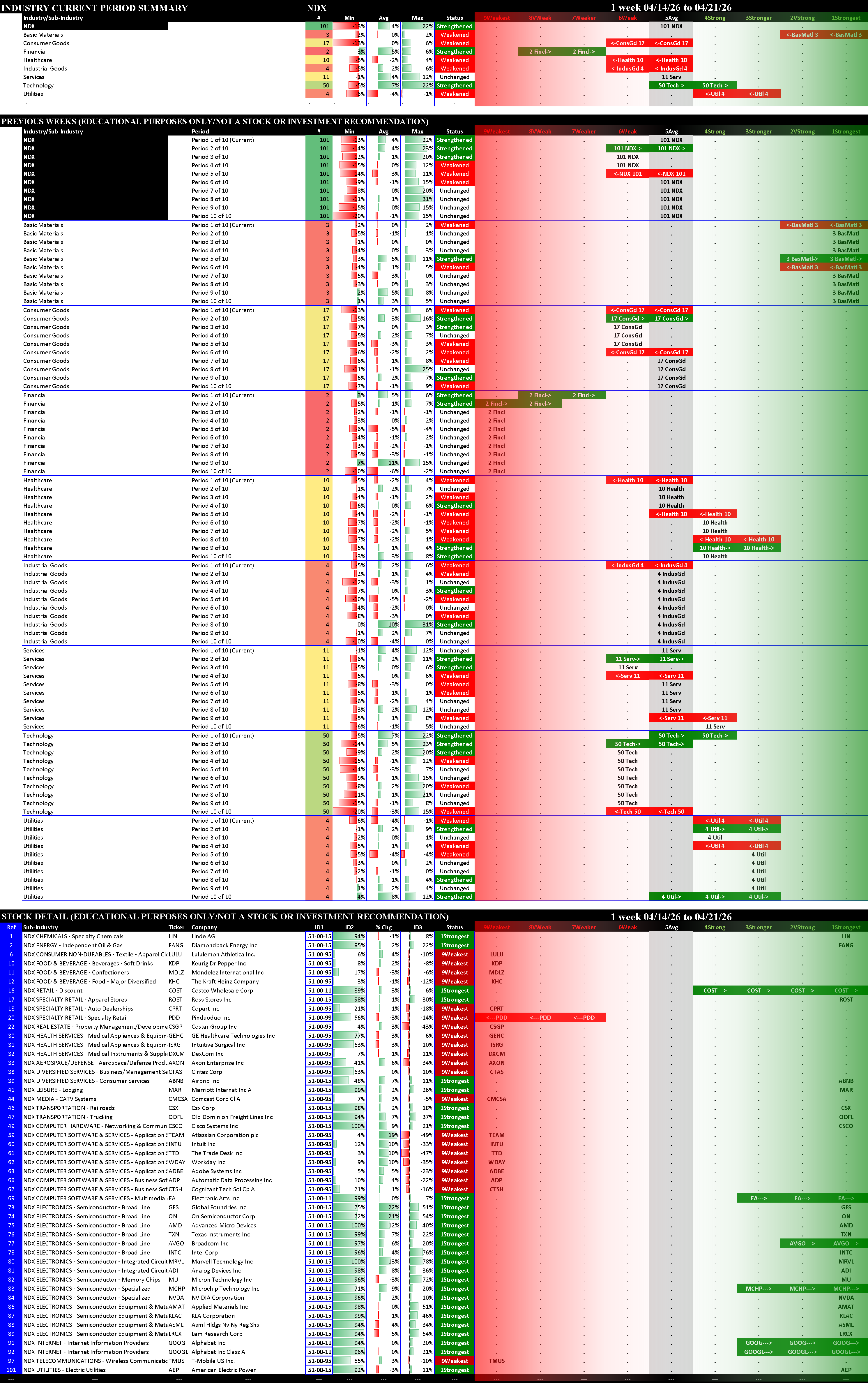 Indexes Tue 2026-04-21: Strengthened/+1 MAG7 (4Strong); Strengthened/0 NDX (5Avg), SOX (3Stronger); Unchanged SP500 (5Avg)