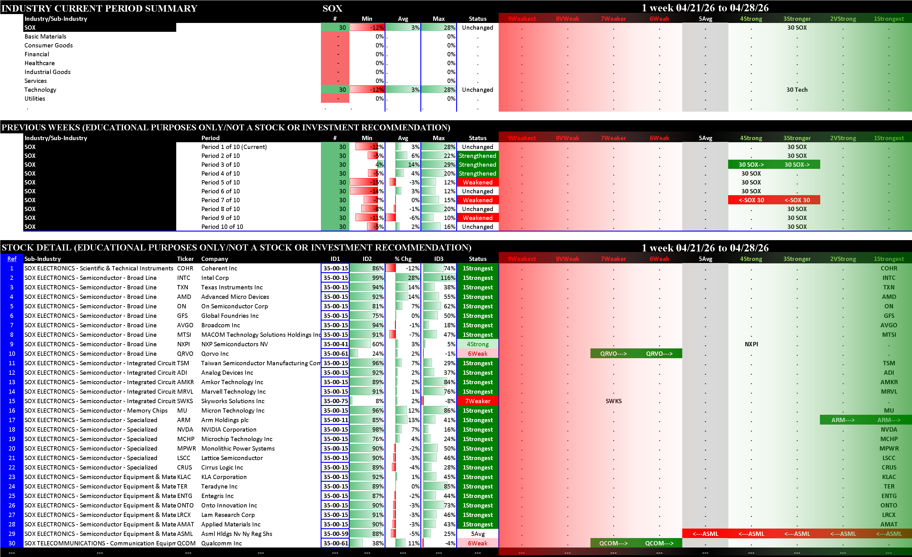 The stock detail below for the S&P 500 and the Nasdaq 100 shows only the 1Strongest and 9Weakest stocks, grouped by Sector then Industry then Sub-industry. The SOX and MAG7 detail shows all stocks in each.