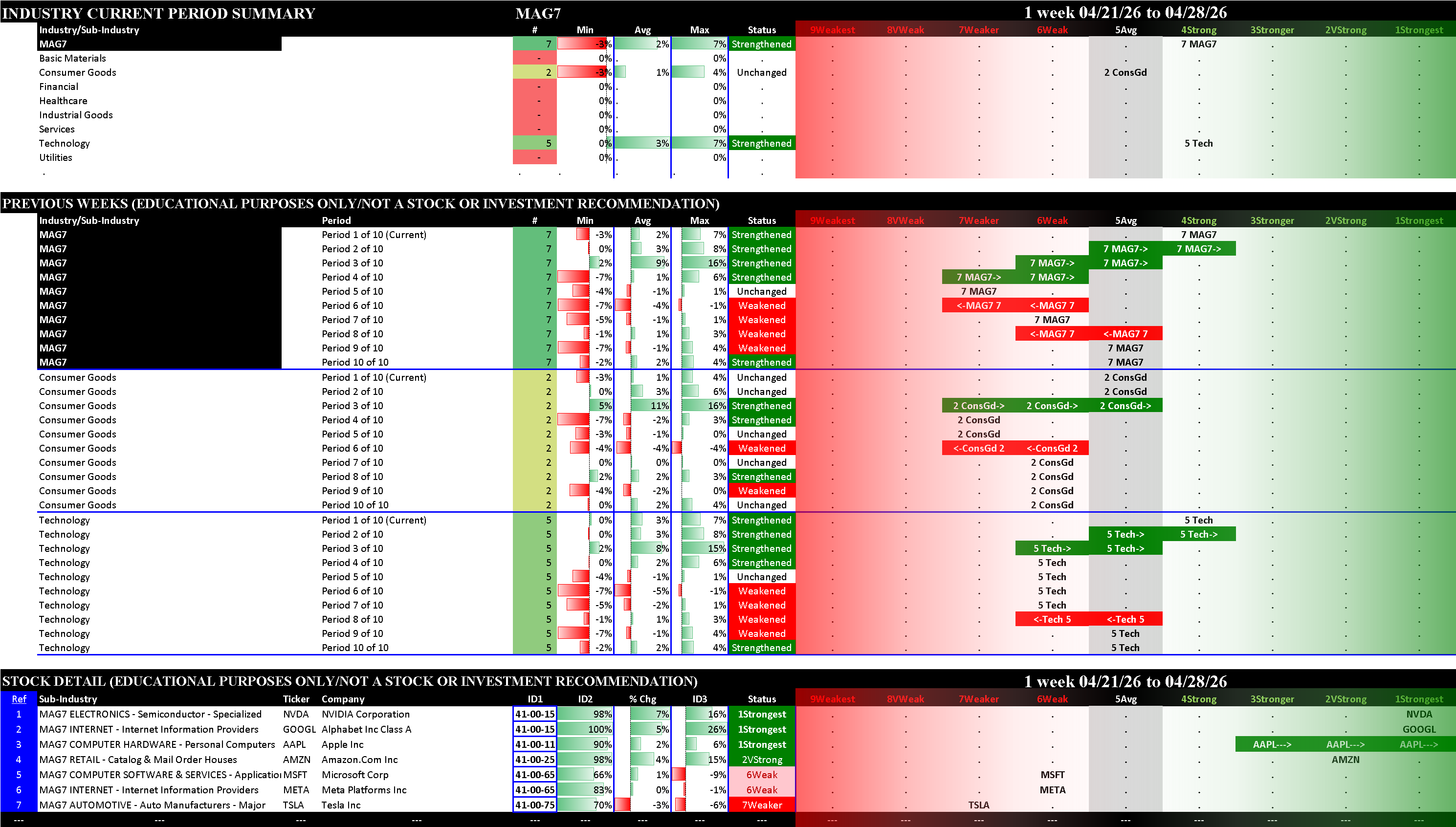 This post shows strengthening/weakening detail for this week for the S&P 500, Nasdaq 100, the Philadelphia Semiconductor Index (SOX), and the so-called Magnificent 7 stocks (MAG7).