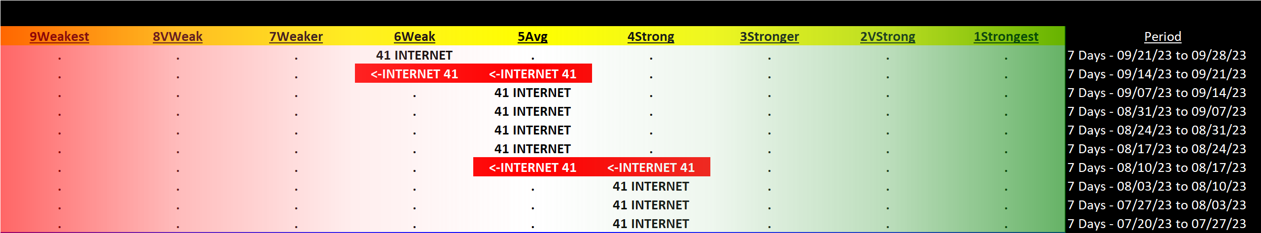Internet 2023-09-28: Unchanged at WEAK strength rating (6th strongest of 9 levels), previous move was DOWN