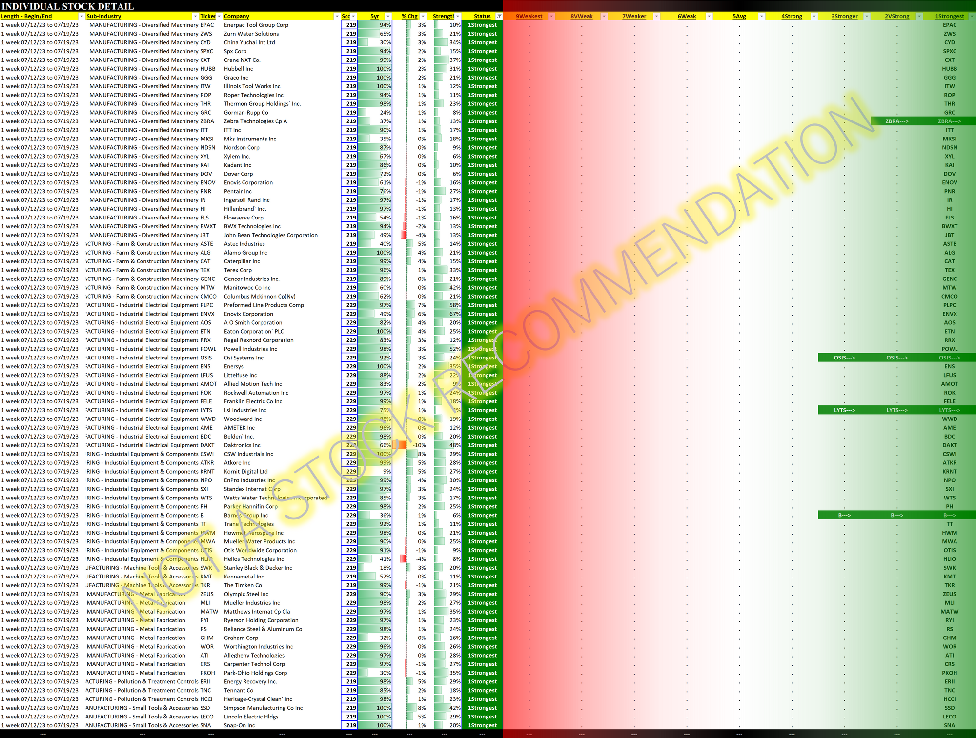 Current strongest and weakest stocks are shown below. These are of most interest as the downtrodden are prone to large (if perhaps temporary) pops while the strongest have been leading the charge for their sub-industries.