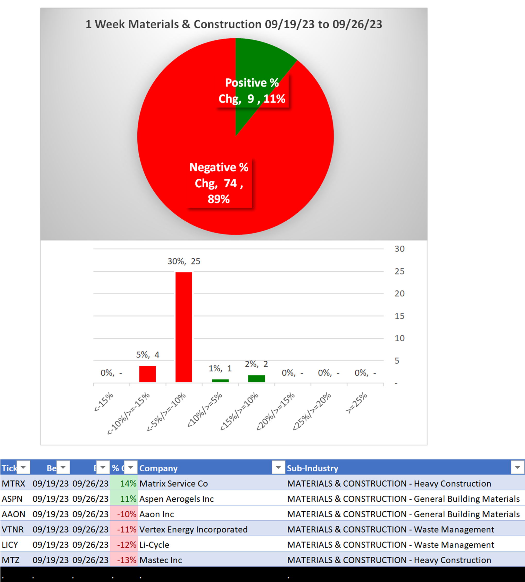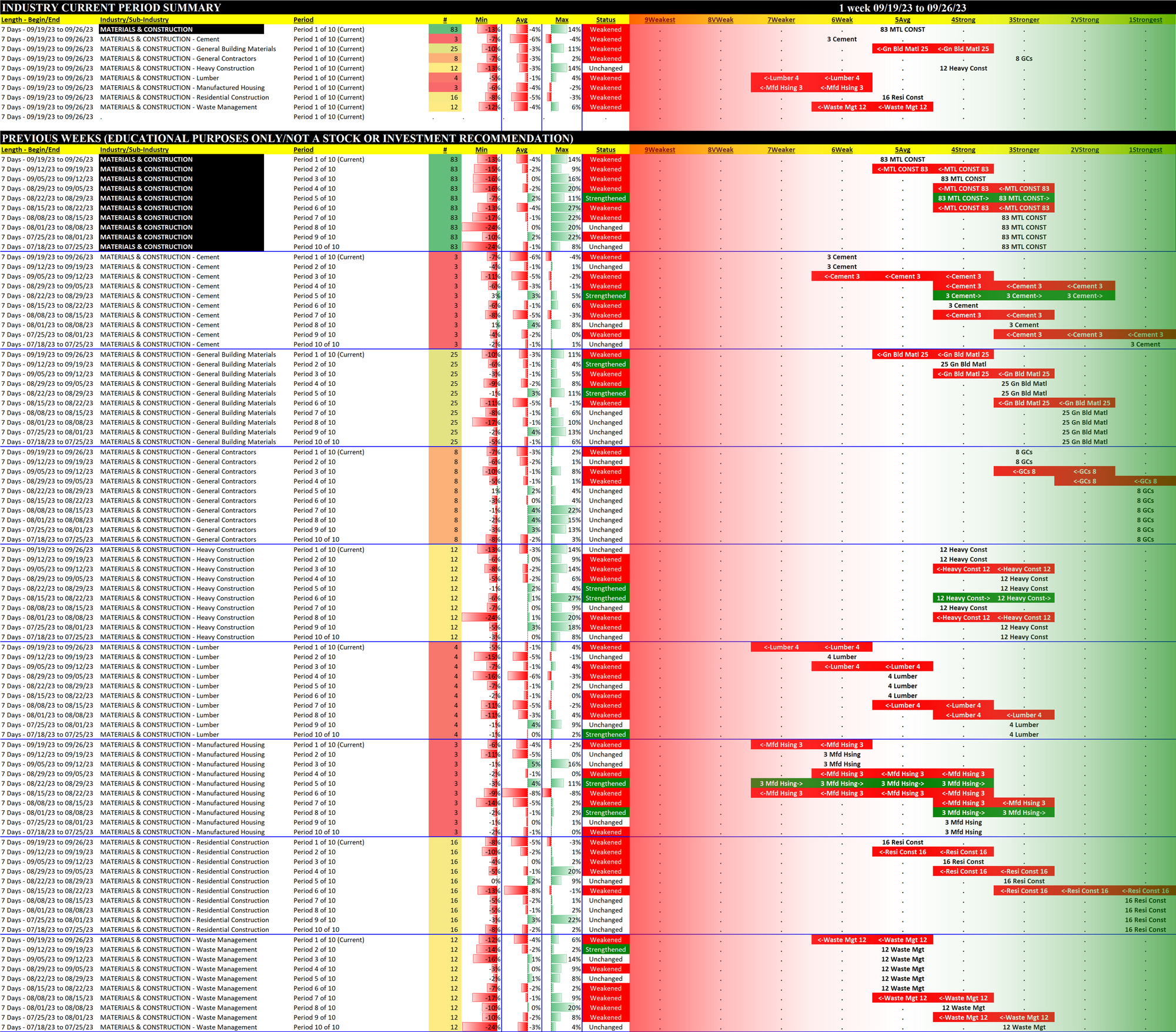 What: recent week-by-week strength changes for the industry and each underlying sub-industry