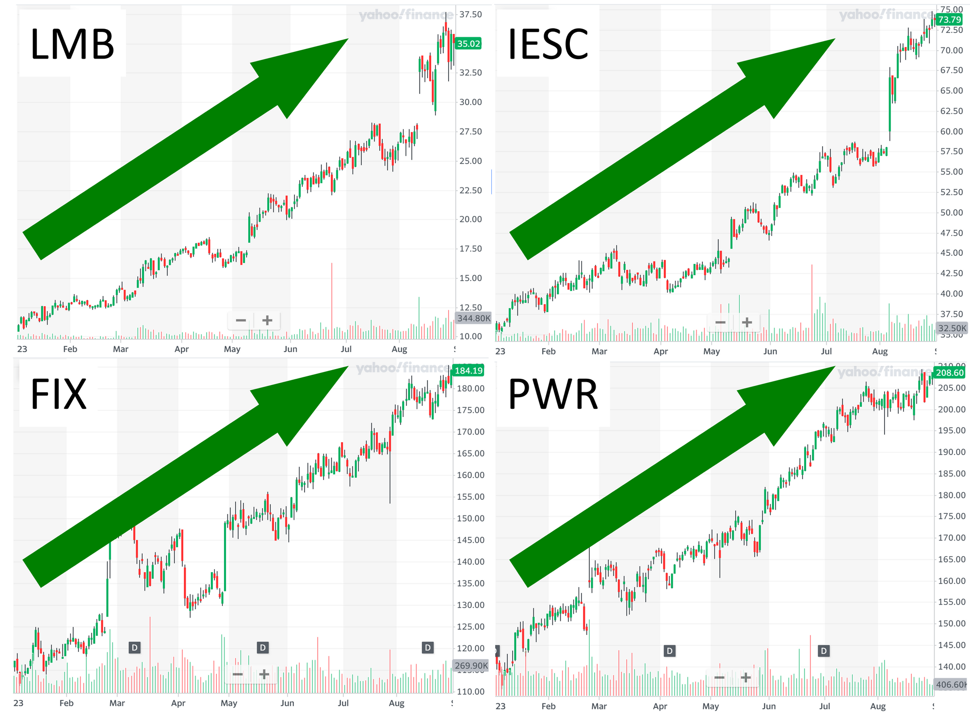 The largest sub-industry with 25 stocks is General Building Materials, which has also had a strong 2023 and which has a "STRONGER" rating (3rd strongest of 9 levels). The leader BLD/TopBuild Corp. is +83% YTD, while there are 9 other stocks >+50%. The lowest positive return is NX/Quanex Corp. +11%.