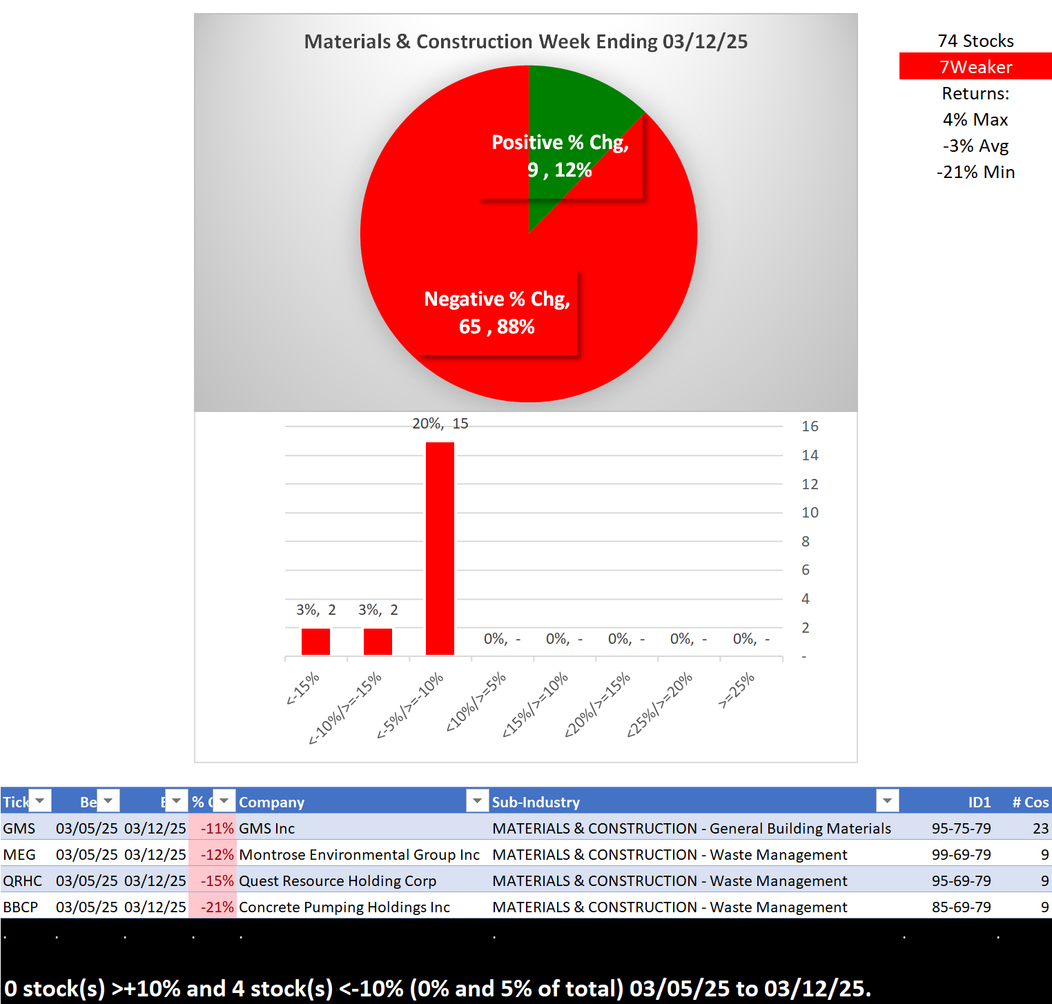 The following summarizes this week's positive/negative performance and major outliers (greater than +10% and lesser than -10%) and the past 10 weeks ratings and changes for the Materials/Construction sub-industries.