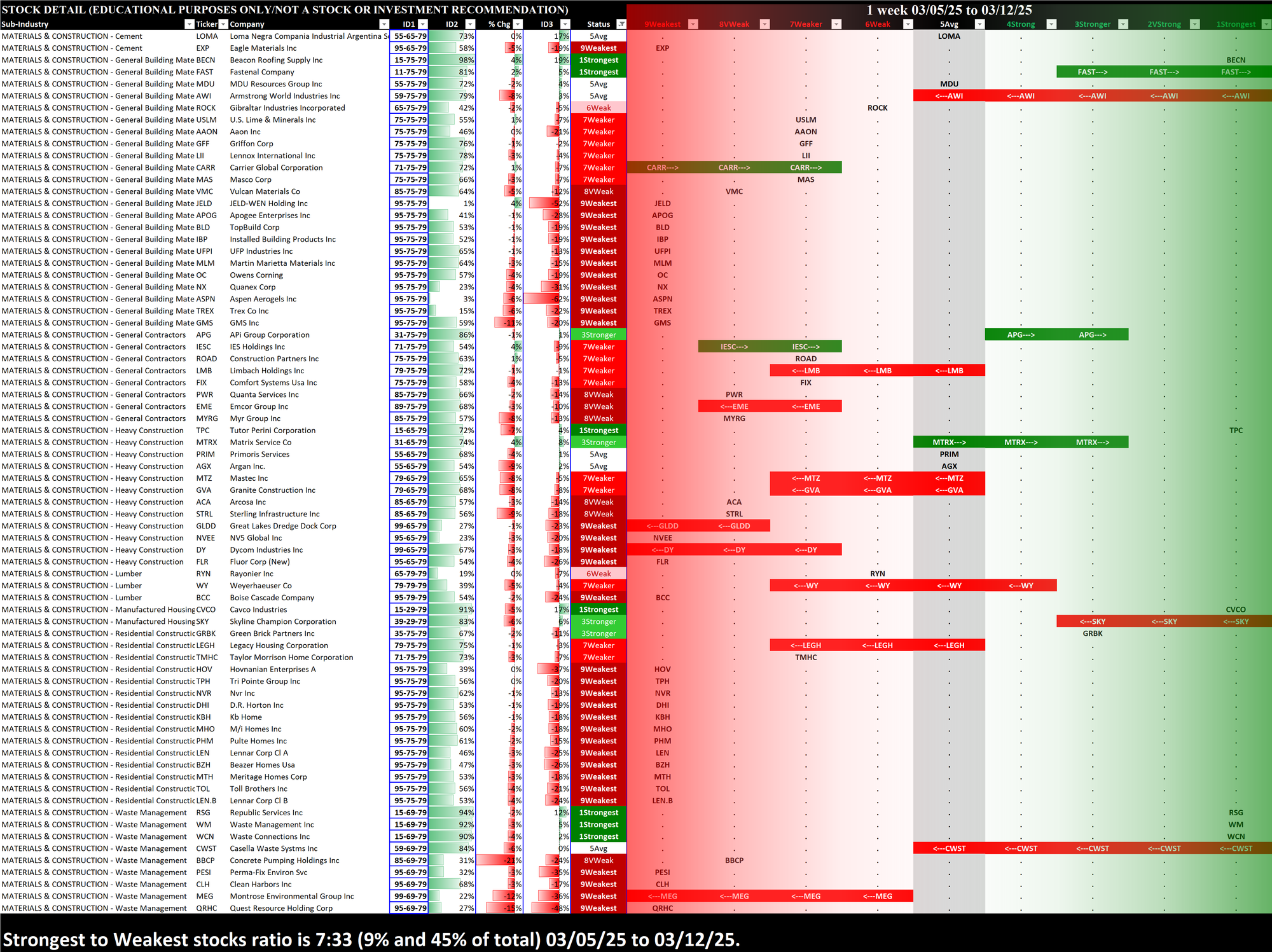 The following provides a listing of all Materials/Construction industry stocks in order of 1) sub-industry, 2) strongest-to-weakest strength rating, then 3) highest to lowest return this week. This is preceded by a summary of the proportion of 1Strongest to 9Weakest stocks.