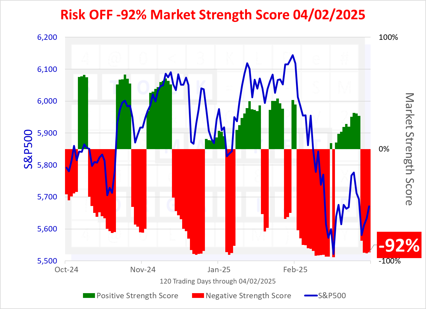 The Market Strength Score changed to negative ("Risk OFF") at-82% as of Friday, March 28, 2025.