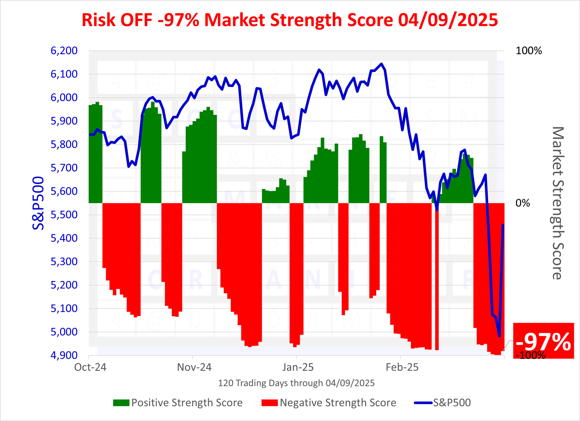 The Market Strength Score changed to negative ("Risk OFF") at-82% as of Friday, March 28, 2025.