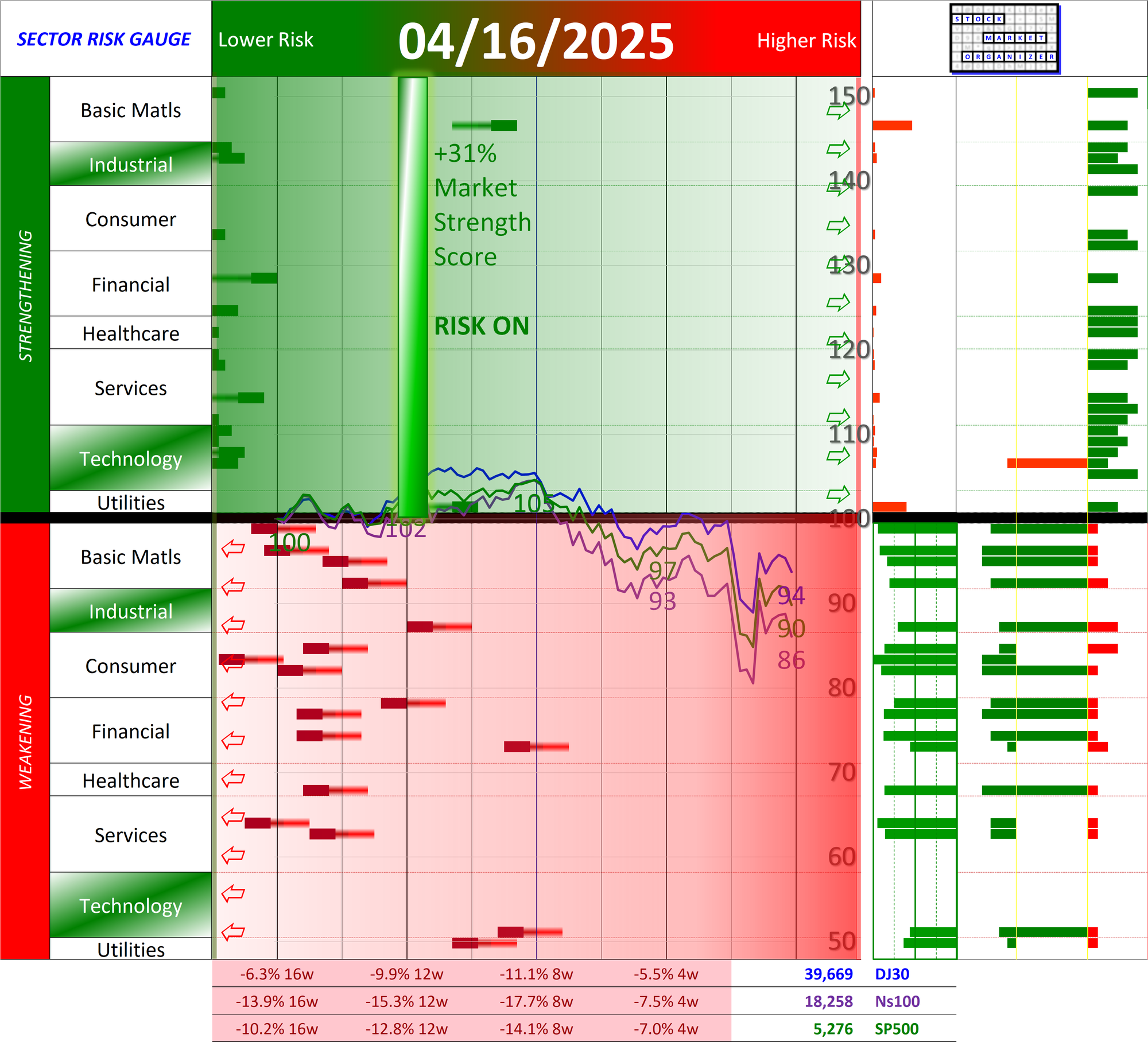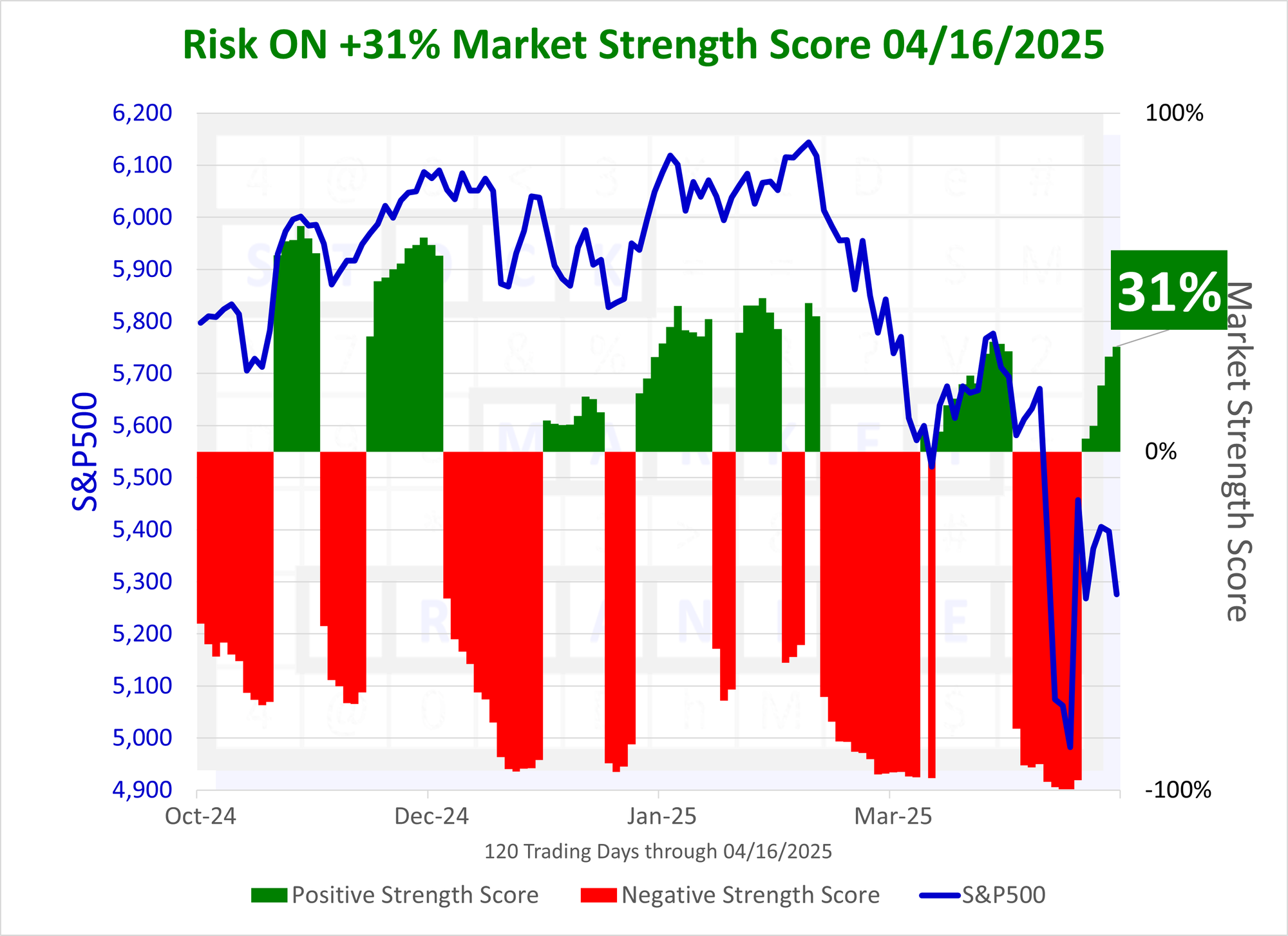 The Market Strength Score changed to positive ("Risk ON") at +4% as of Thursday, April 10, 2025.