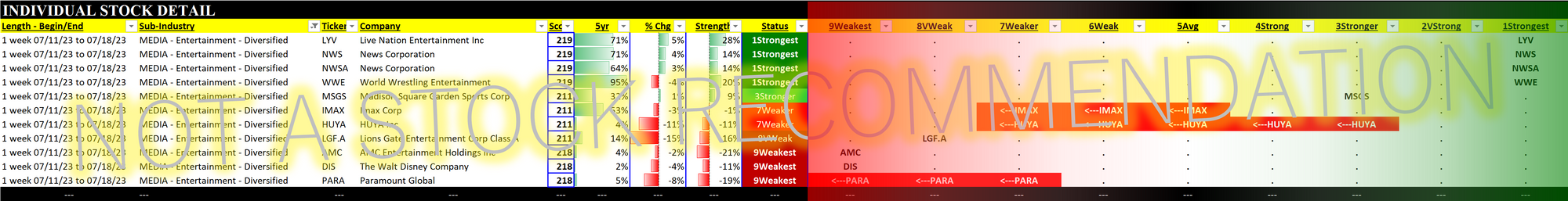 Diversified Entertainment has an Average strength rating and it has been stagnant for seven weeks. The three stocks listed above are at the bottom of the pack, all Weakest.