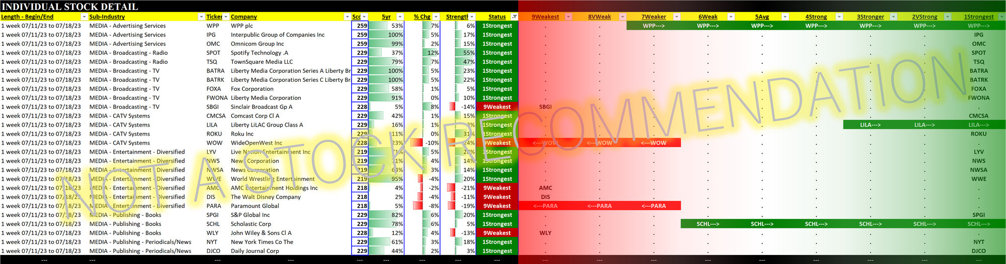 (Perhaps the closer look should be Movie Production - though there are only two stocks there. There is no advantage to focusing on a sub-industry with only two stocks. That said, as noted in the caption to the previous graphic, there is clear weakness over the past five weeks in this sub-industry.)