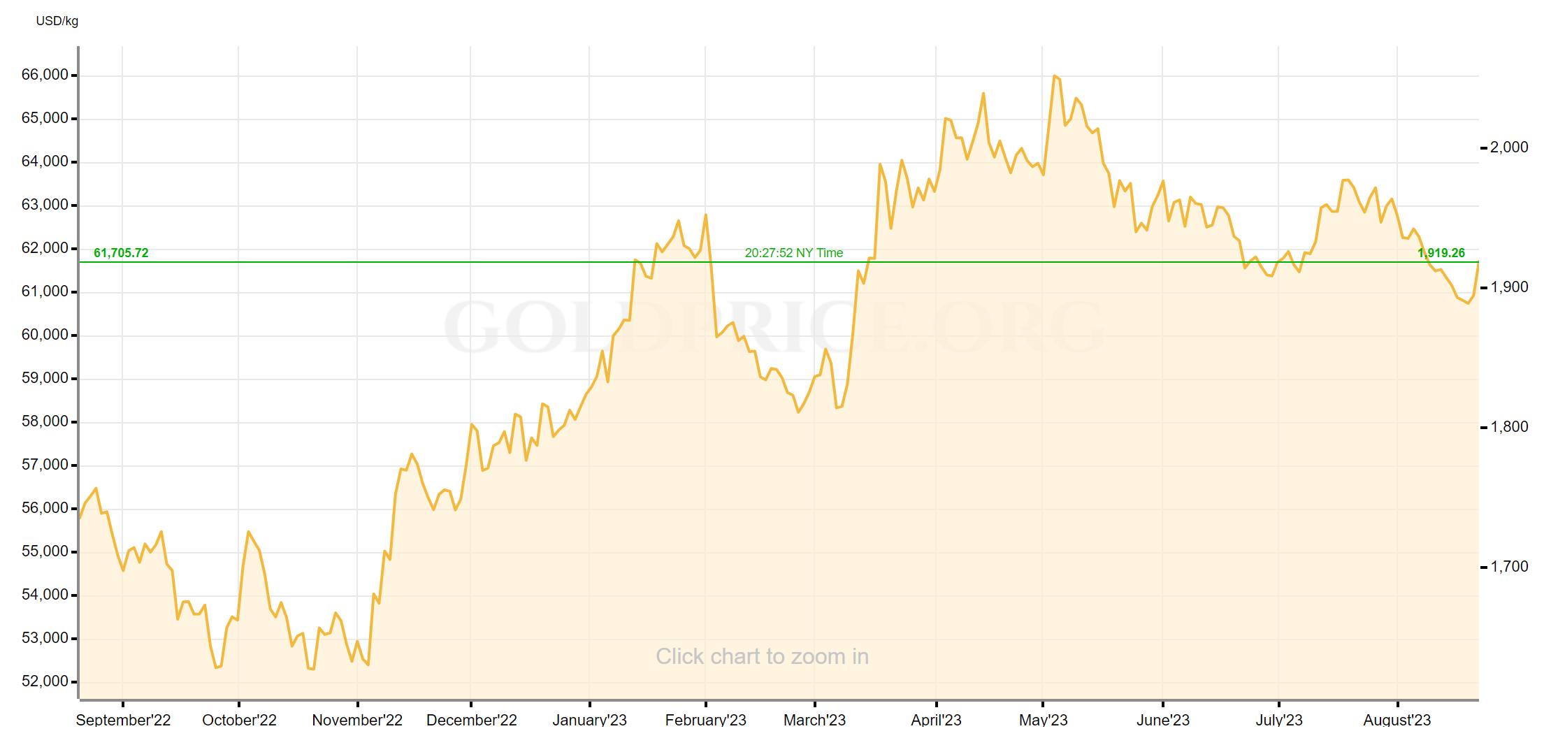 For reference, gold is now a little over $1,900/ounce. While it has been rising in recent days, it has generally been moving down from its 5/3/23 $2,052 high but has been rising in recent days from its 8/18/23 $1,889 low. Over the past 3 months gold has generally bounced between $1,900 and $1,975.