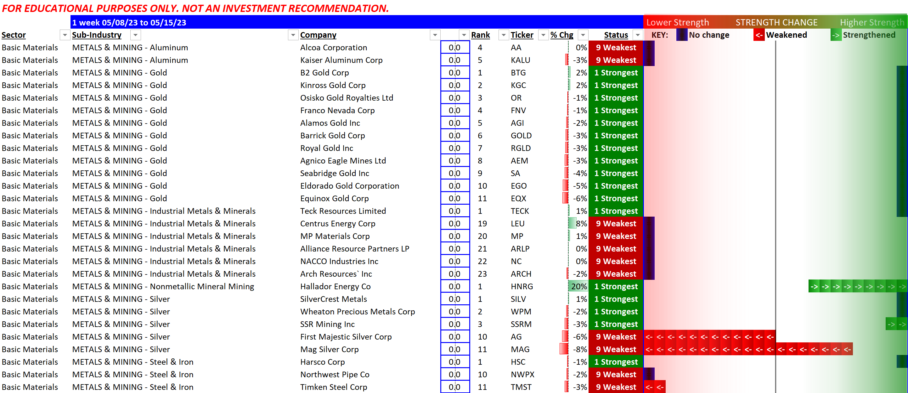 D: Highlighting there are currently nine Gold sub-industry stocks with the “Strongest” rating – overall, this section shows only the stocks with “Weakest” and “Strongest” ratings