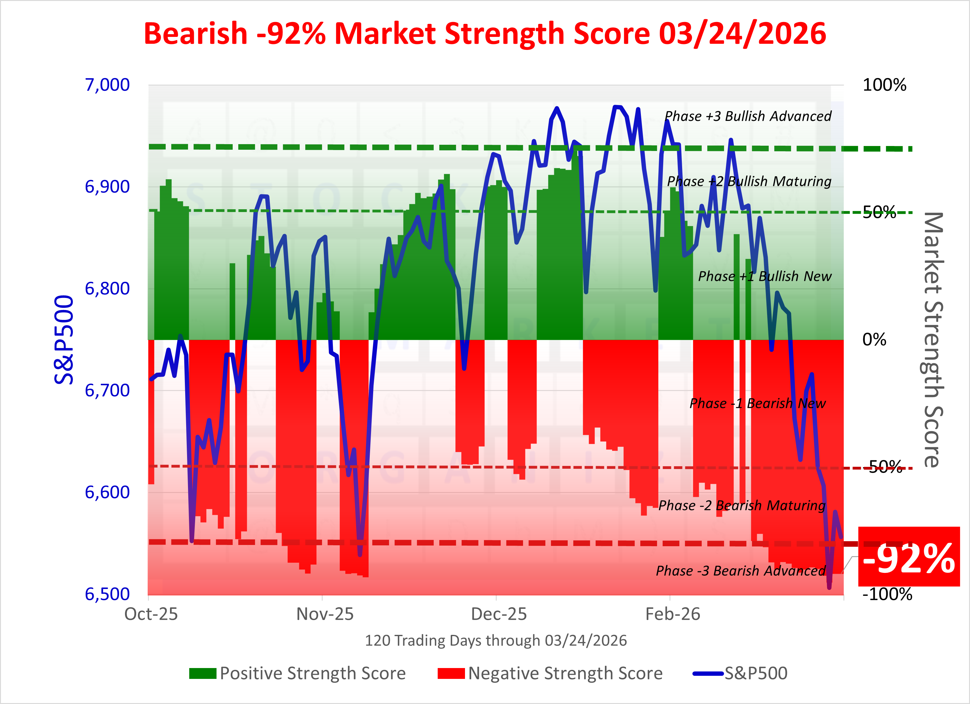 NEGATIVE Market Strength Score Tue 2026-03-24 (Phase -3 Bearish Advanced -92%)