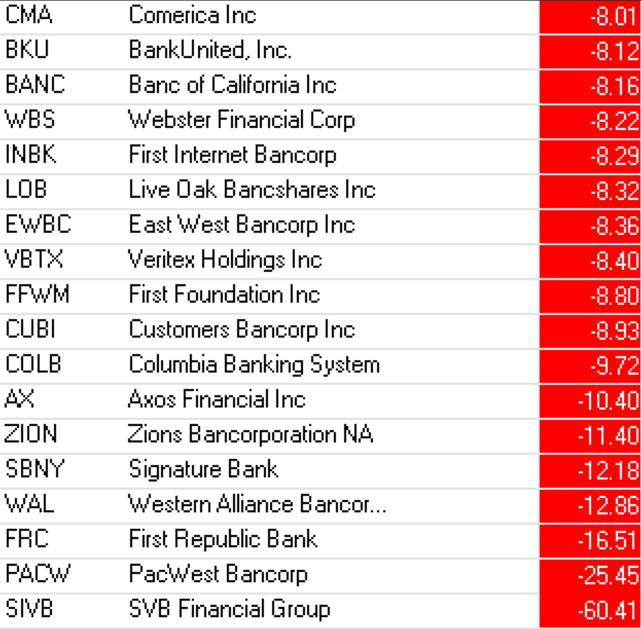 Of 200 banking stocks above a certain price/volume threshold I follow, only one was positive. 18 were down more than 8%. Other than SIVB, why were these stocks in particular impacted so much?