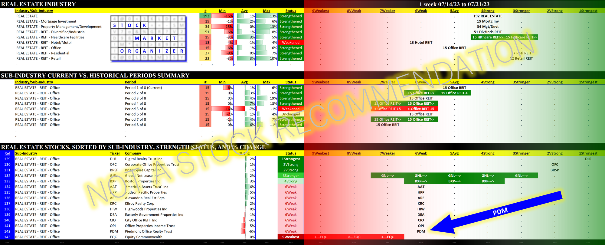 “…there's no shortcut around diving into the fundamentals.” Amazing analysis, and agreed. Helpful context may be added by measuring strengthening and weakening of stocks, their sub-industries, and their industries. An example is attached. PDM is currently rated Weak, 6th strongest of nine levels. In turn, while up versus eight weeks ago, Office REITs are currently rated Average (5th strongest), ahead of only Hotel REITs (Weak, 6th strongest) among Real Estate sub-industries.
