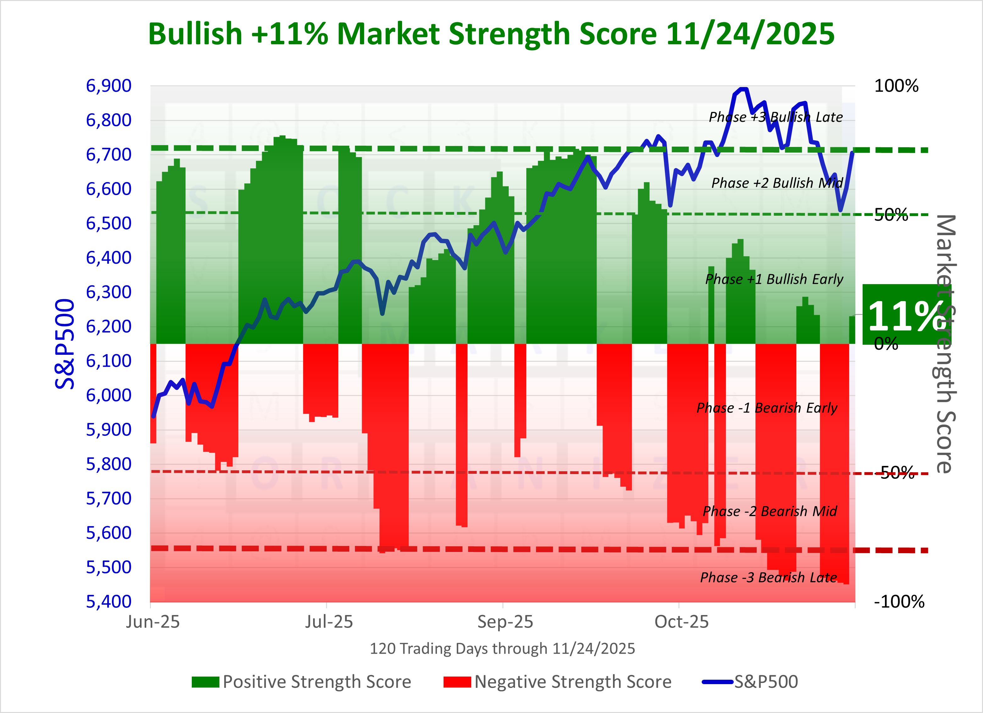 POSITIVE Market Strength Score Mon 2025-11-24 (Phase +1 Bullish Early +11%)