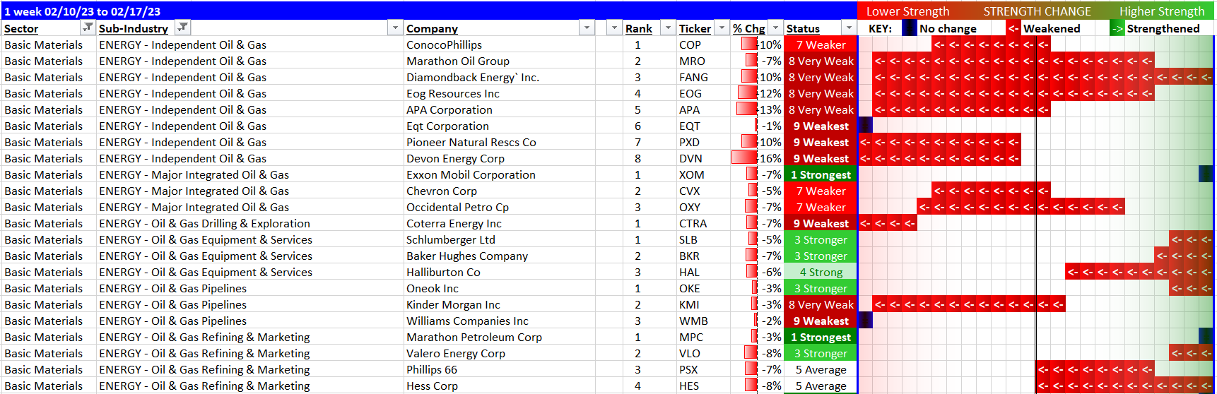 Can you objectively and consistently measure in what sectors, industries, and sub-industries there was weakening and strengthening in the S&P500? If not, look below for one way to do this. Energy: