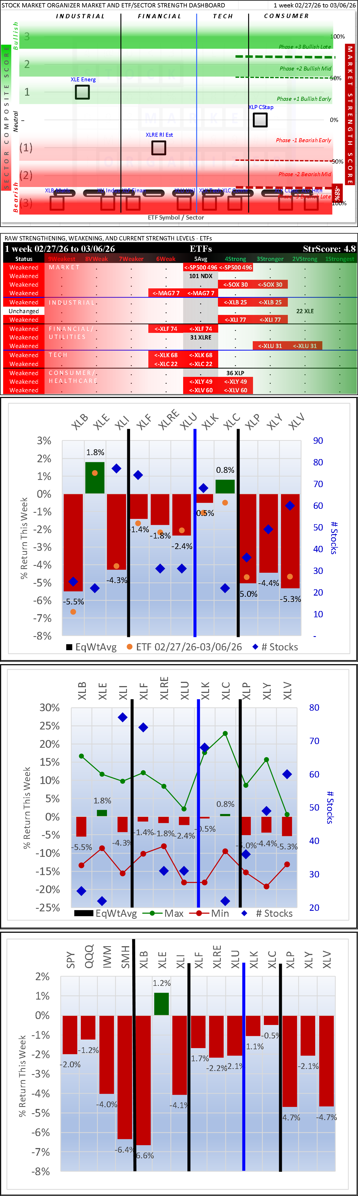 XLE Energy is the only ETF that did not weaken and is the leader at 2Very Strong. XLC Communications, XLF Financials, and XLK Technology all weakened rating and are the weakest at 6Weak.