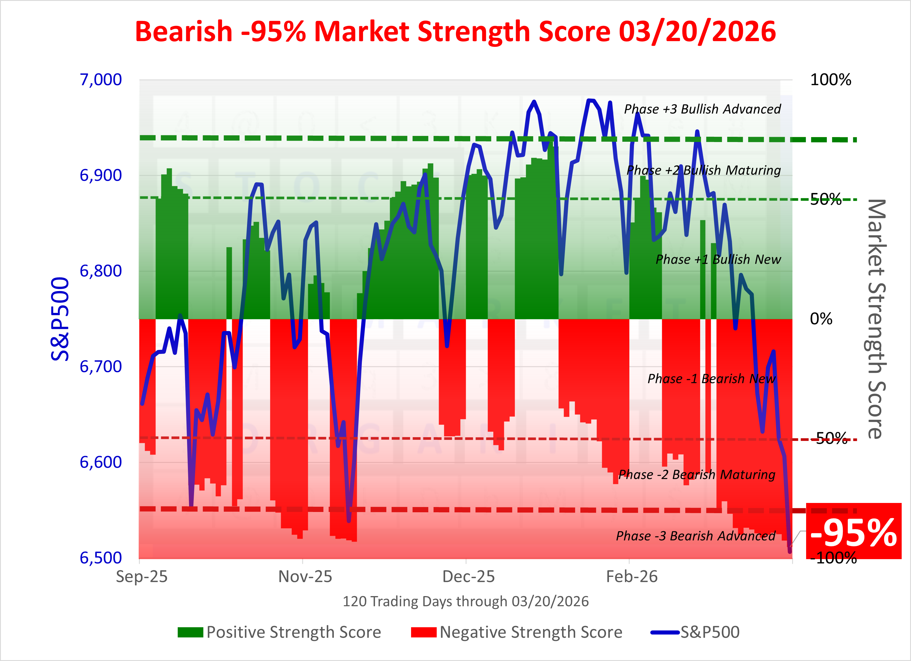 The Market Strength Score is currently advanced stage Bearish. Be cautious - this is high risk territory.