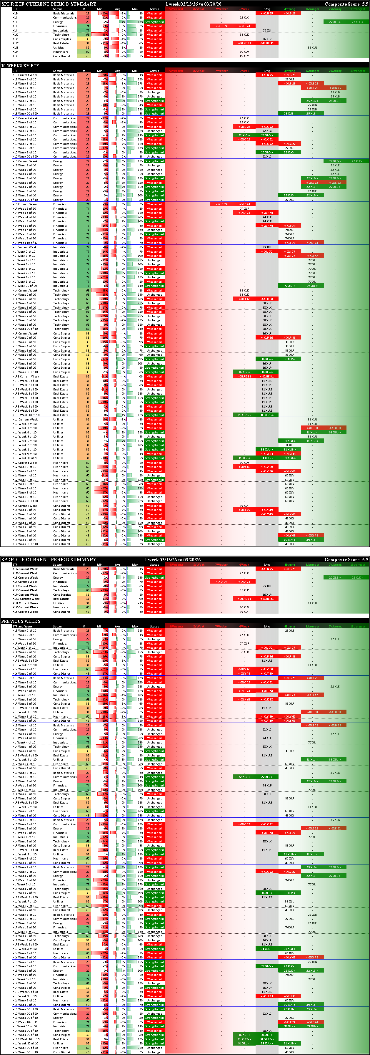 Other than XLE Energy which strengthened to 1Strongest, every other ETF weakened, three enough to change rating (XLB Materials, XLF Financials, XLRE Real Estate).