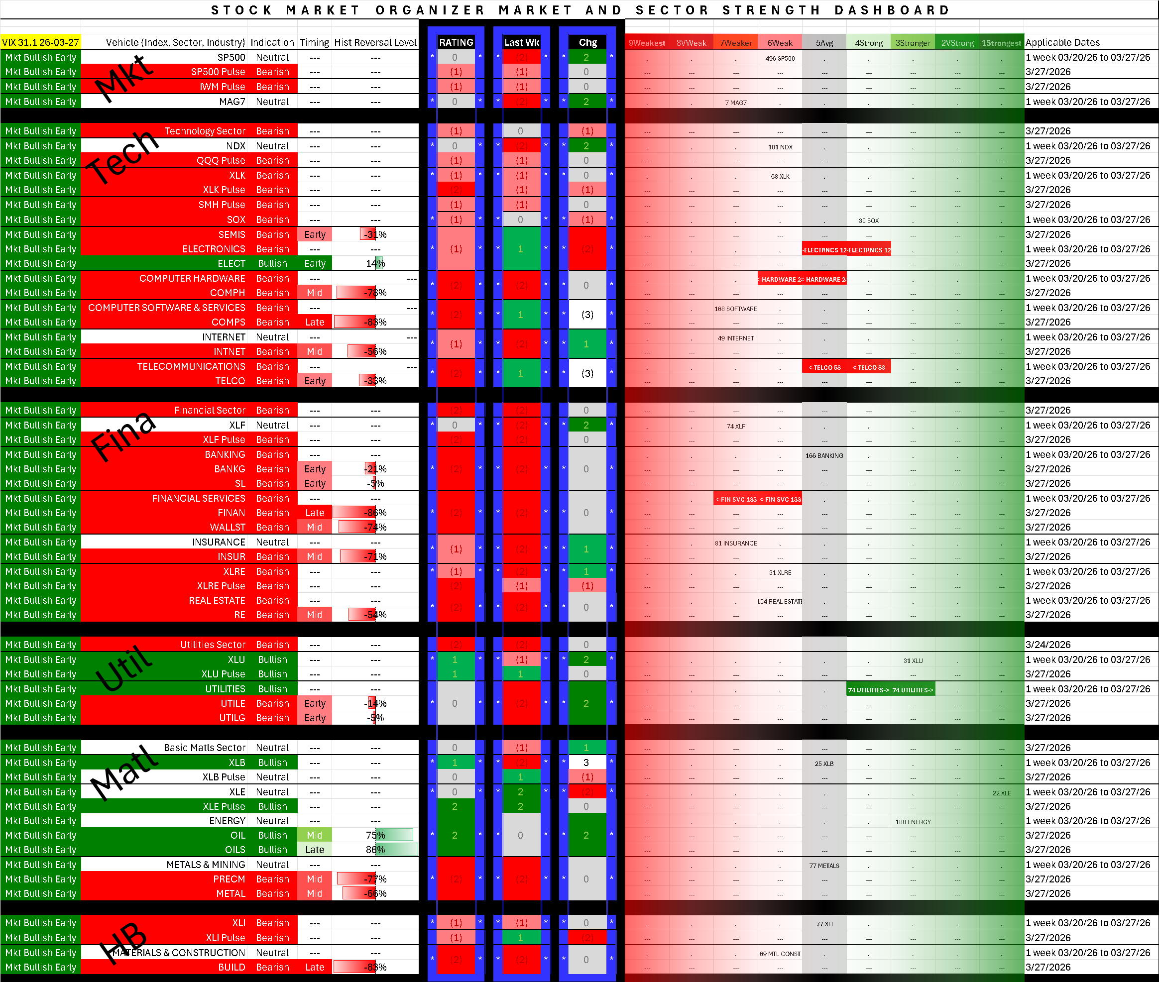 The column labeled "Rating" reflects this week's strength (based on this system's criteria) of the individual index, sector, or industry vehicle. Note also the columns which show last week's score and the change from last week's score.