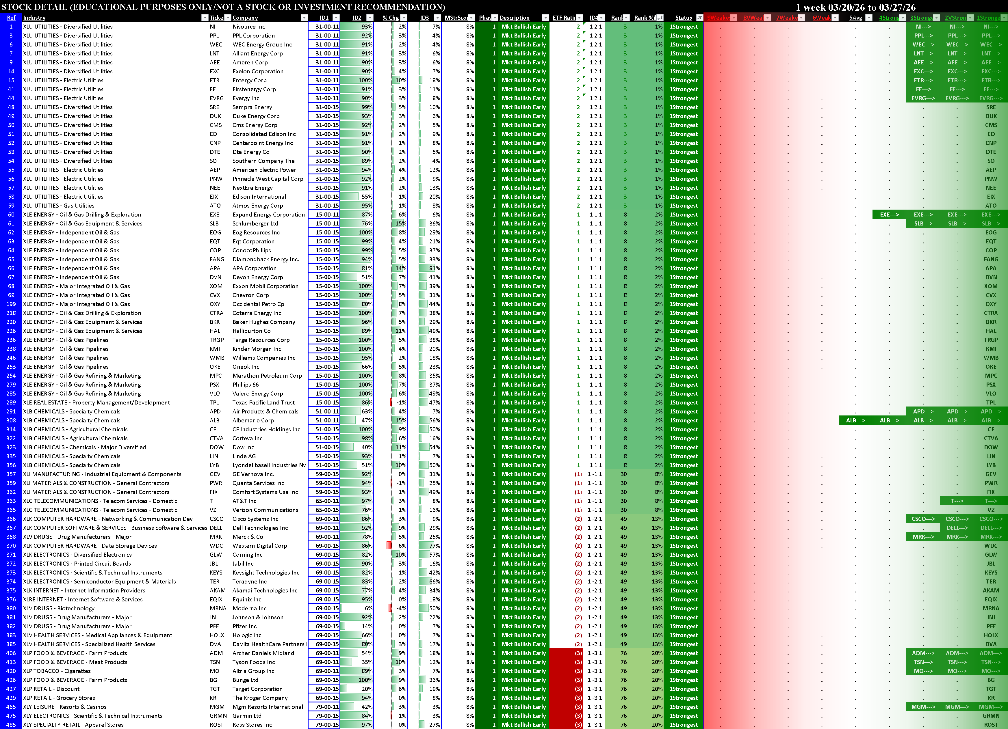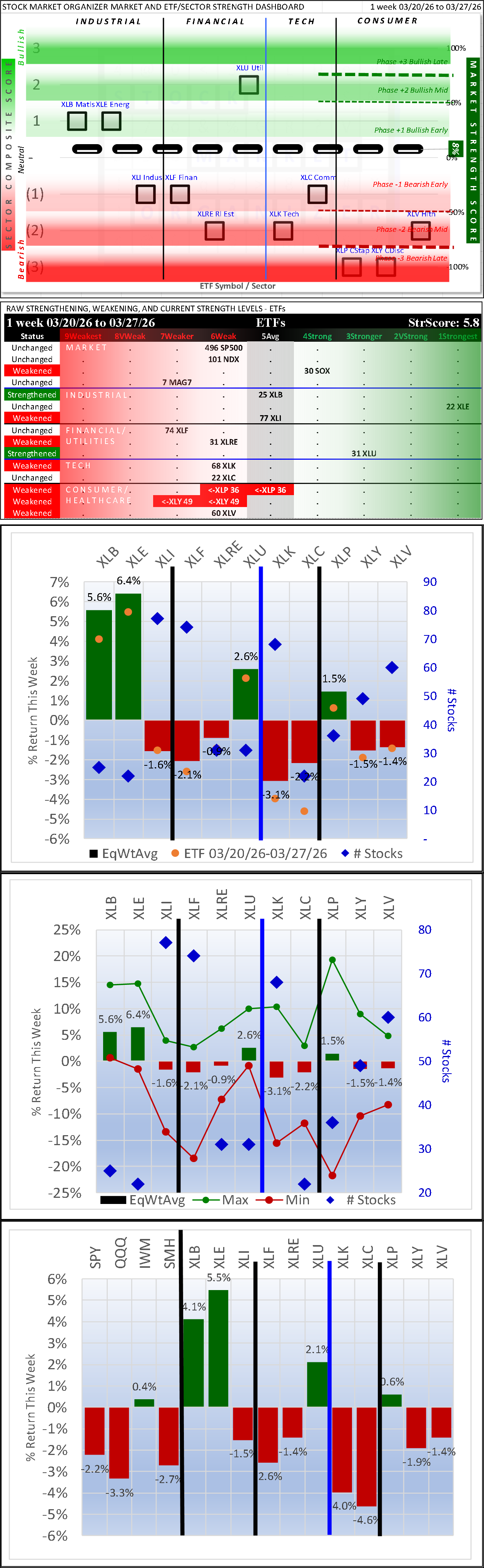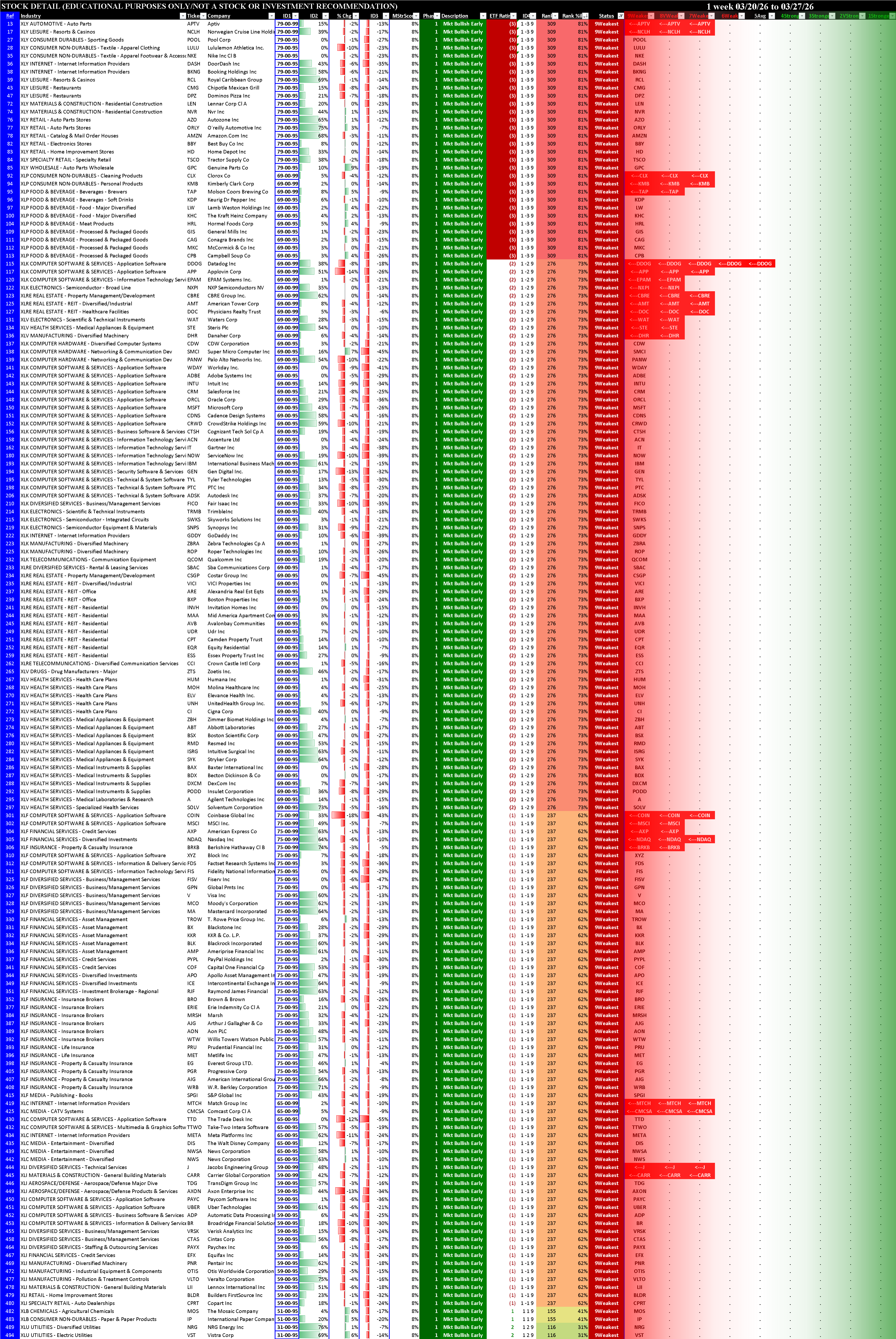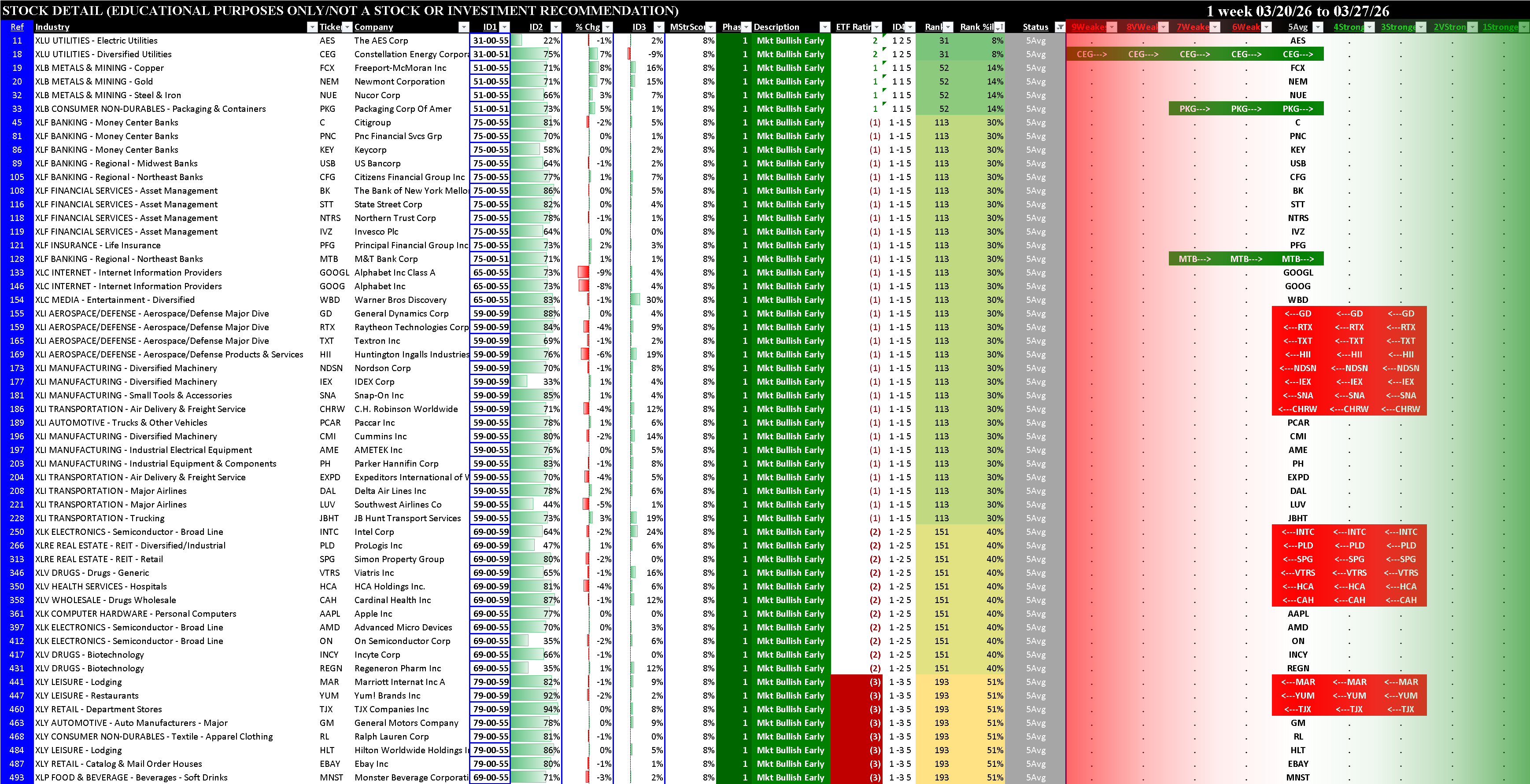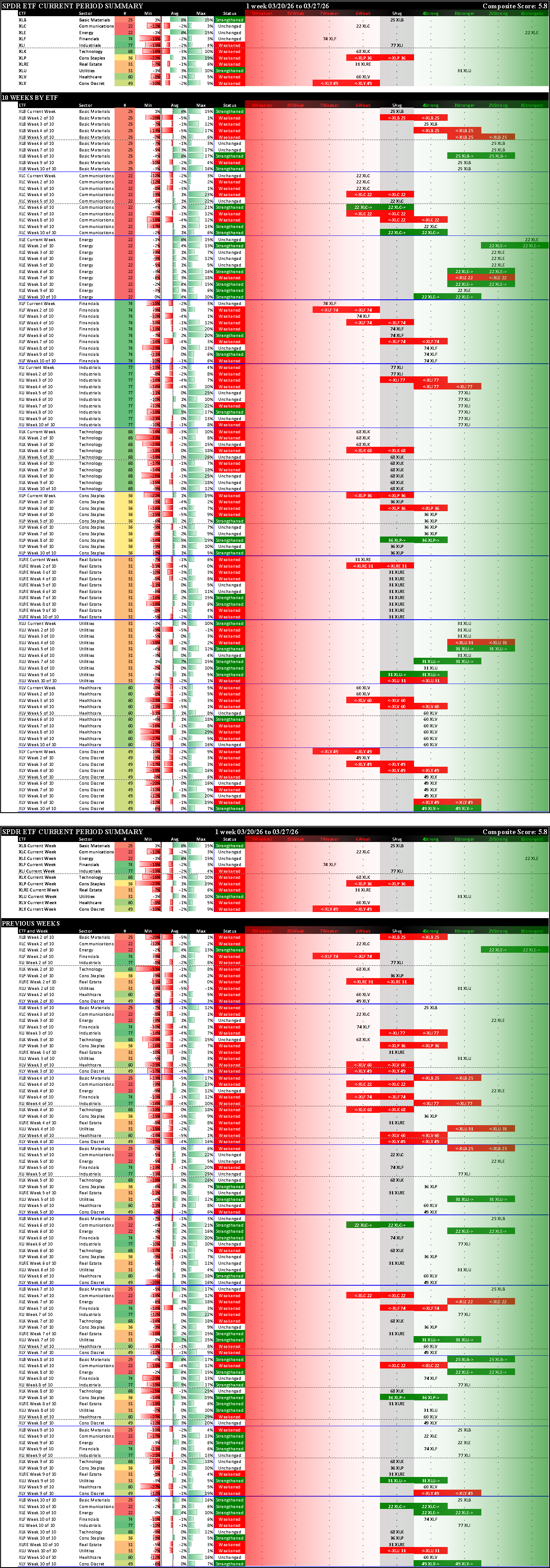 Other than XLE Energy which strengthened to 1Strongest and XLK which was unchanged at 6Weak, every other ETF weakened, three enough to change rating (XLP Consumer Discretionary, XLRE Real Estate, XLV Healthcare).