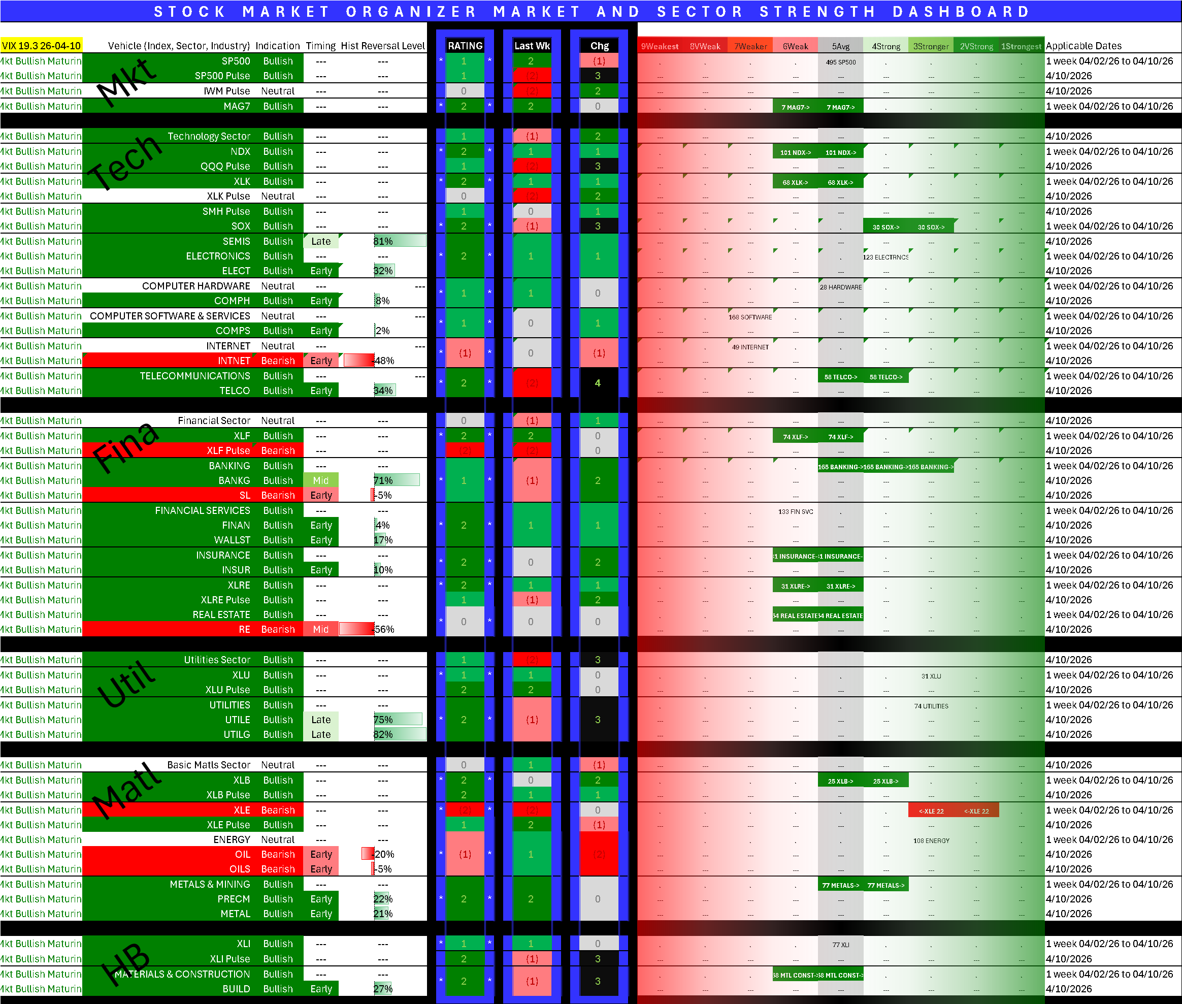 The dashboard shows widespread improvement over last week in both Tech and Financials. Oil weakened and Metals strengthened. Homebuilders strengthened.