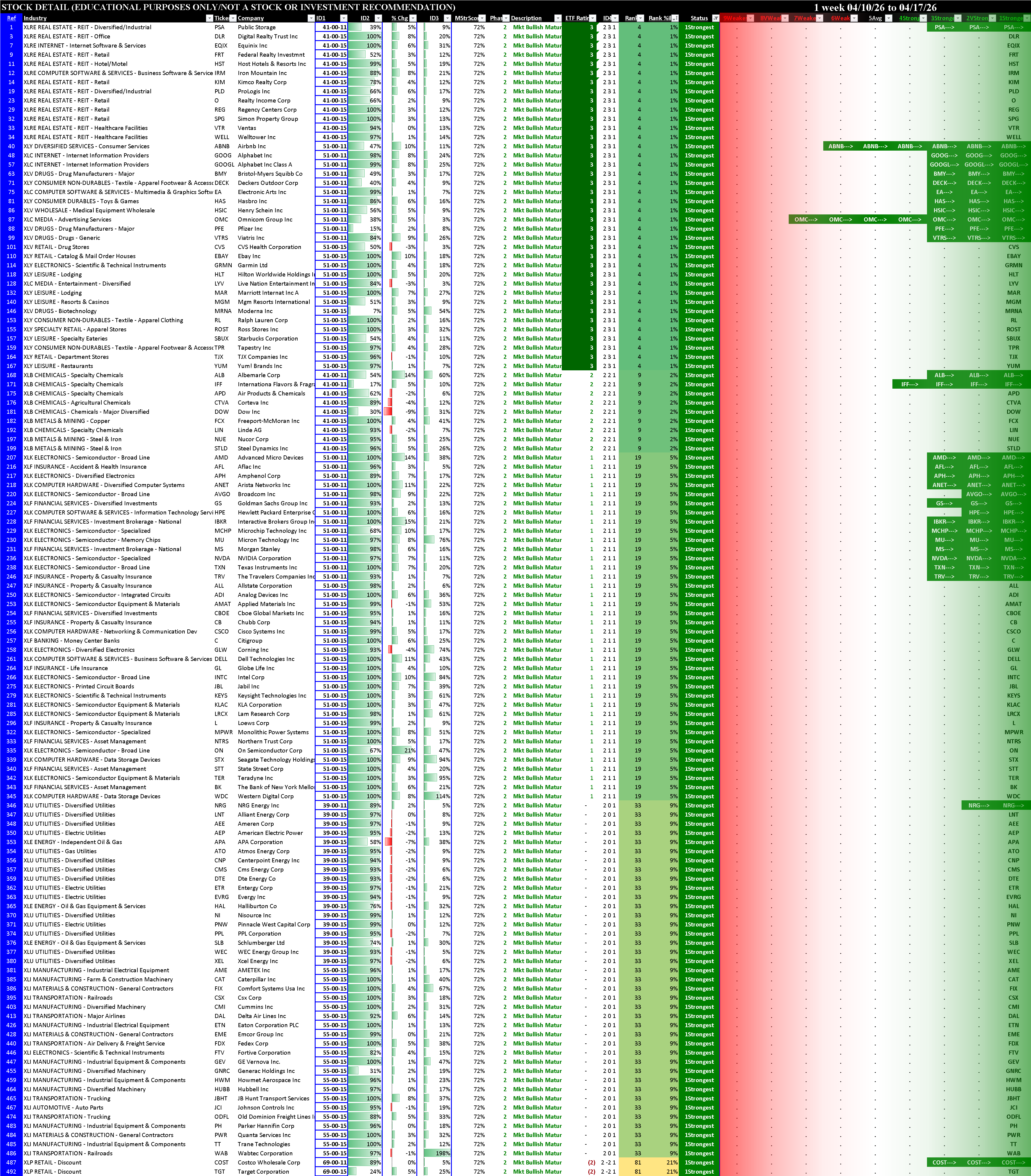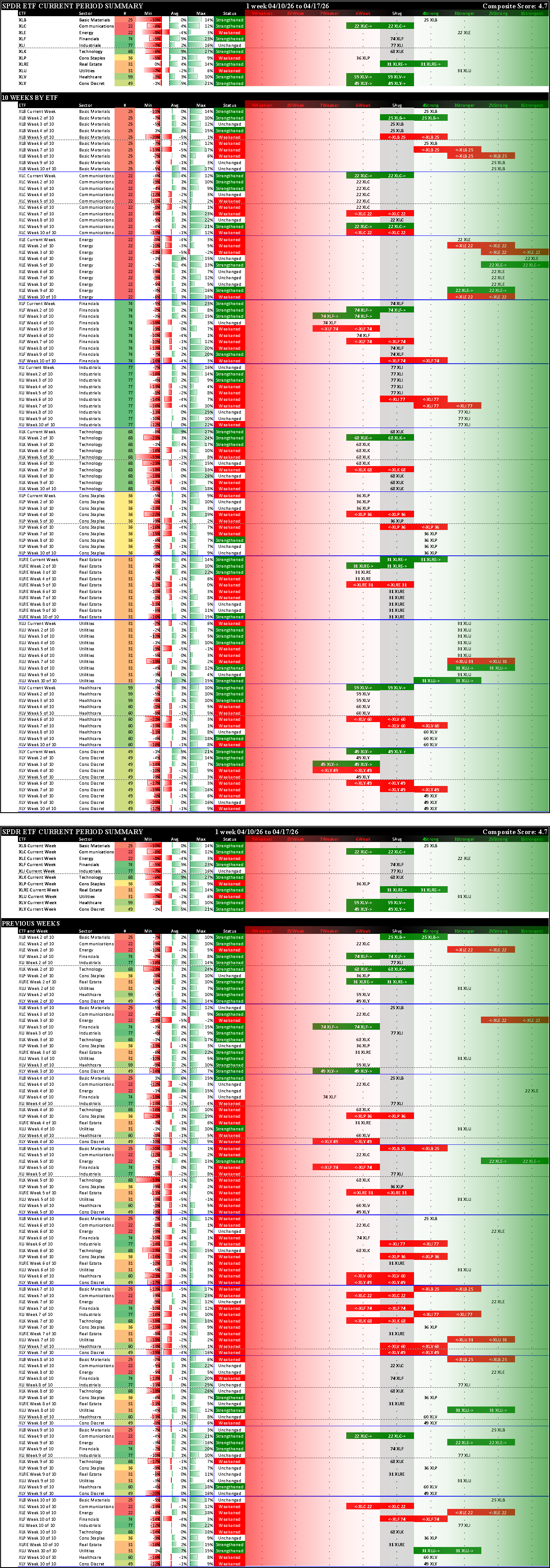The column labeled "Rating" reflects this week's strength (based on this system's criteria) of the individual index, sector, or industry vehicle. Note also the columns which show last week's score and the change from last week's score.