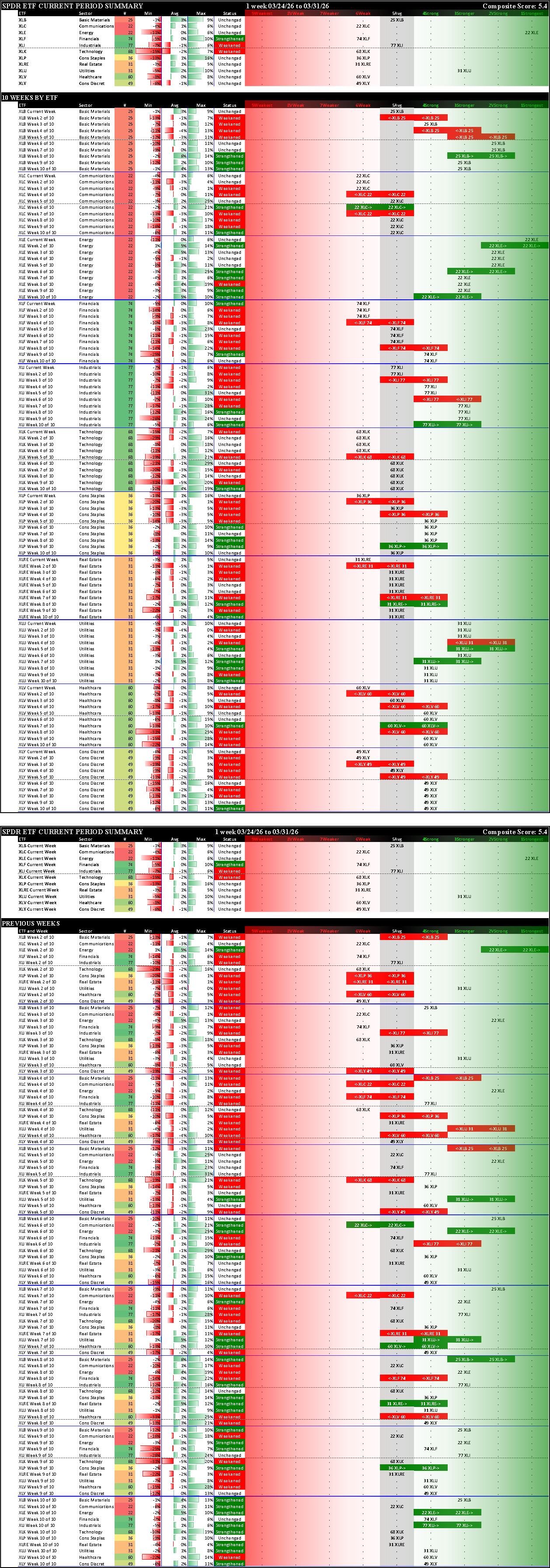 The column labeled "Rating" reflects this week's strength (based on this system's criteria) of the individual index, sector, or industry vehicle. Note also the columns which show last week's score and the change from last week's score.