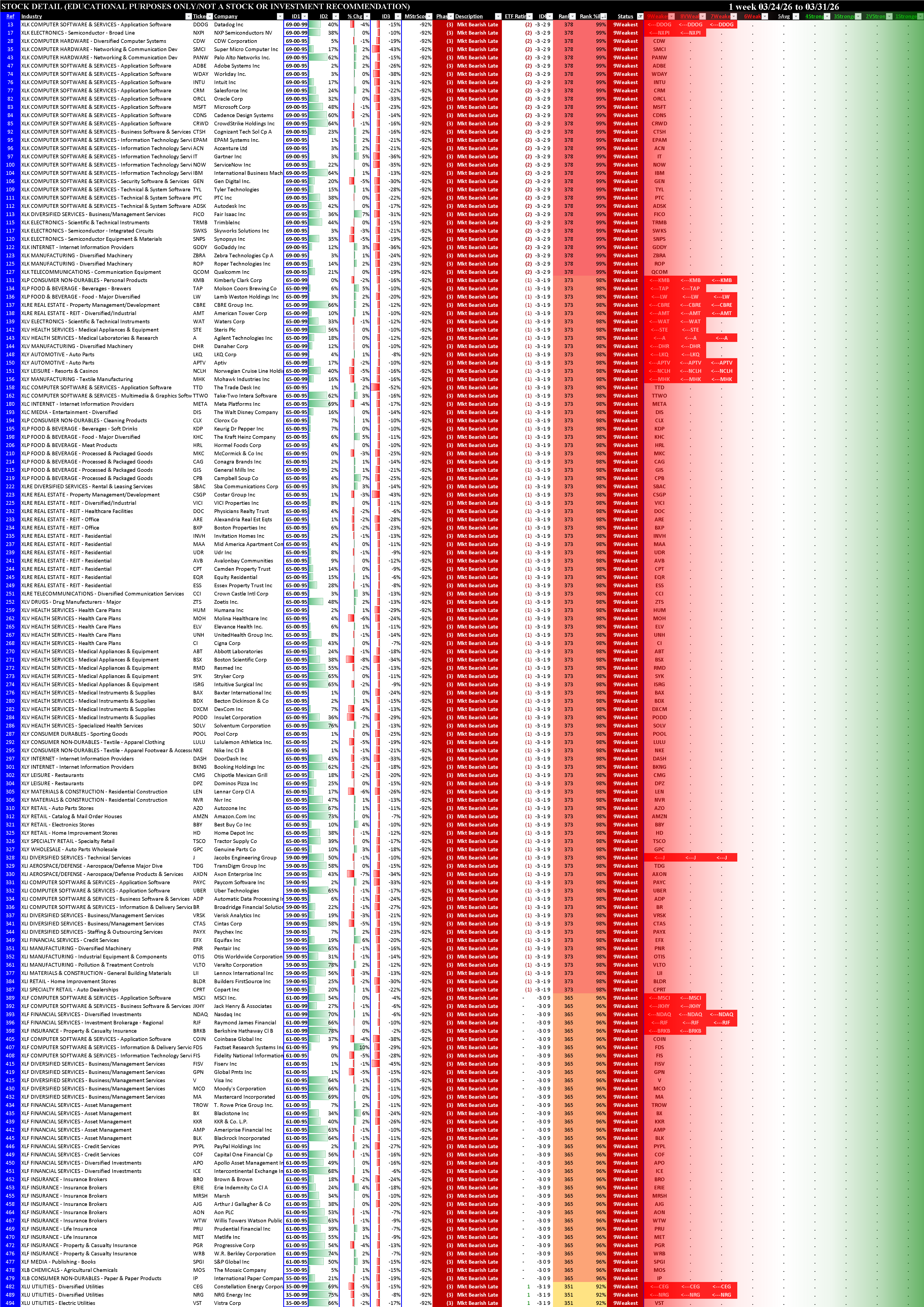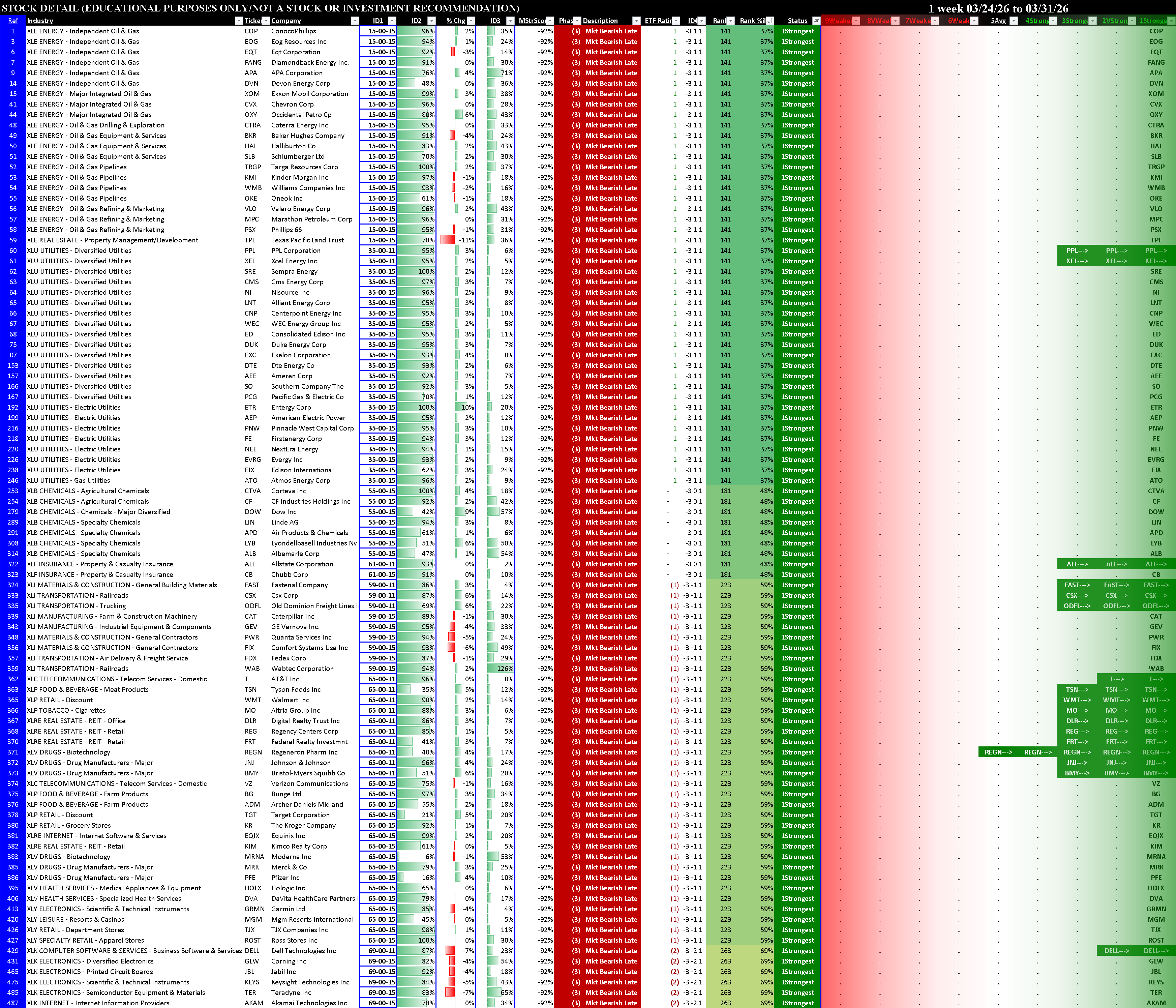 The dashboard is widespread red except in Basic Materials. The red in Financials is broad-based but showed some improvement. Semis/Electronics had a rough week. Utilities improved. Energy/Oil remains strong. Metals improved.