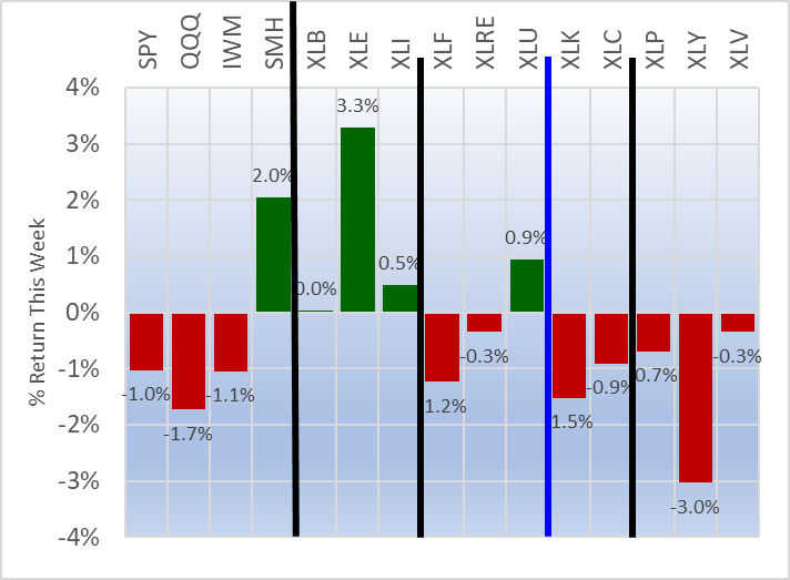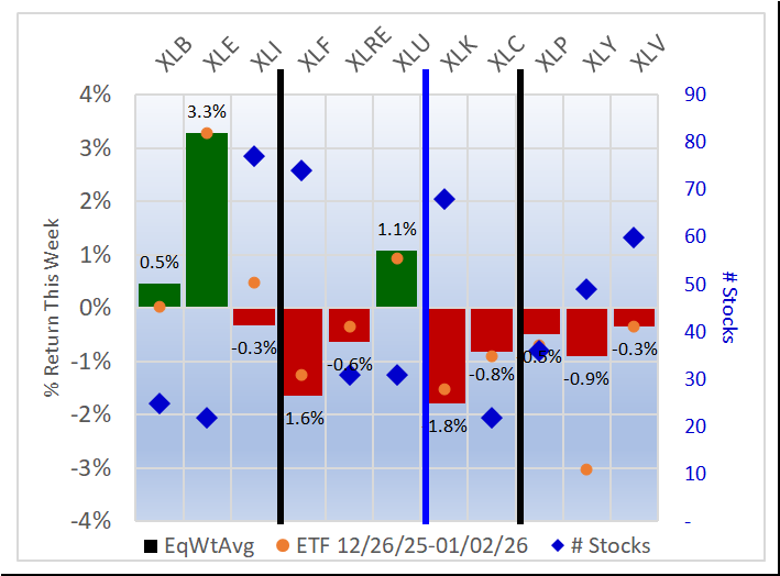 Weekly returns re-cap - the first chart below shows the equal weight returns for the 11 ETFs and the second shows the returns for four indexes and the 11 ETFs.