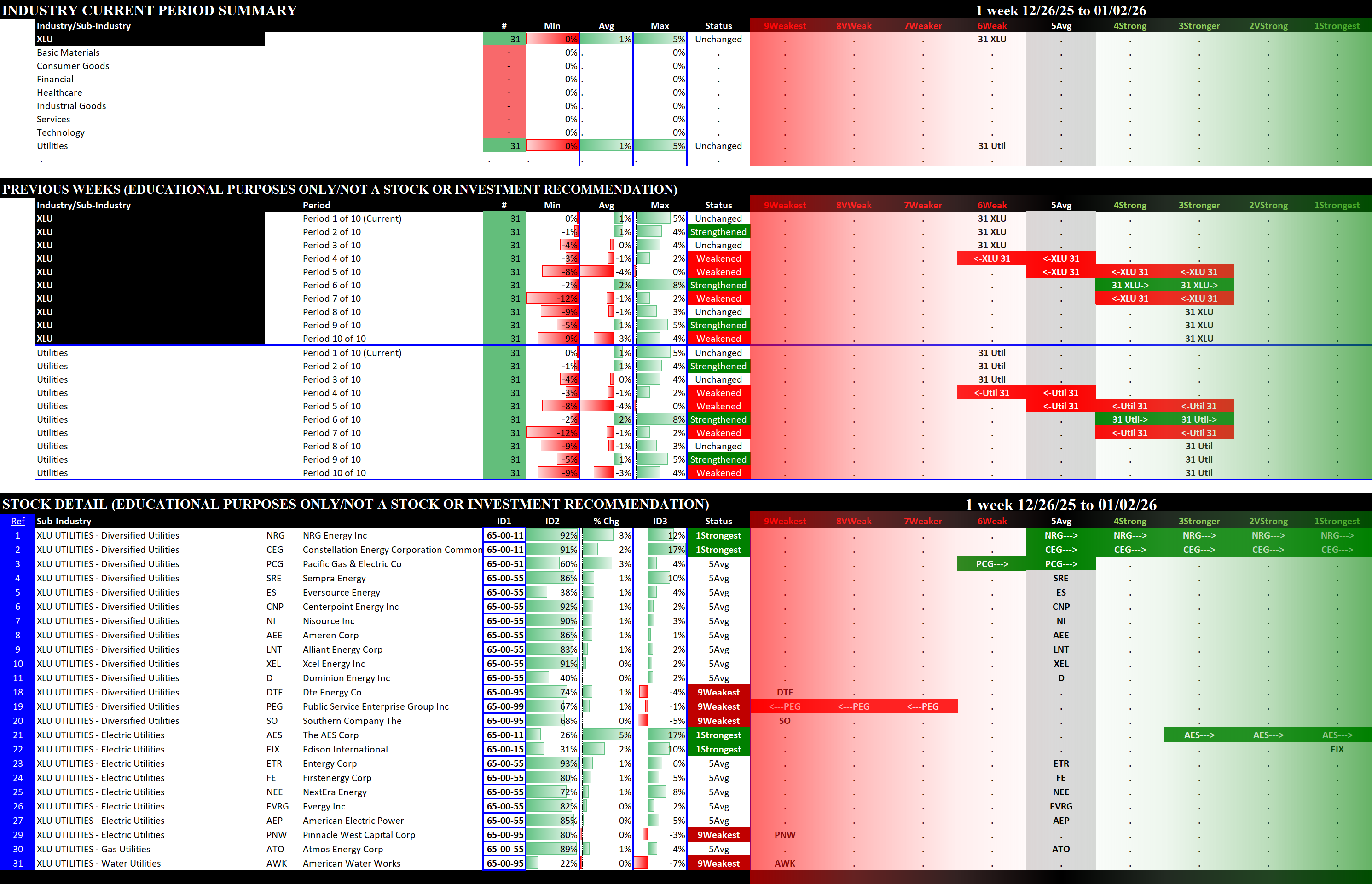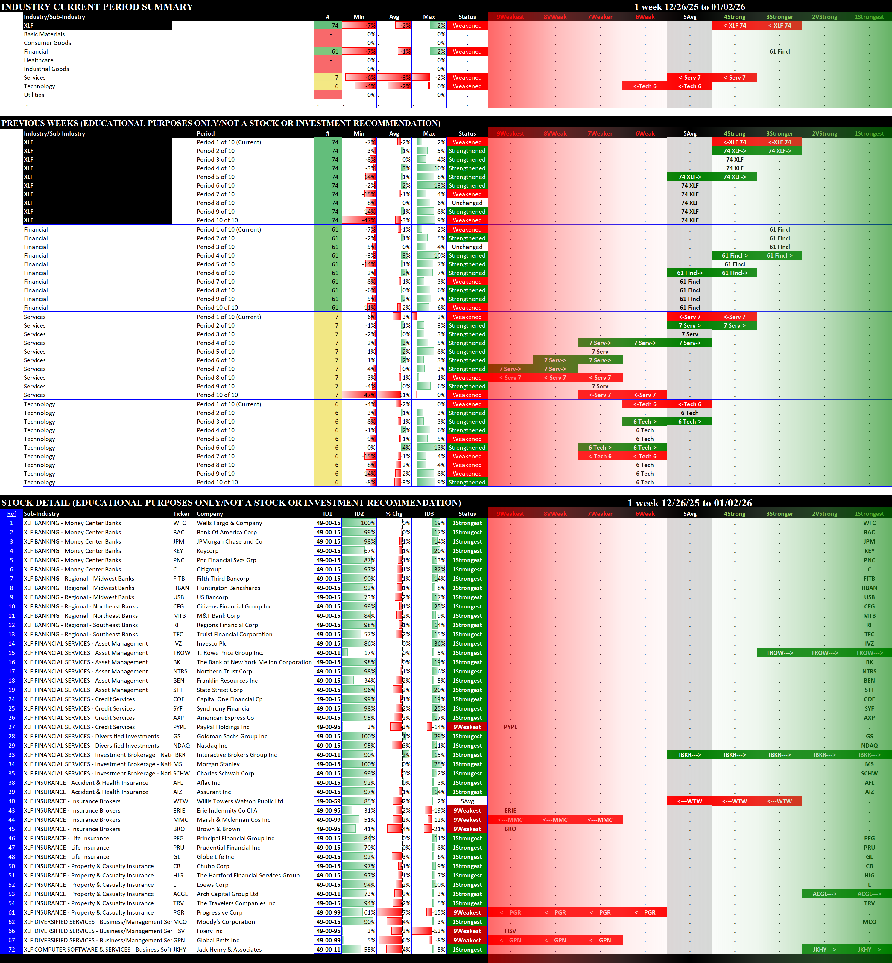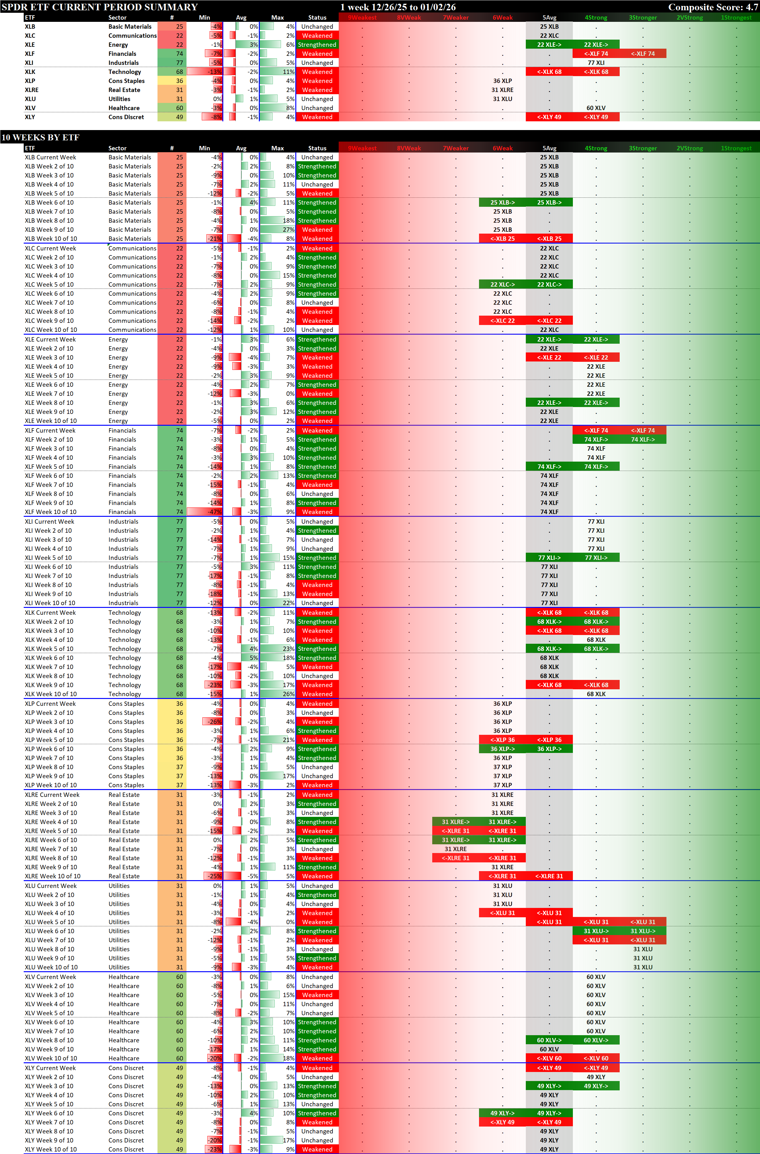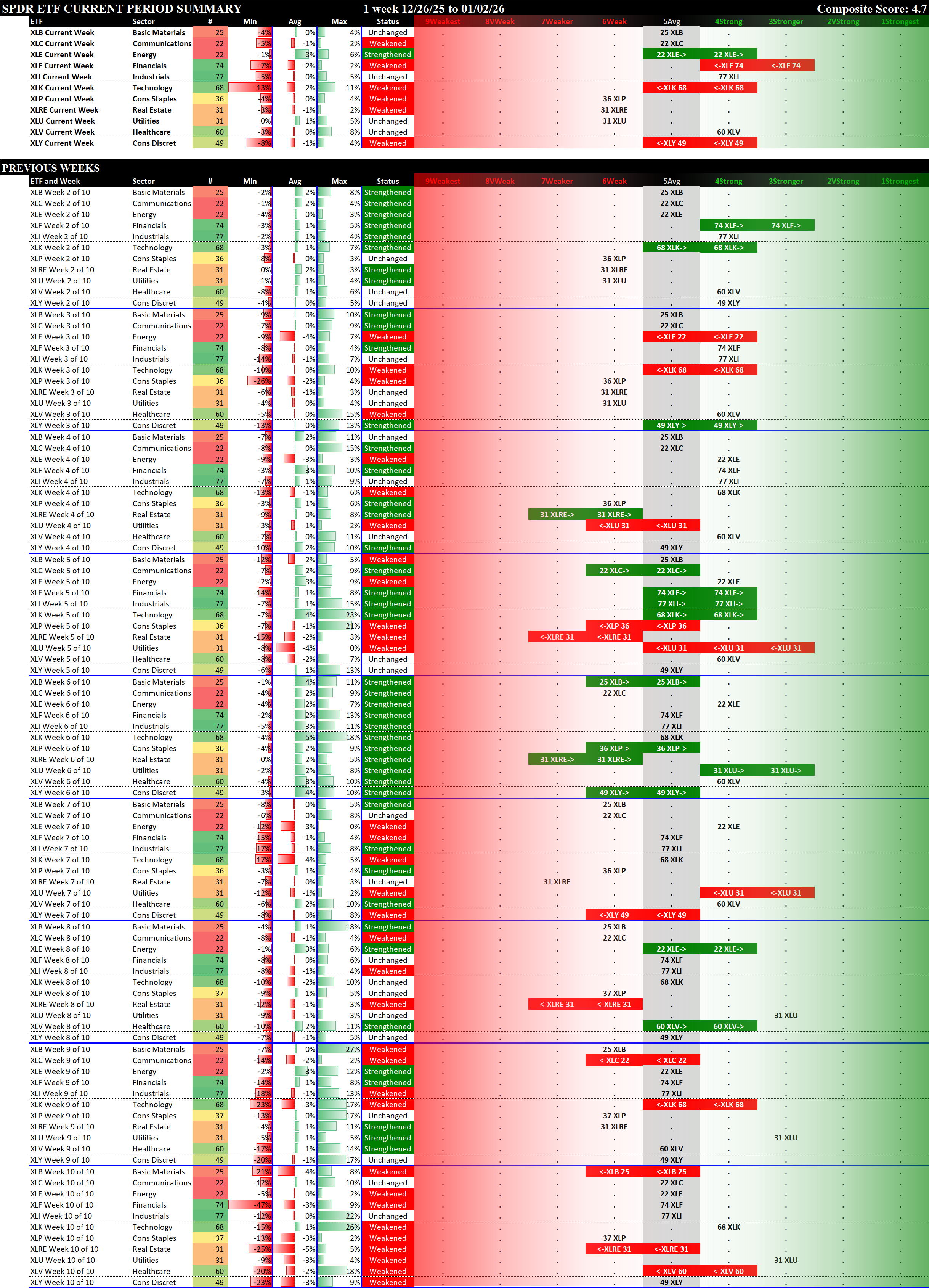 Referred to as Spectrum format (these are presented as the spectrum of possibilities from 9Weakest to 1Strongest), here are the raw strength readings for each sector with their change for the just-completed week: