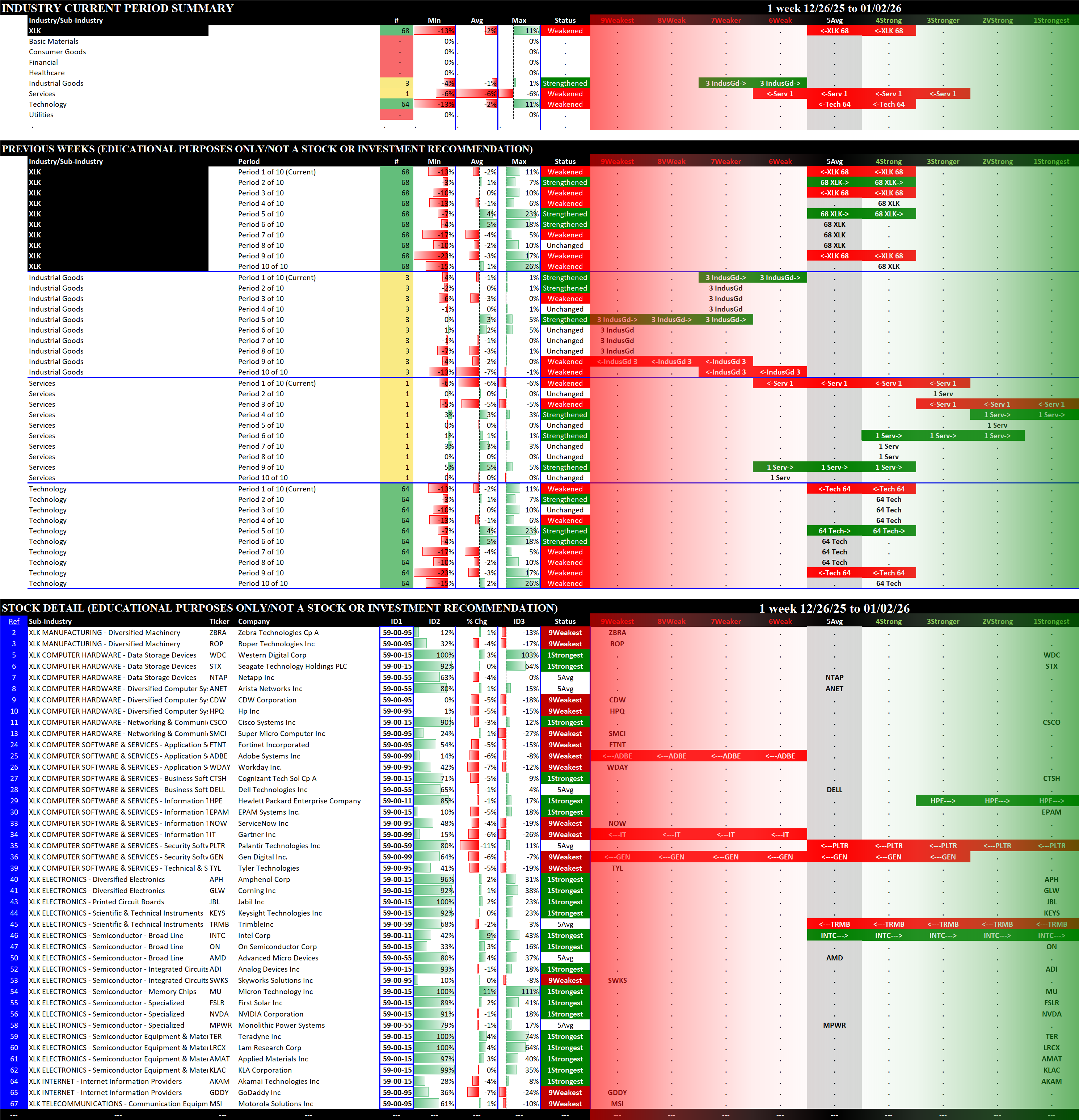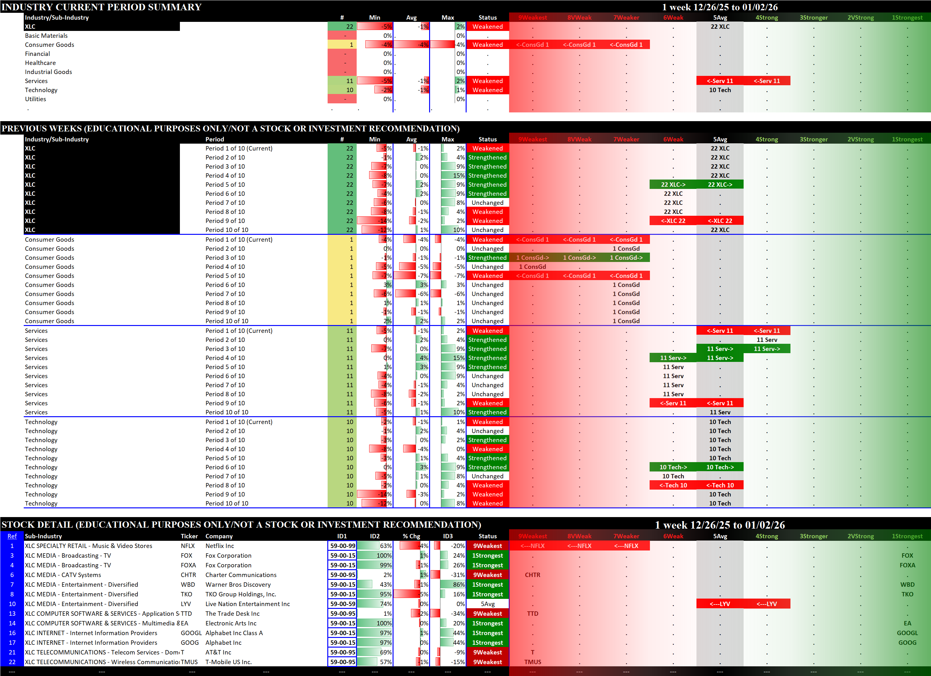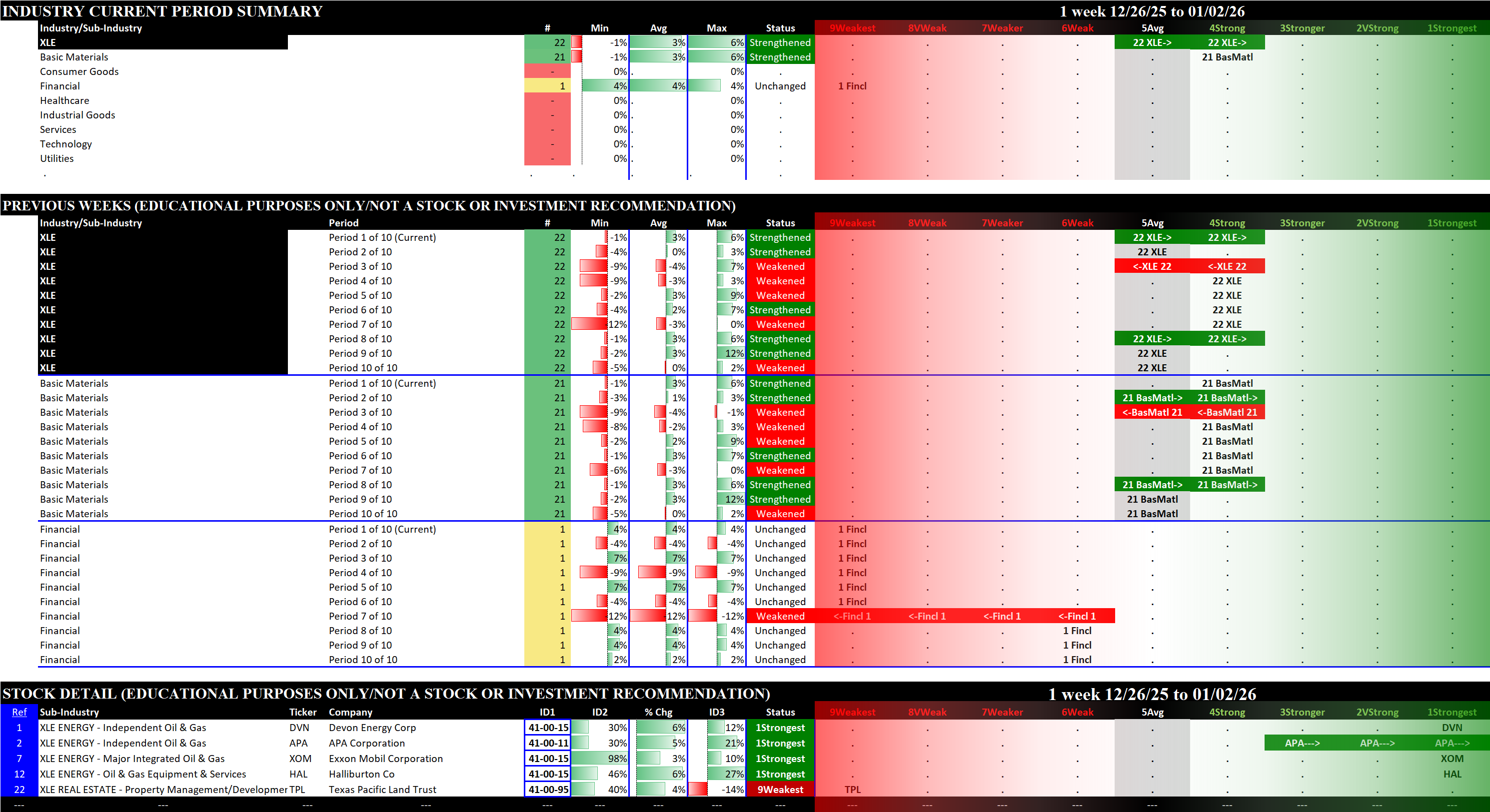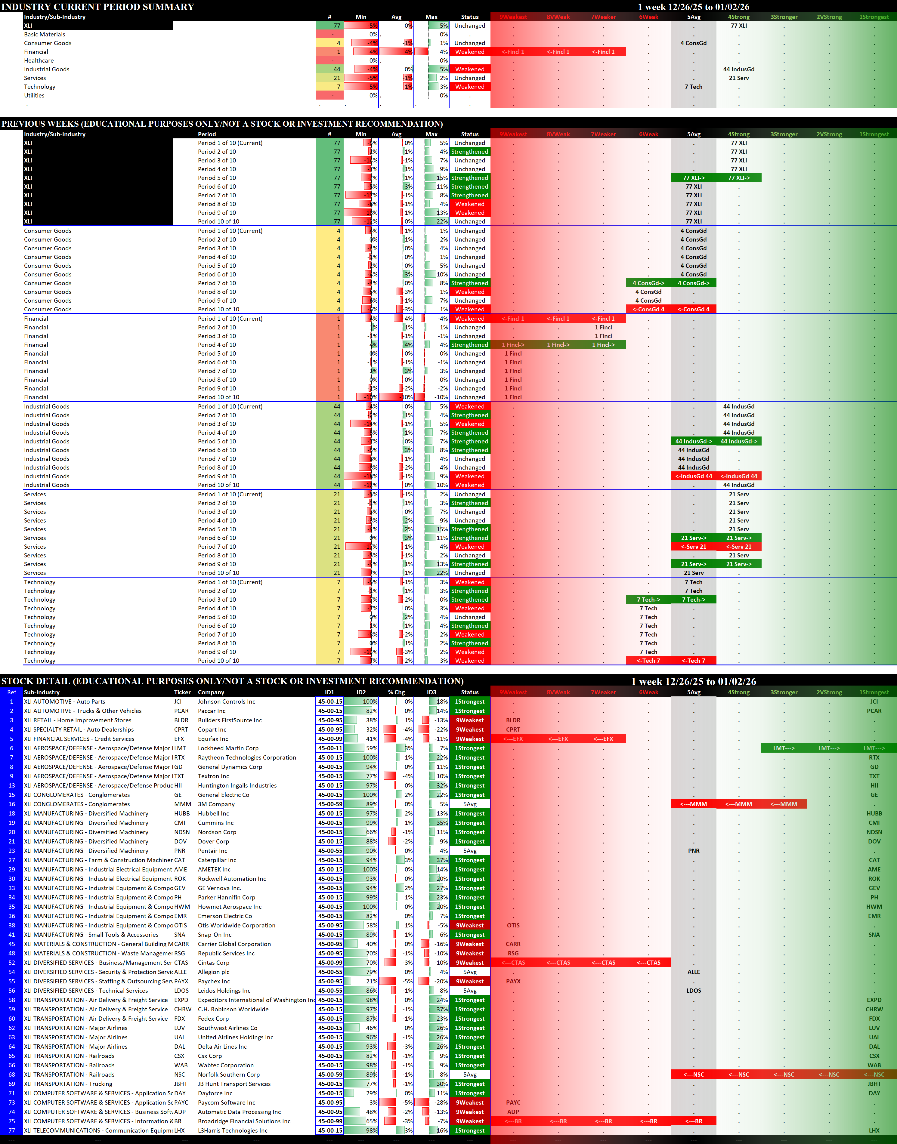 Referred to as Spectrum format (these are presented as the spectrum of possibilities from 9Weakest to 1Strongest), here are the raw strength readings for each sector with their change for the just-completed week: