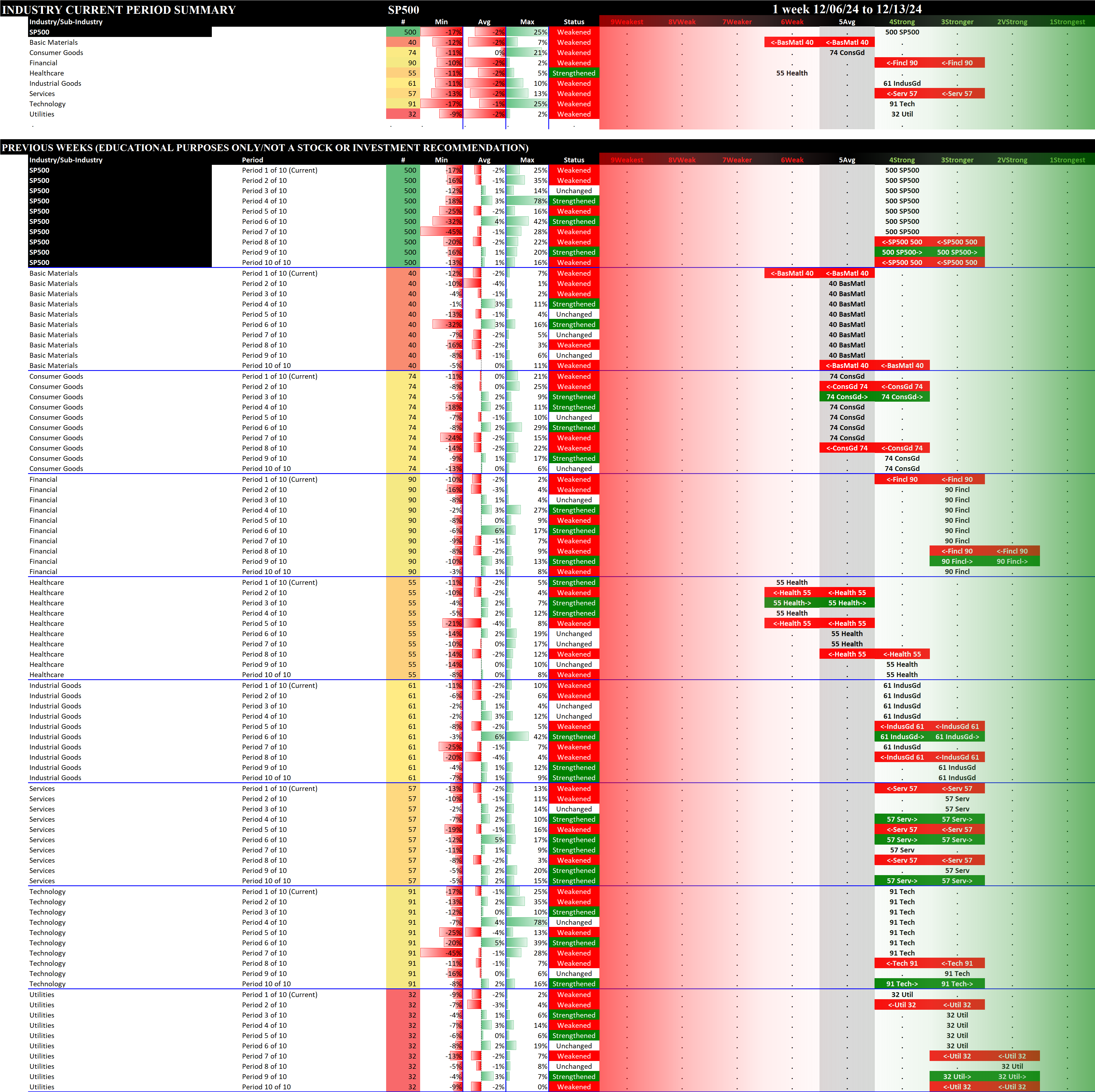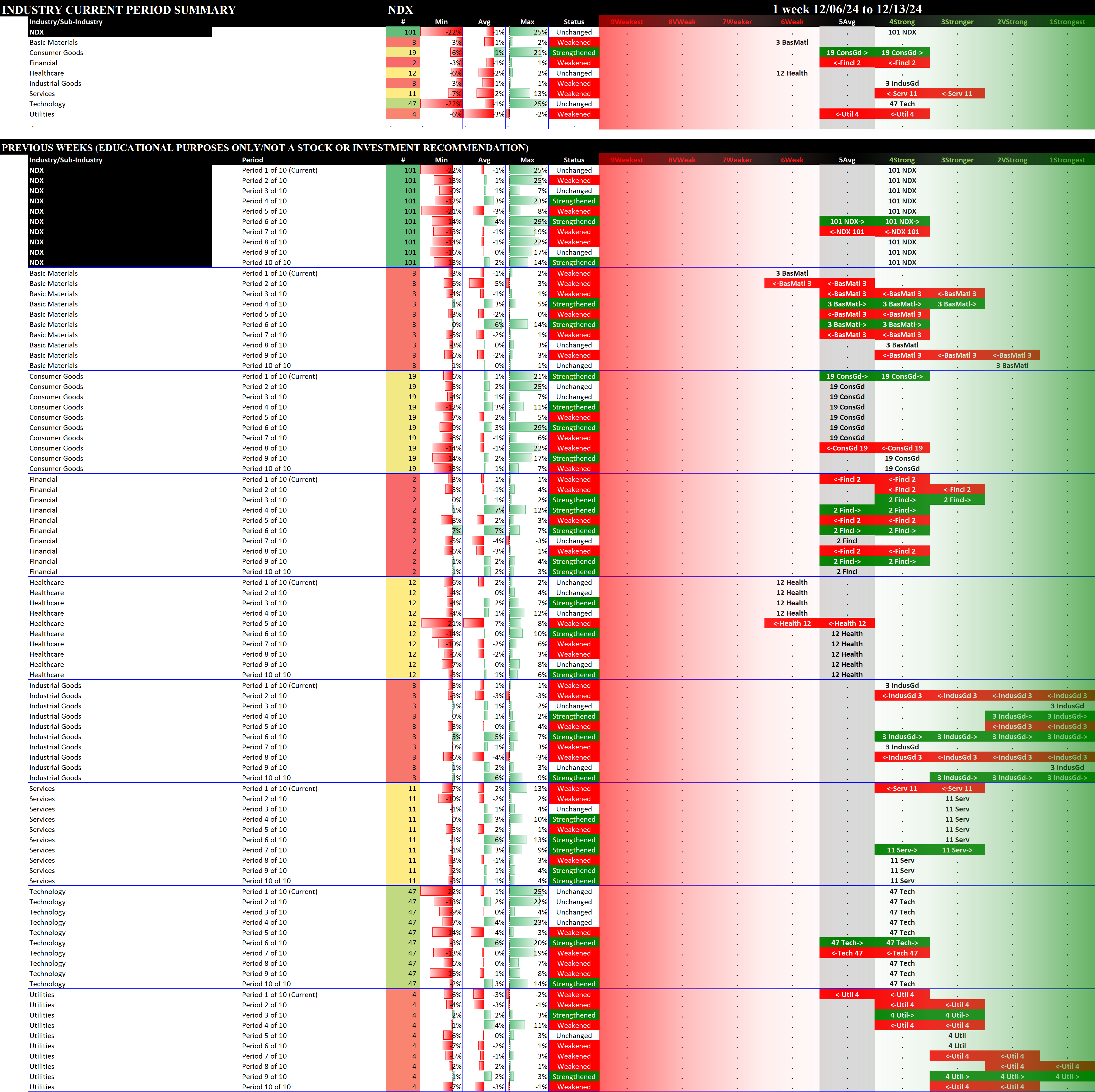This analysis provides a Stock Market Organizer summary view of the S&P 500 and Nasdaq 100 for the week ended Friday, 12/13/24. This means this is a stock-by-stock strength analysis of the component stocks for each index, aggregated upward in level to the sector and index levels.