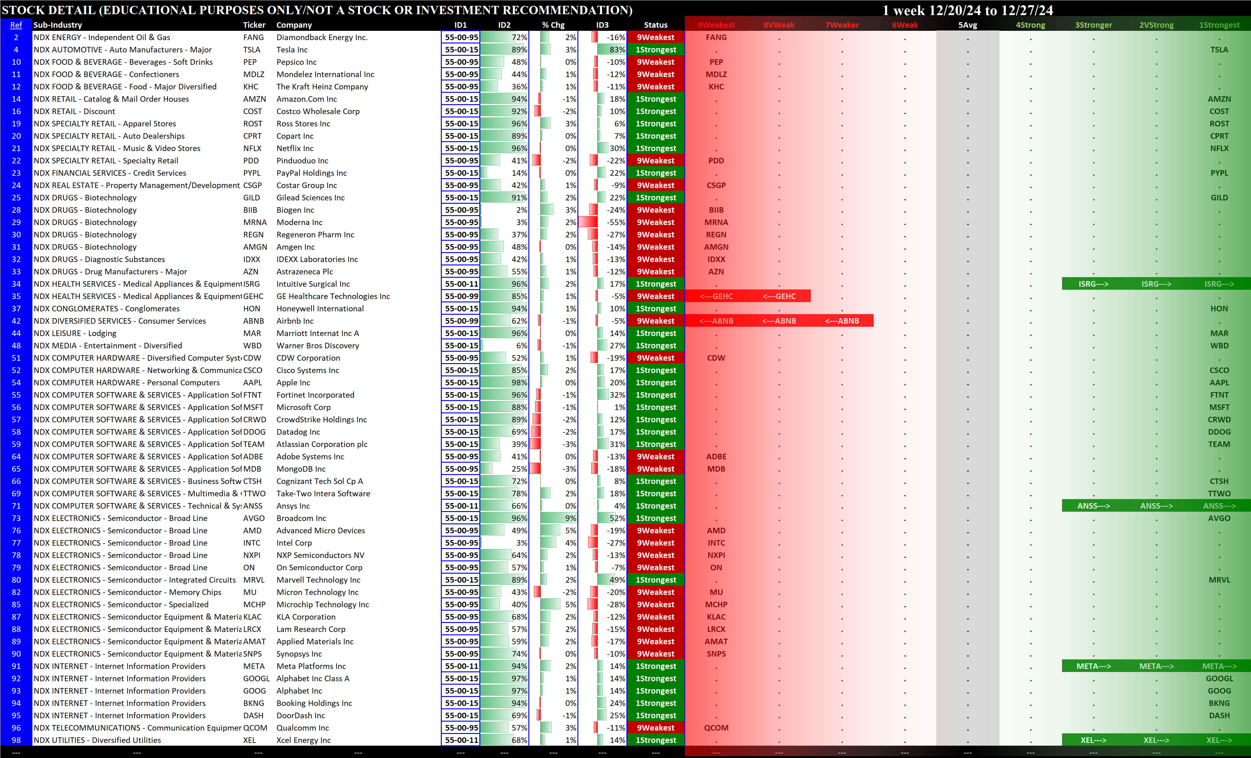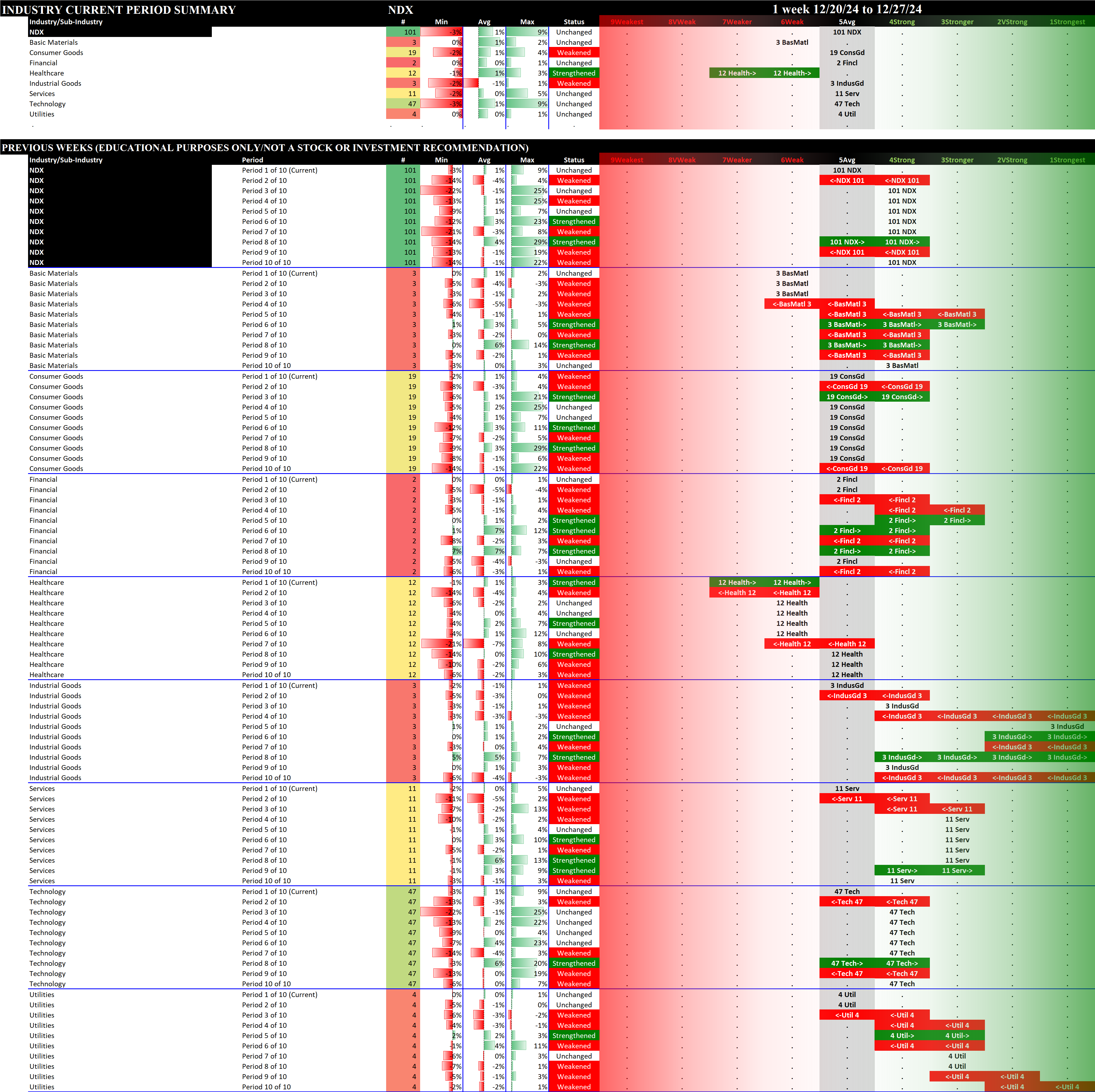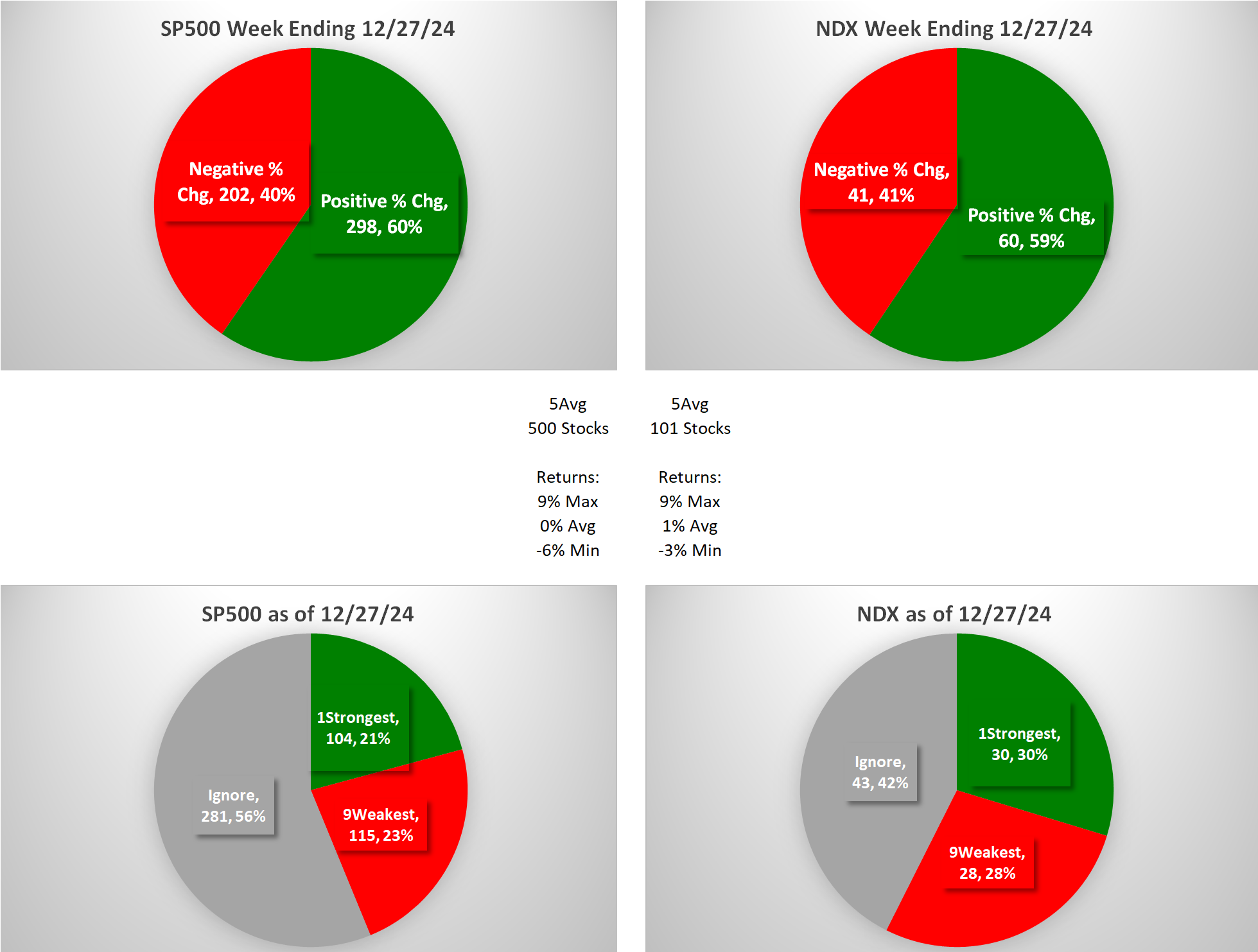 This analysis provides a Stock Market Organizer summary view of the S&P 500 and Nasdaq 100 for the week ended Friday, 12/27/24. This means this is a stock-by-stock strength analysis of the component stocks for each index, aggregated upward in level to the sector and index levels.