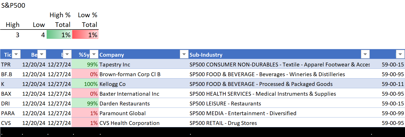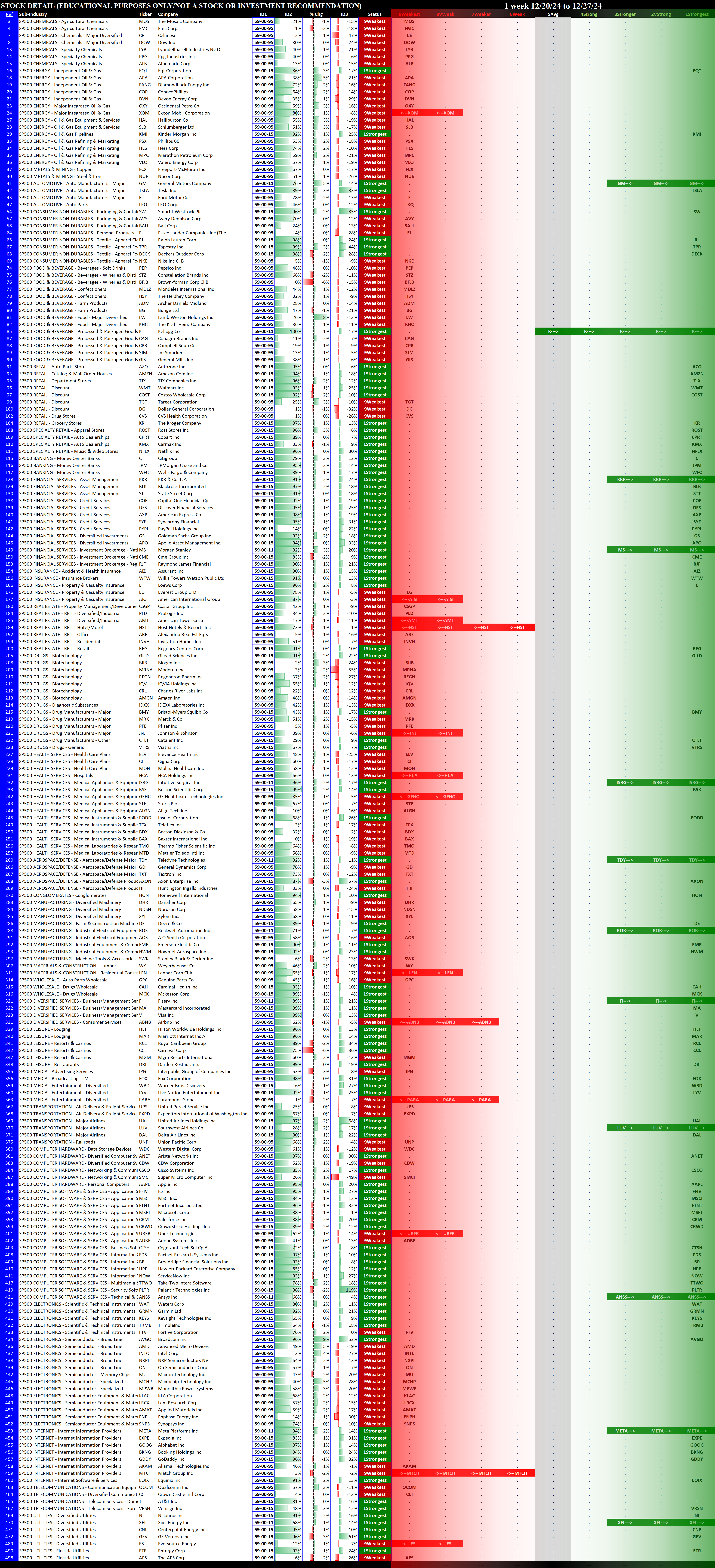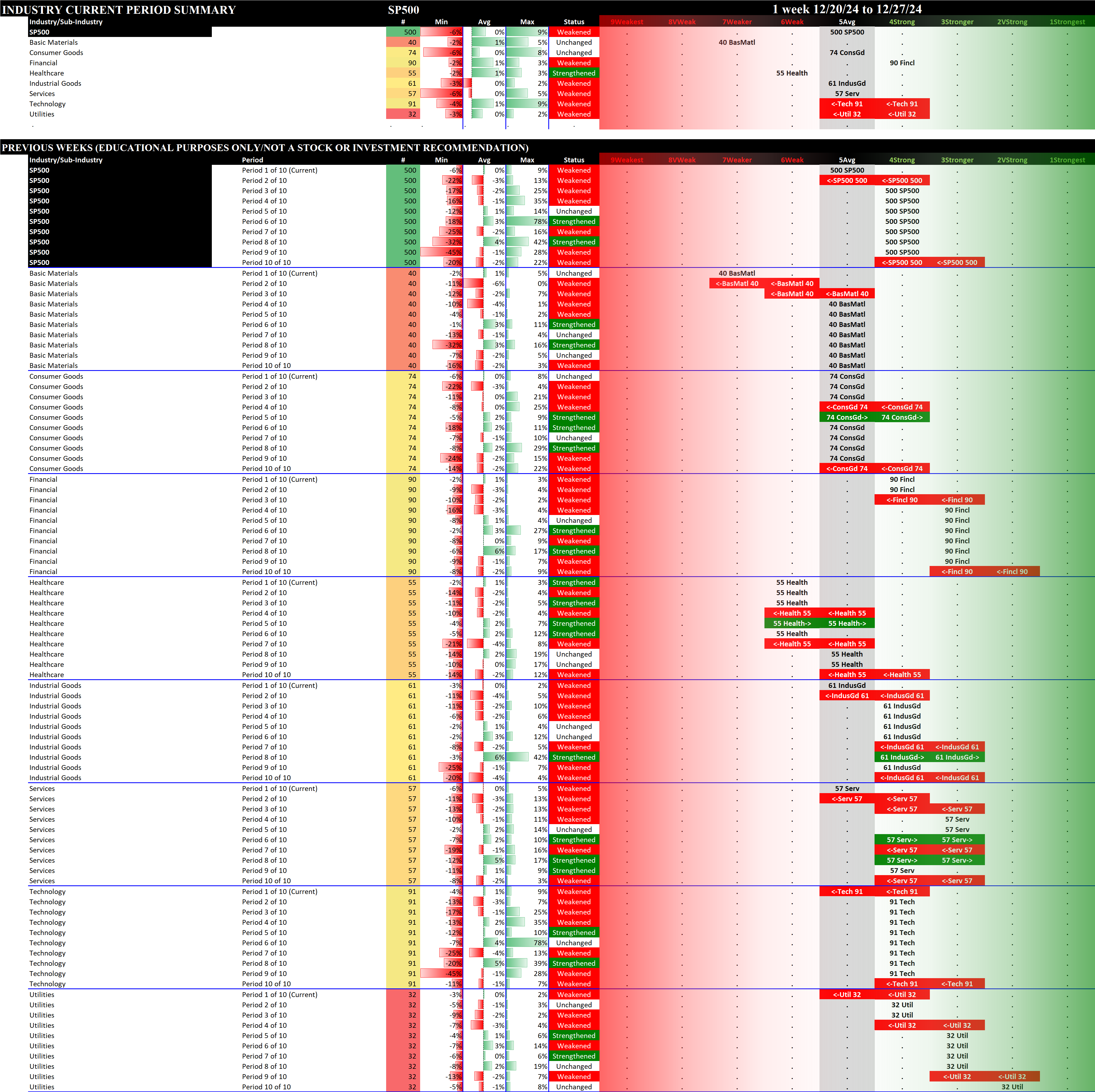 This analysis provides a Stock Market Organizer summary view of the S&P 500 and Nasdaq 100 for the week ended Friday, 12/27/24. This means this is a stock-by-stock strength analysis of the component stocks for each index, aggregated upward in level to the sector and index levels.