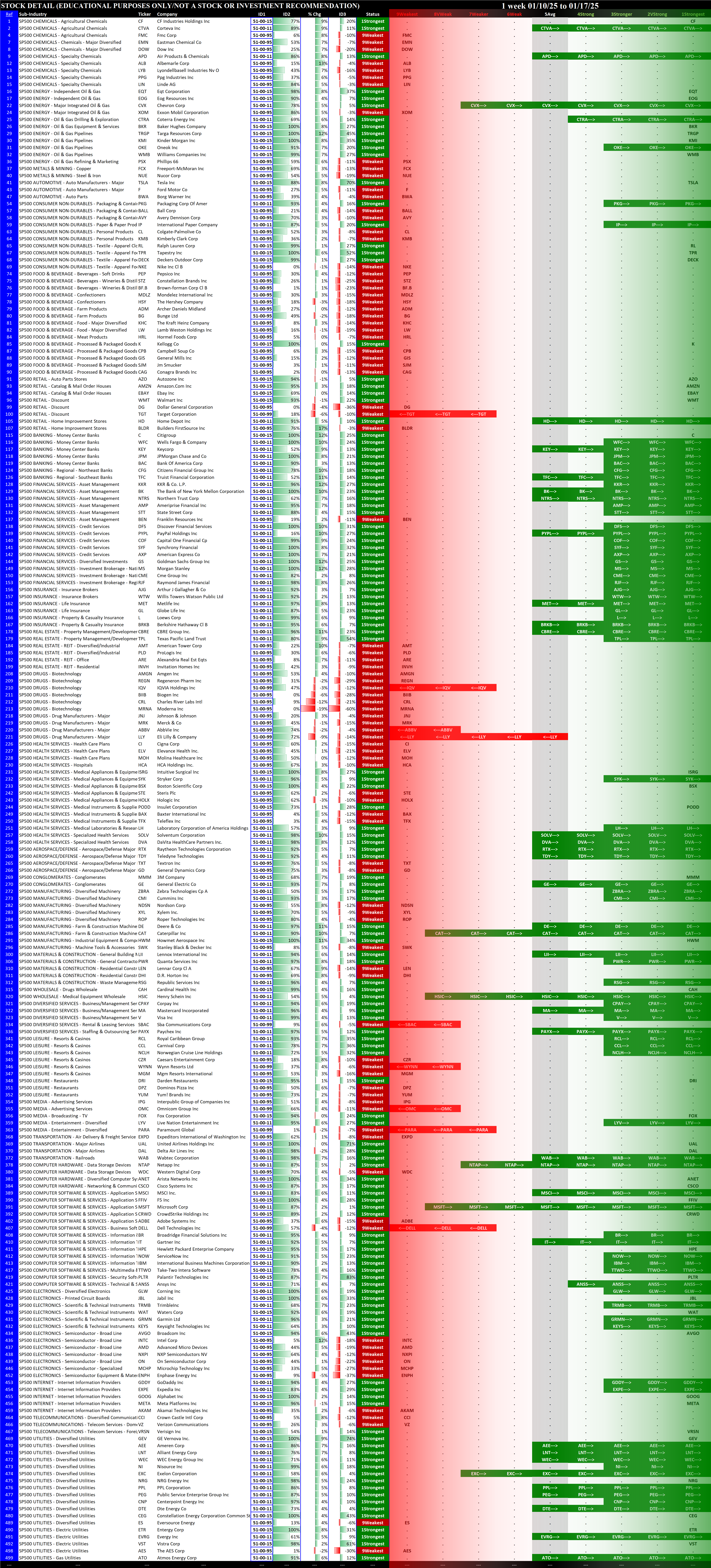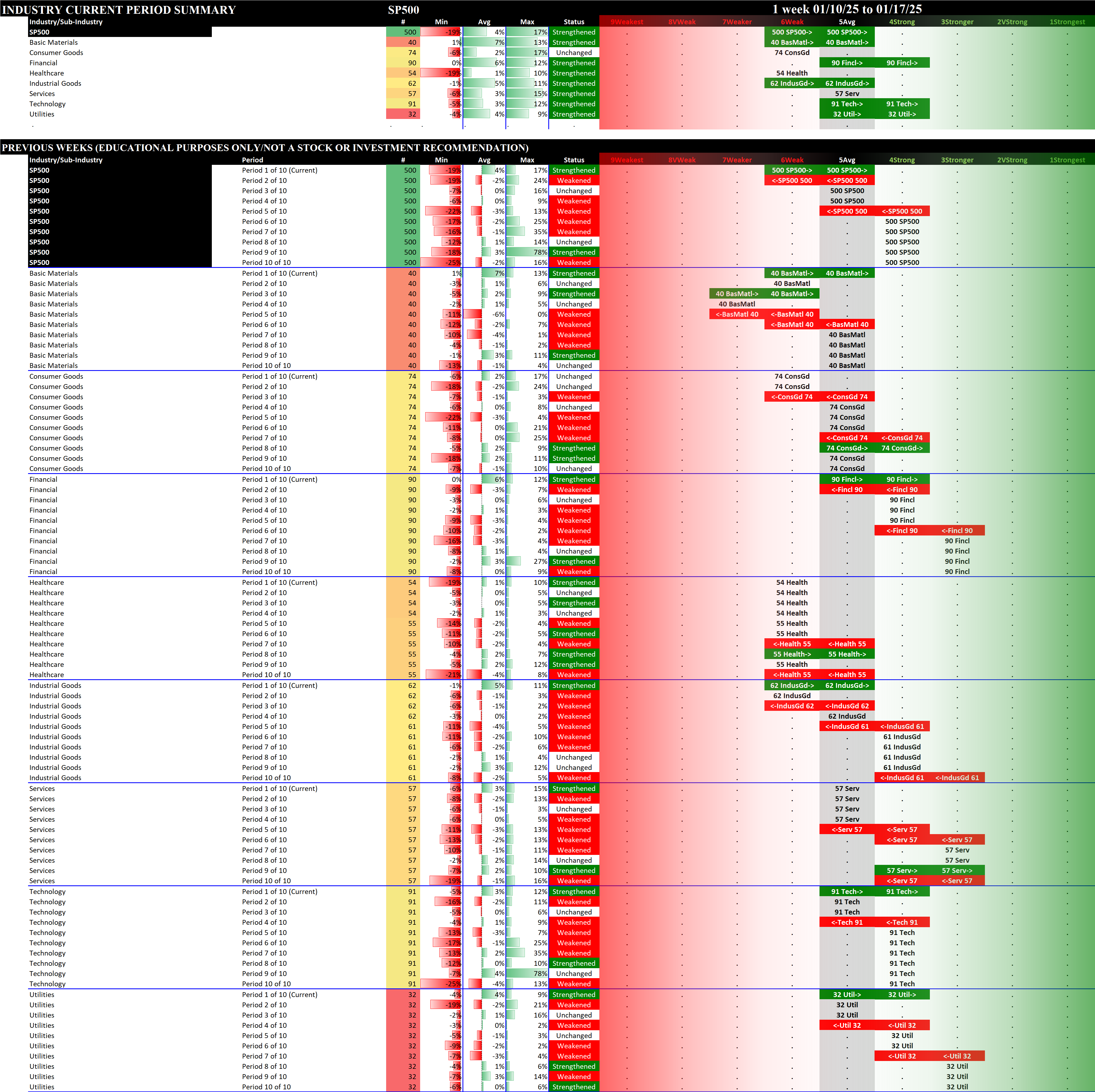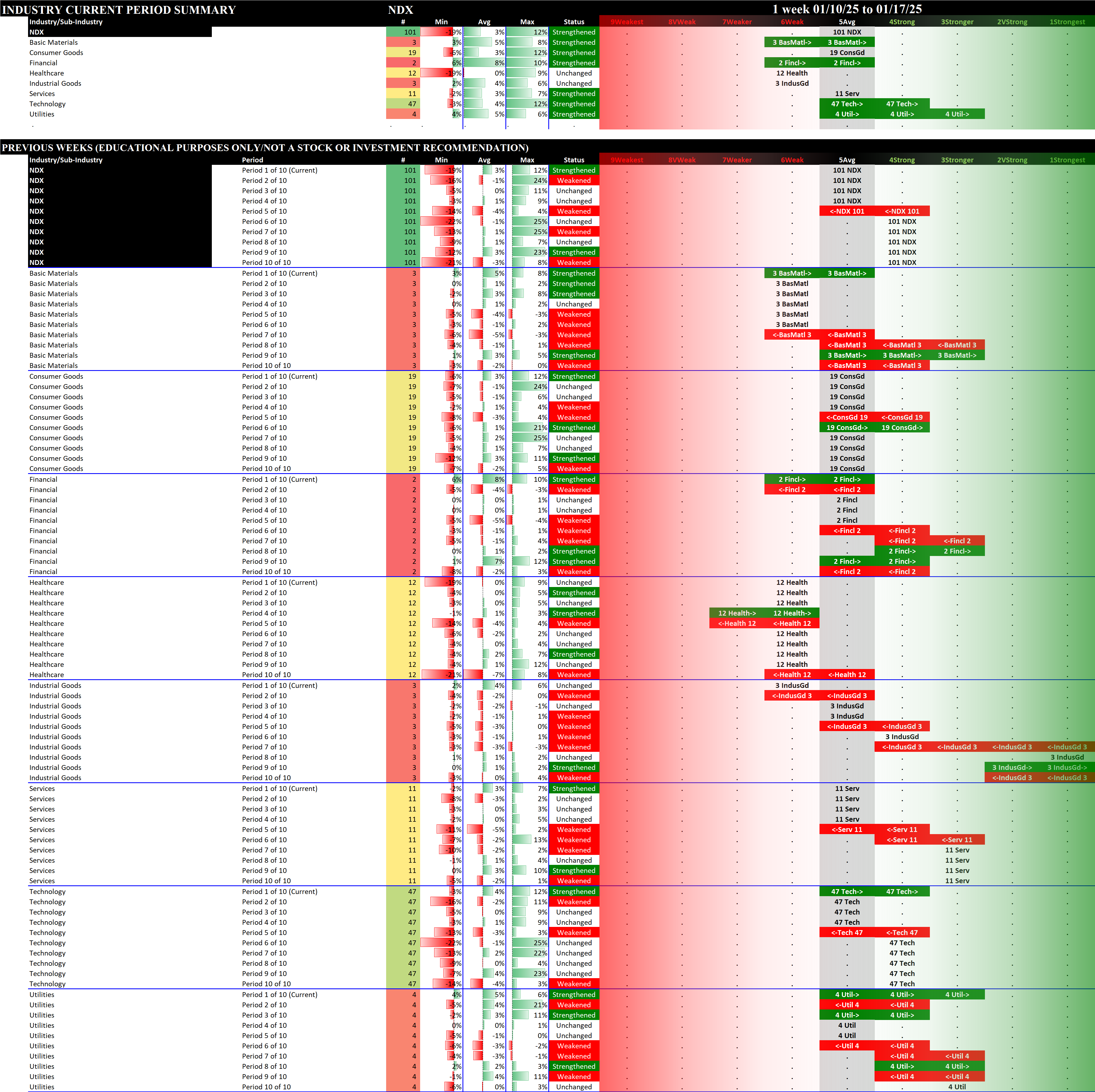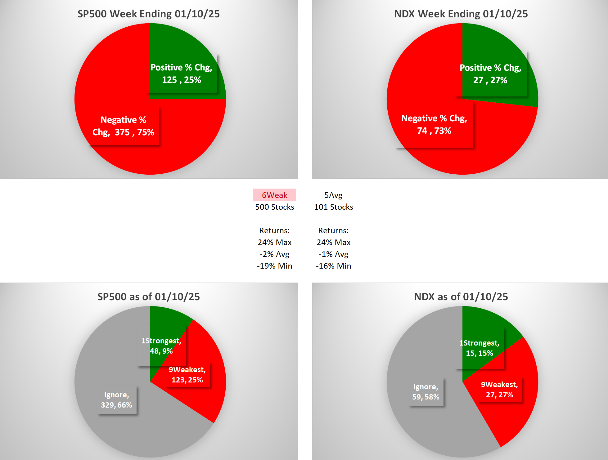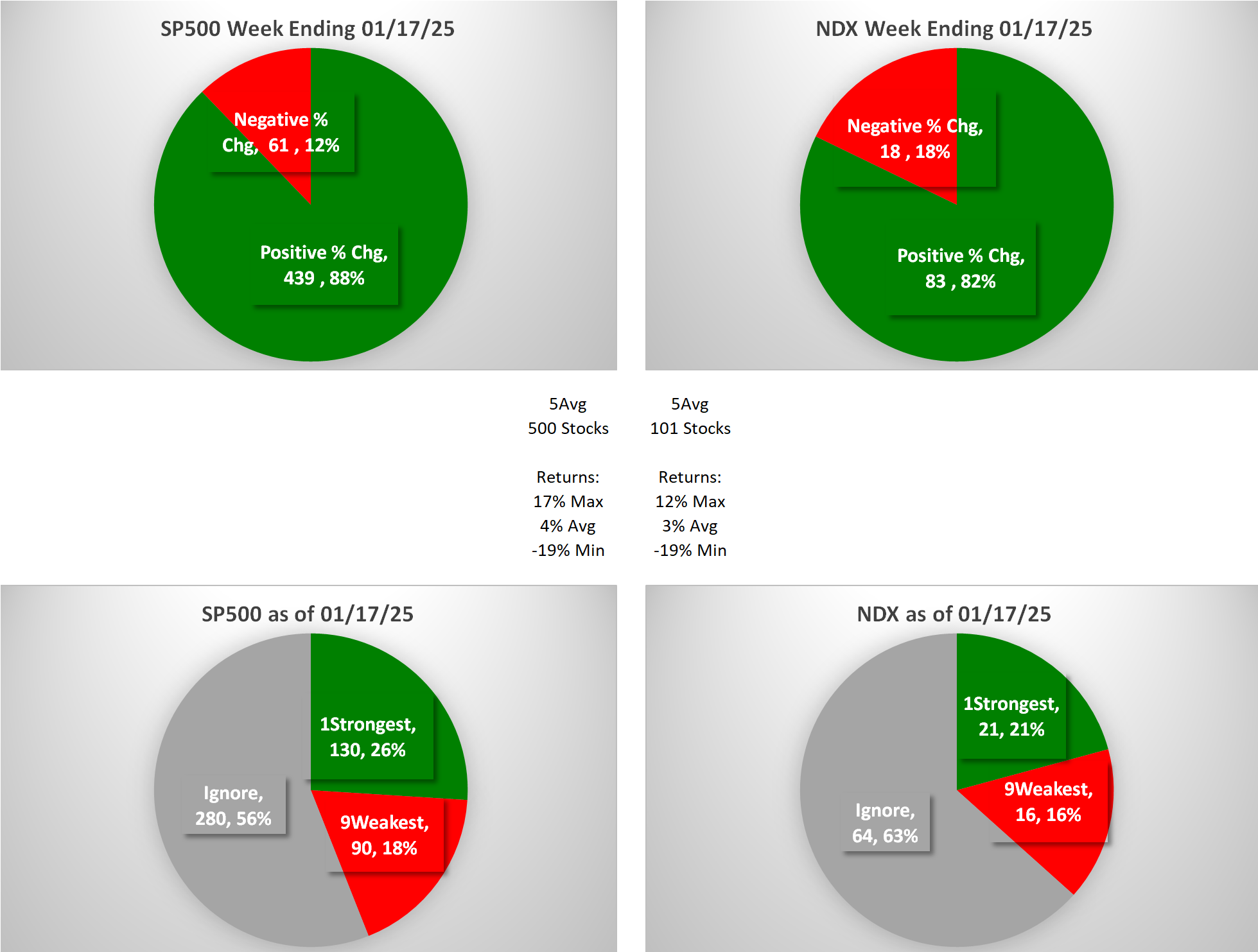 This analysis provides a Stock Market Organizer summary view of the S&P 500 and Nasdaq 100 for the week ended Friday, 01/17/25. This means this is a stock-by-stock strength analysis of the component stocks for each index, aggregated upward in level to the sector and index levels.