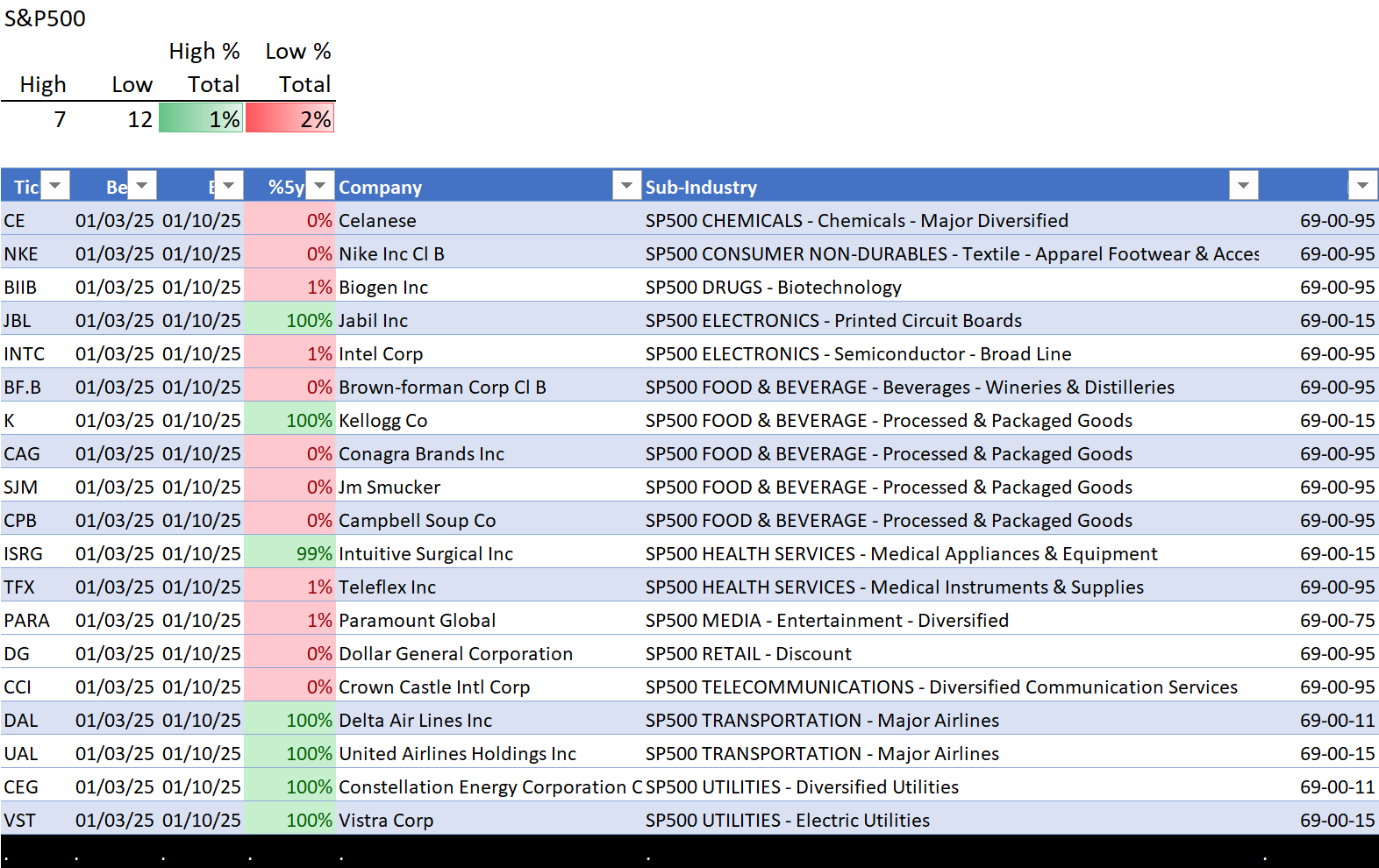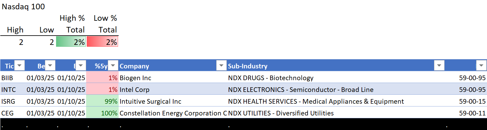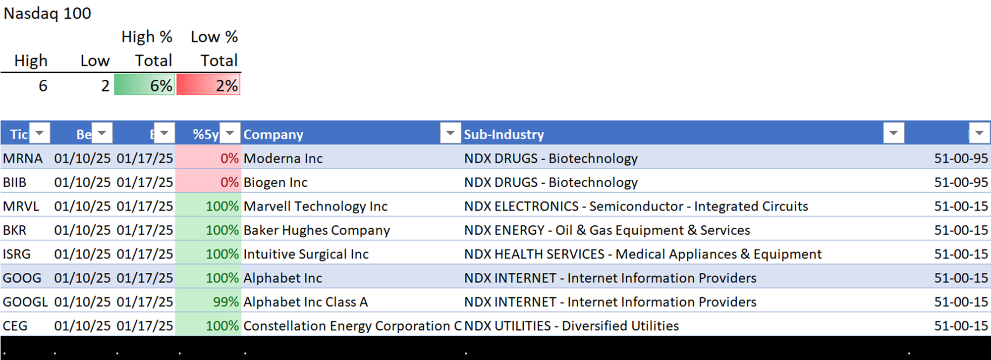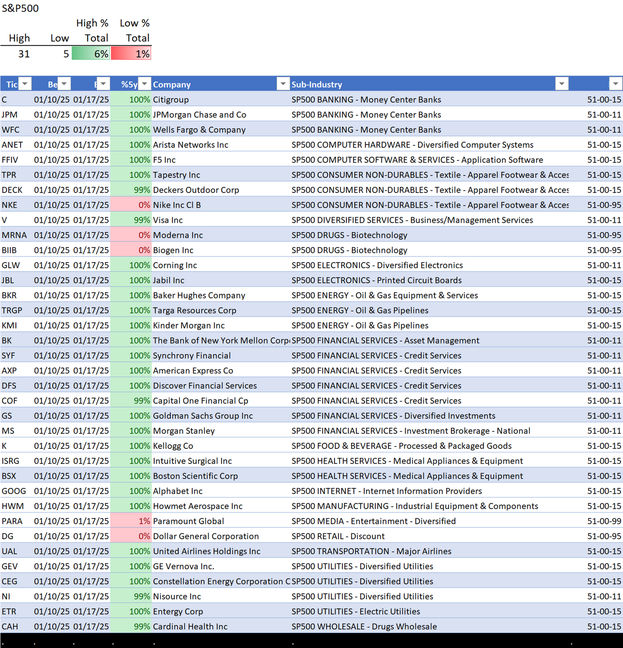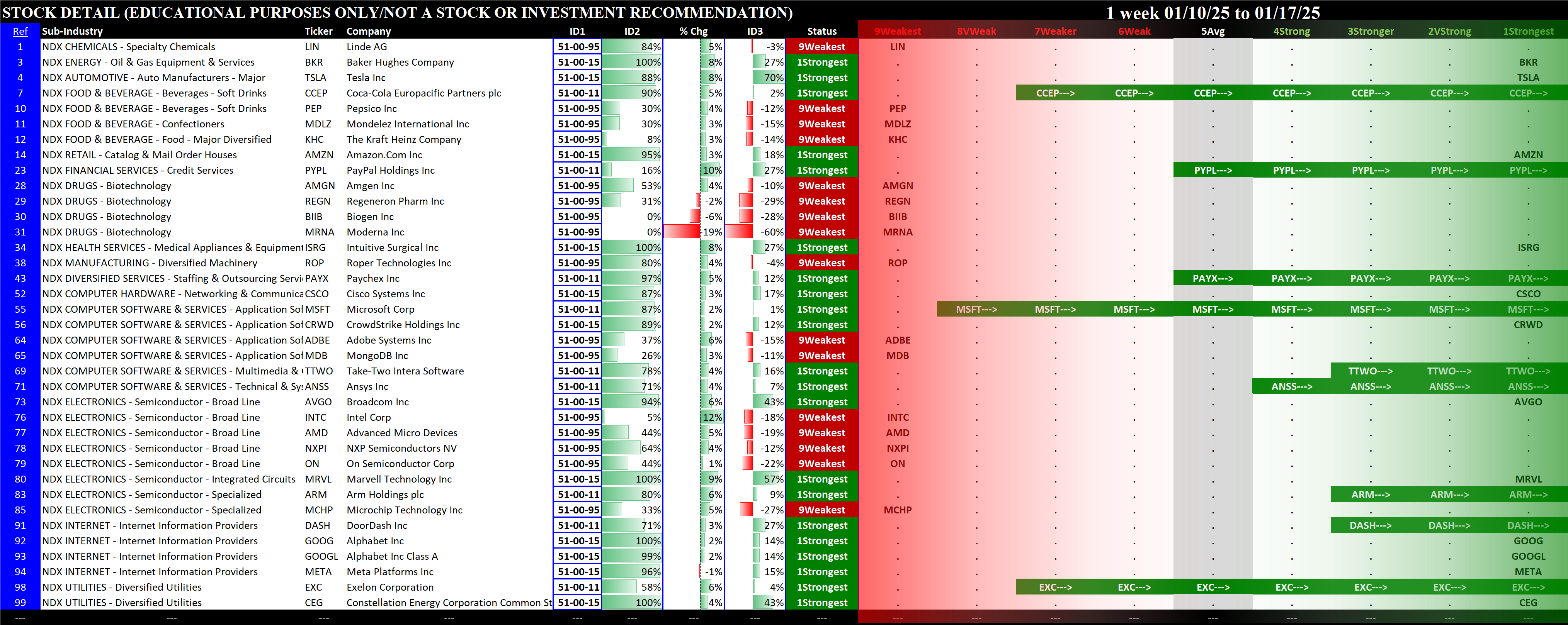This analysis provides a Stock Market Organizer summary view of the S&P 500 and Nasdaq 100 for the week ended Friday, 01/17/25. This means this is a stock-by-stock strength analysis of the component stocks for each index, aggregated upward in level to the sector and index levels.